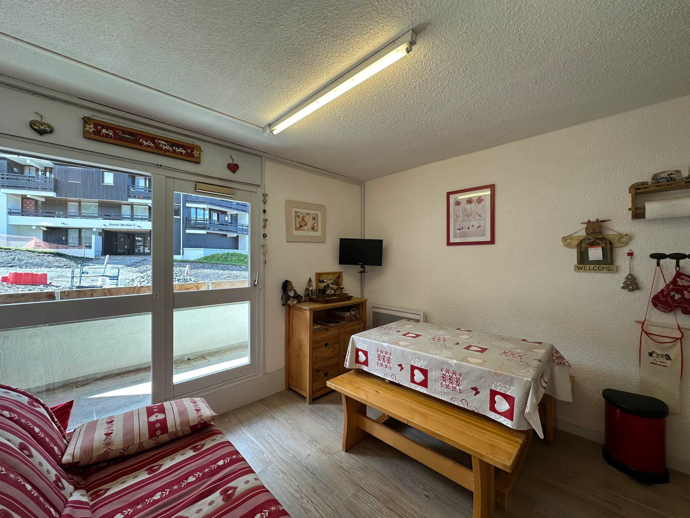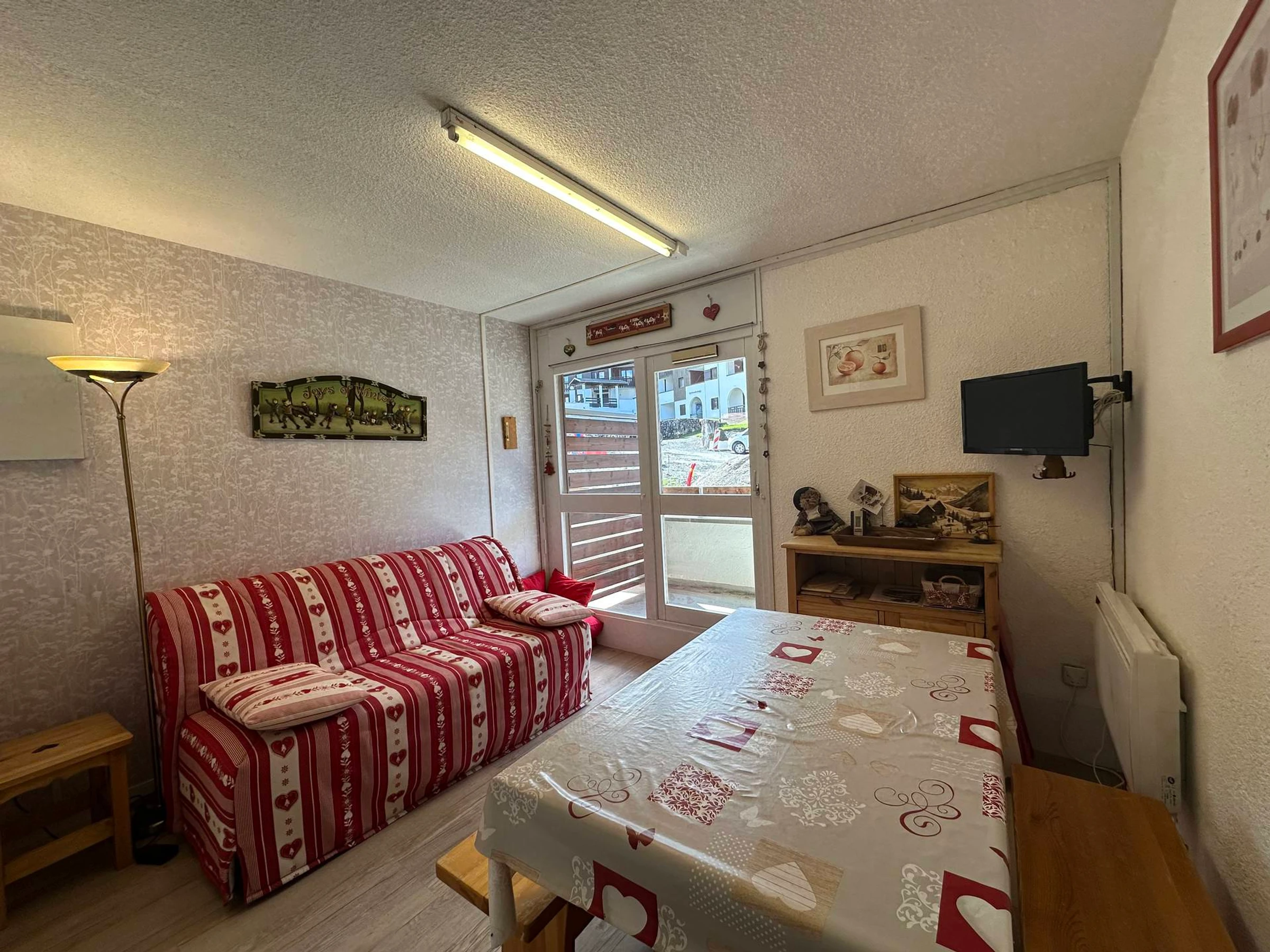 Celui-ci comprend une entrée avec un coin montagne non fermé, une salle de douche avec WC, le séjour est équipé d'un canapé 2 places, d'une télévision, et d'un coin cuisine équipé. Profitez également du balcon exposé à l'ouest.