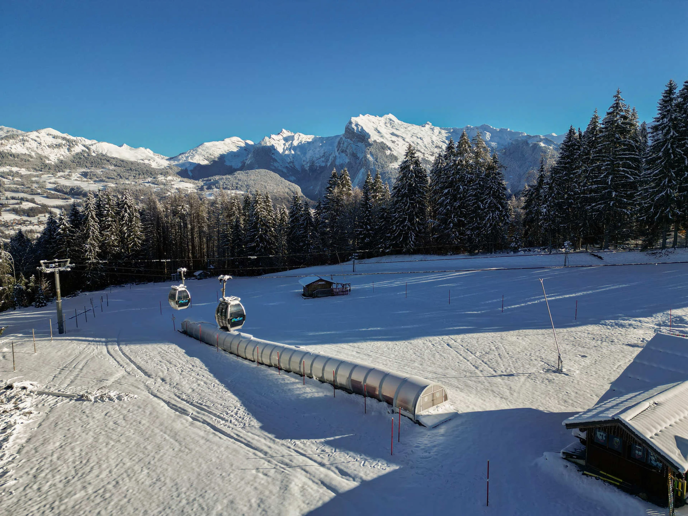 Particulièrement appréciée pour sa proximité immédiate du domaine débutant, elle permet un accès facile aux espaces dédiés aux skieurs novices. Le jardin d’enfants de l’école de ski est situé juste en contrebas de la résidence, un atout majeur pour les familles avec de jeunes enfants souhaitant profiter des premières glisses en toute sérénité.