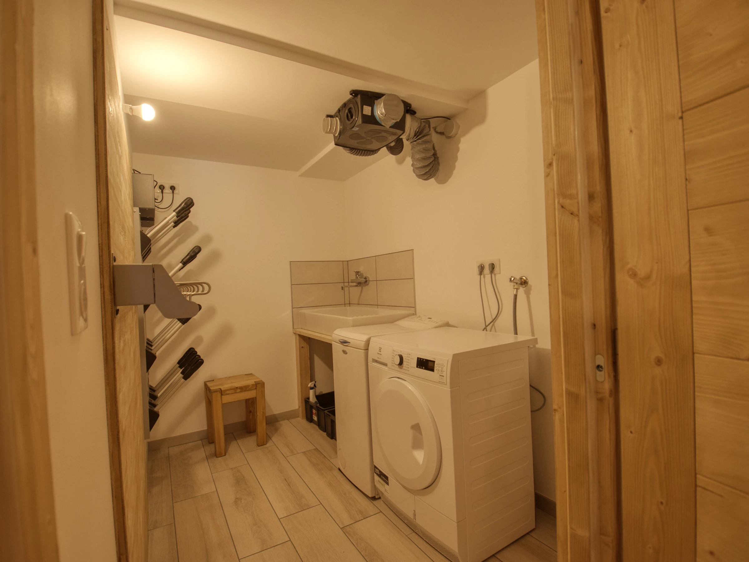 niveau -1: 2 chambres avec chacune un placard de rangement-1 sdd-1 wc- 1 casier à skis avec racks chauffants- 1 buanderie avec lave-linge -sèche - linge- 1 réfrigérateur, 1 escalier pour accéder au rdc comprenant: