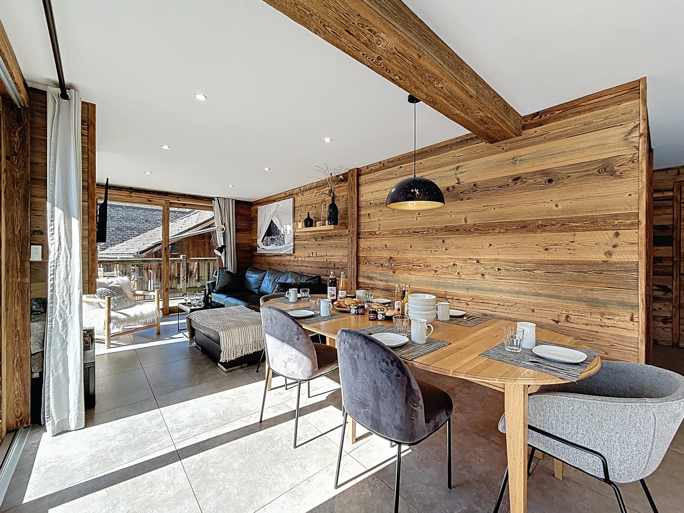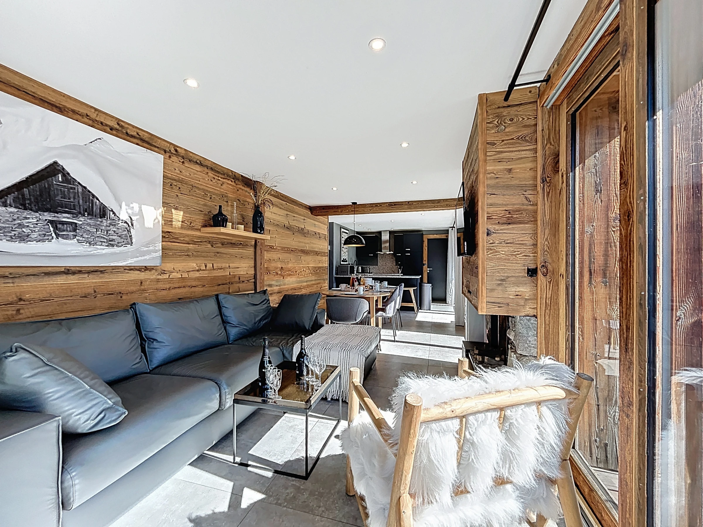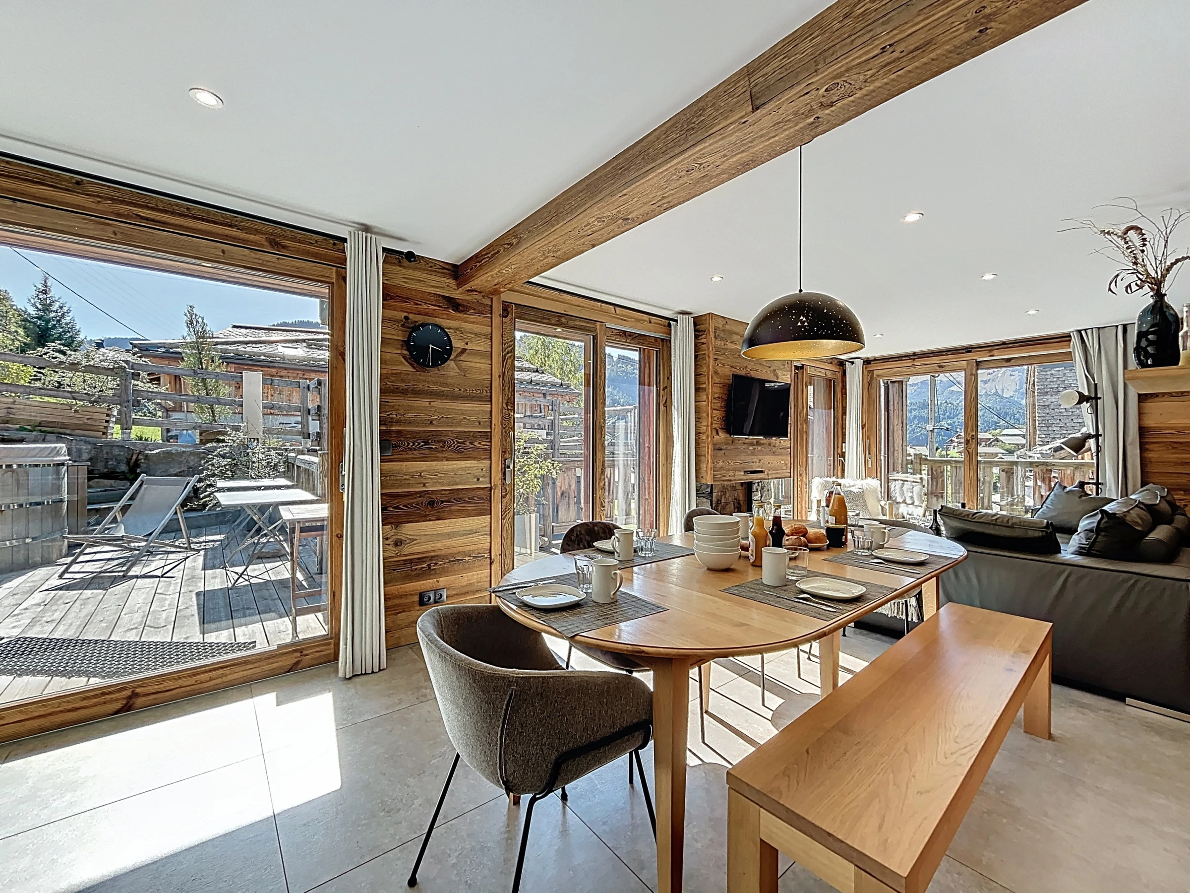 Sa grande terrasse orientée plein sud invite à la détente et se prolonge par un jacuzzi scandinave en bois, idéal pour savourer le grand air et la vue dégagée. À l’intérieur, un vaste séjour moderne et lumineux offre un cadre chaleureux pour partager un repas en famille ou entre amis, ou encore se relaxer au coin de la cheminée après une journée sur les pistes.