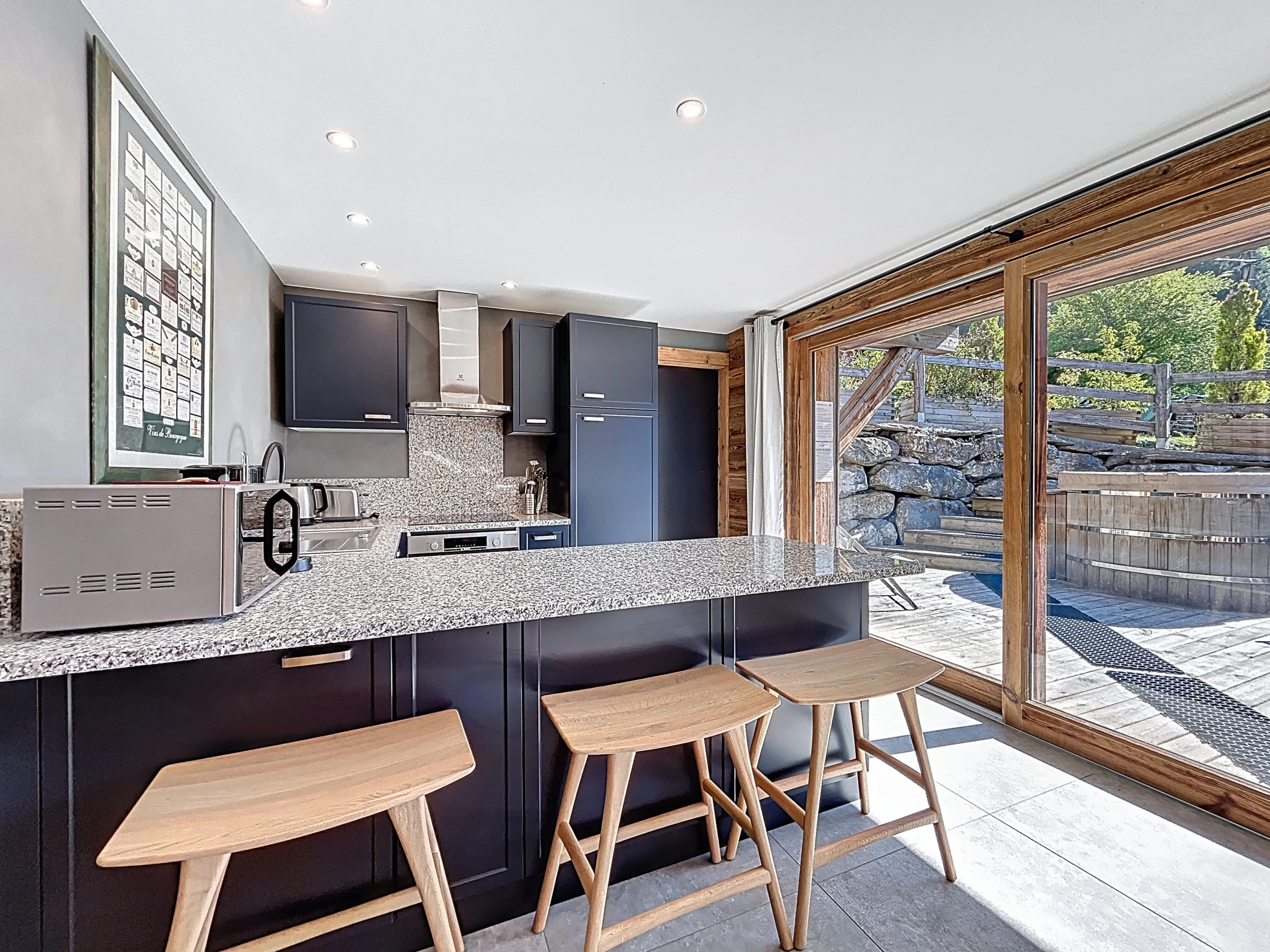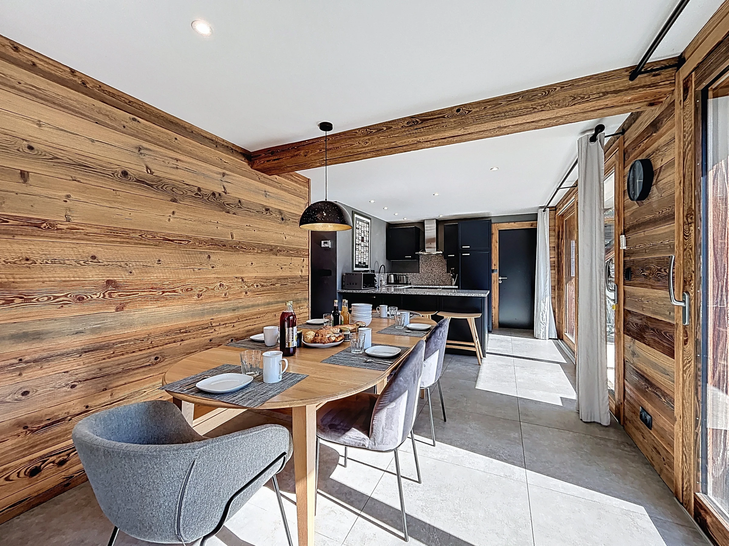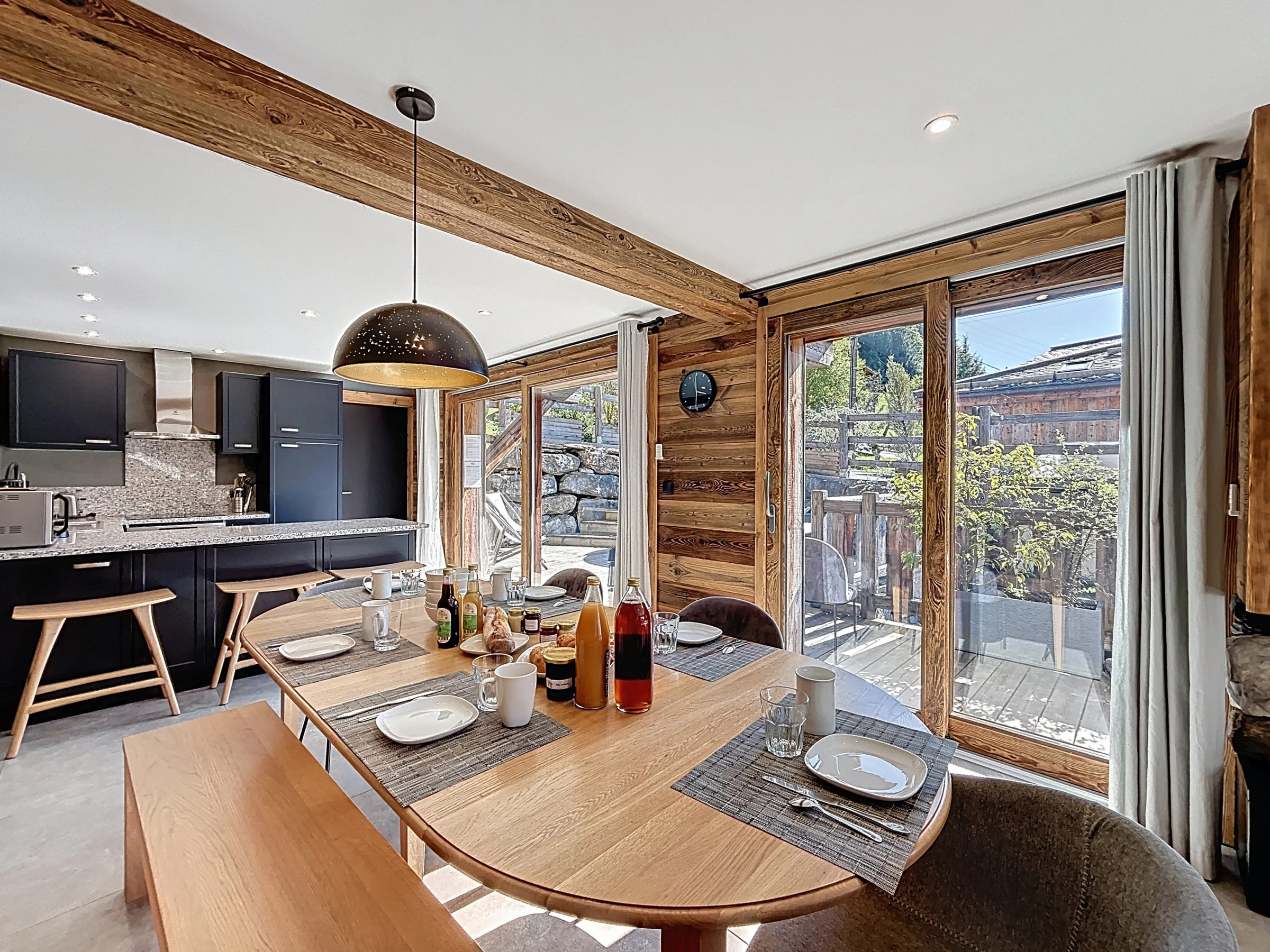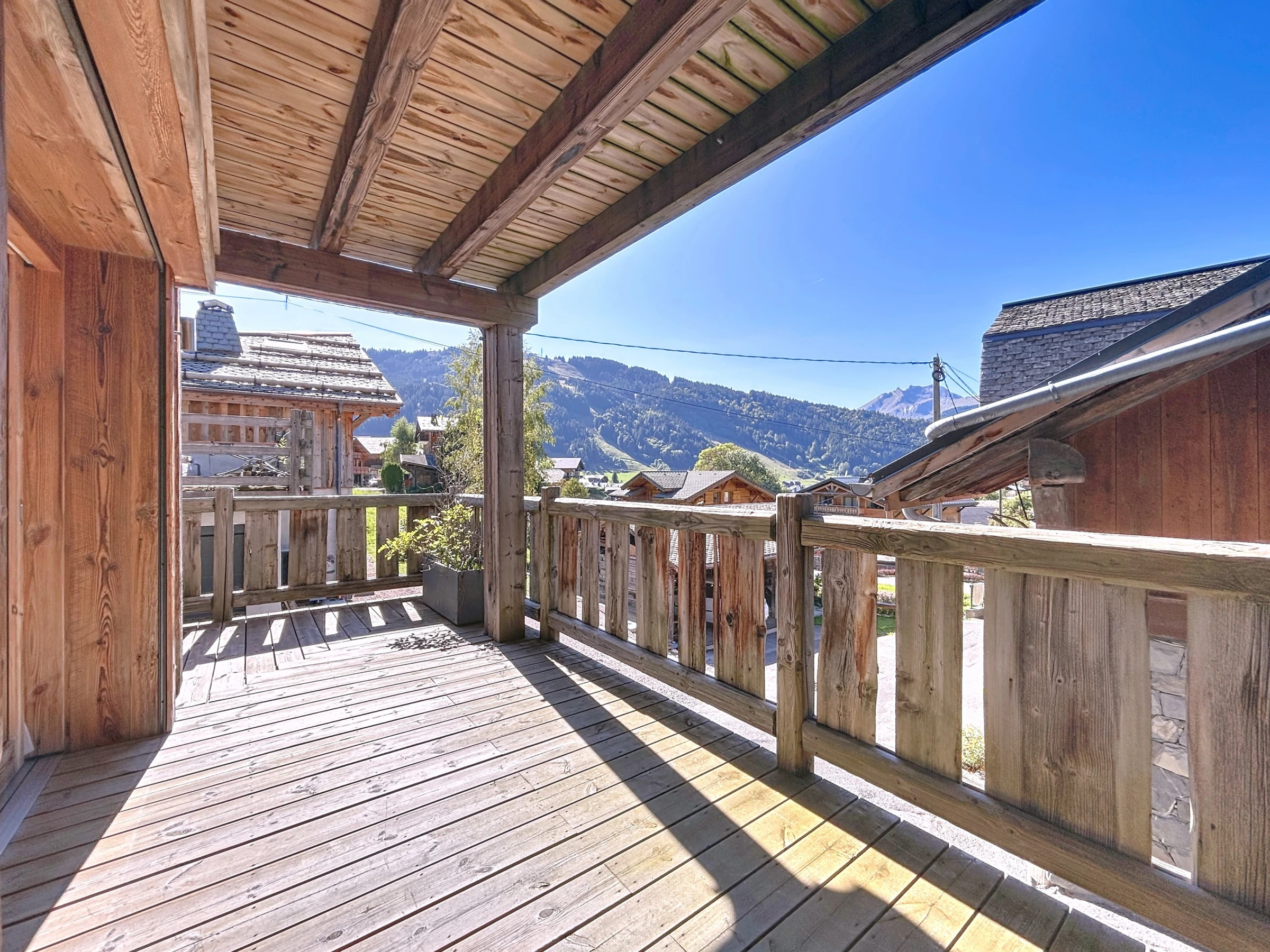 Sa grande terrasse orientée plein sud invite à la détente et se prolonge par un jacuzzi scandinave en bois, idéal pour savourer le grand air et la vue dégagée. À l’intérieur, un vaste séjour moderne et lumineux offre un cadre chaleureux pour partager un repas en famille ou entre amis, ou encore se relaxer au coin de la cheminée après une journée sur les pistes.