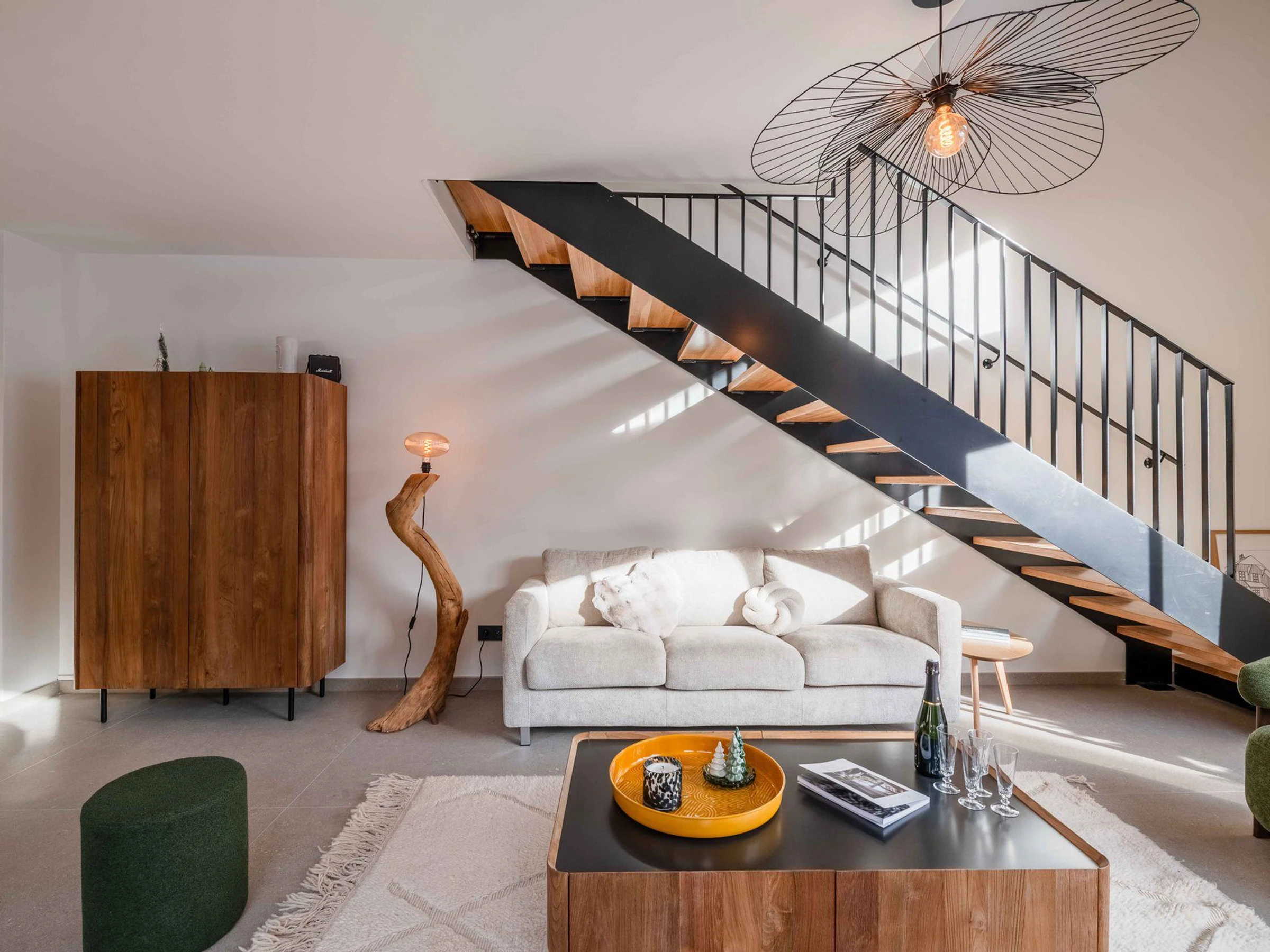- Séjour comprenant un canapé, un ensemble de fauteuils modernes et une TV avec accès balcon/terrasse