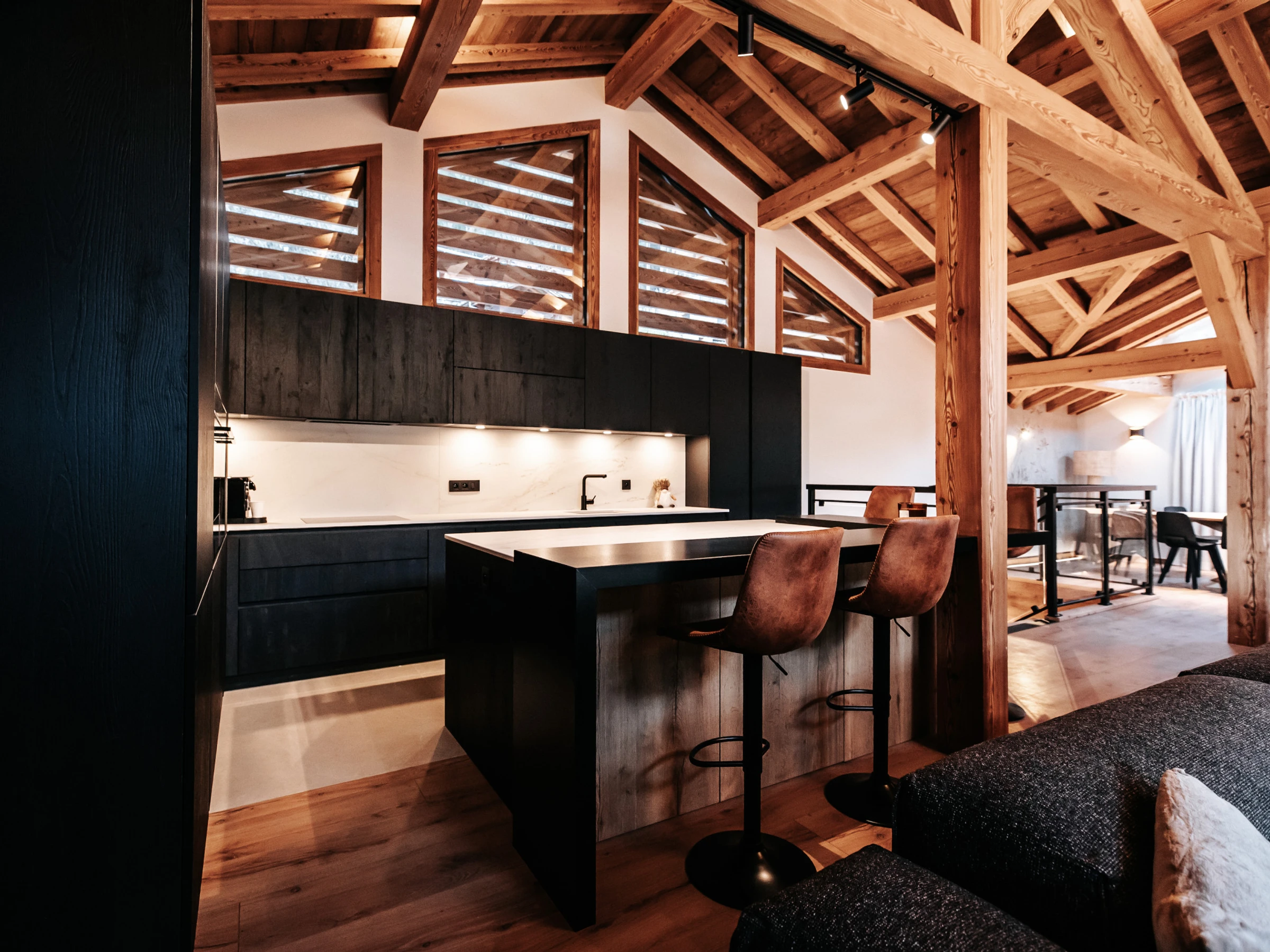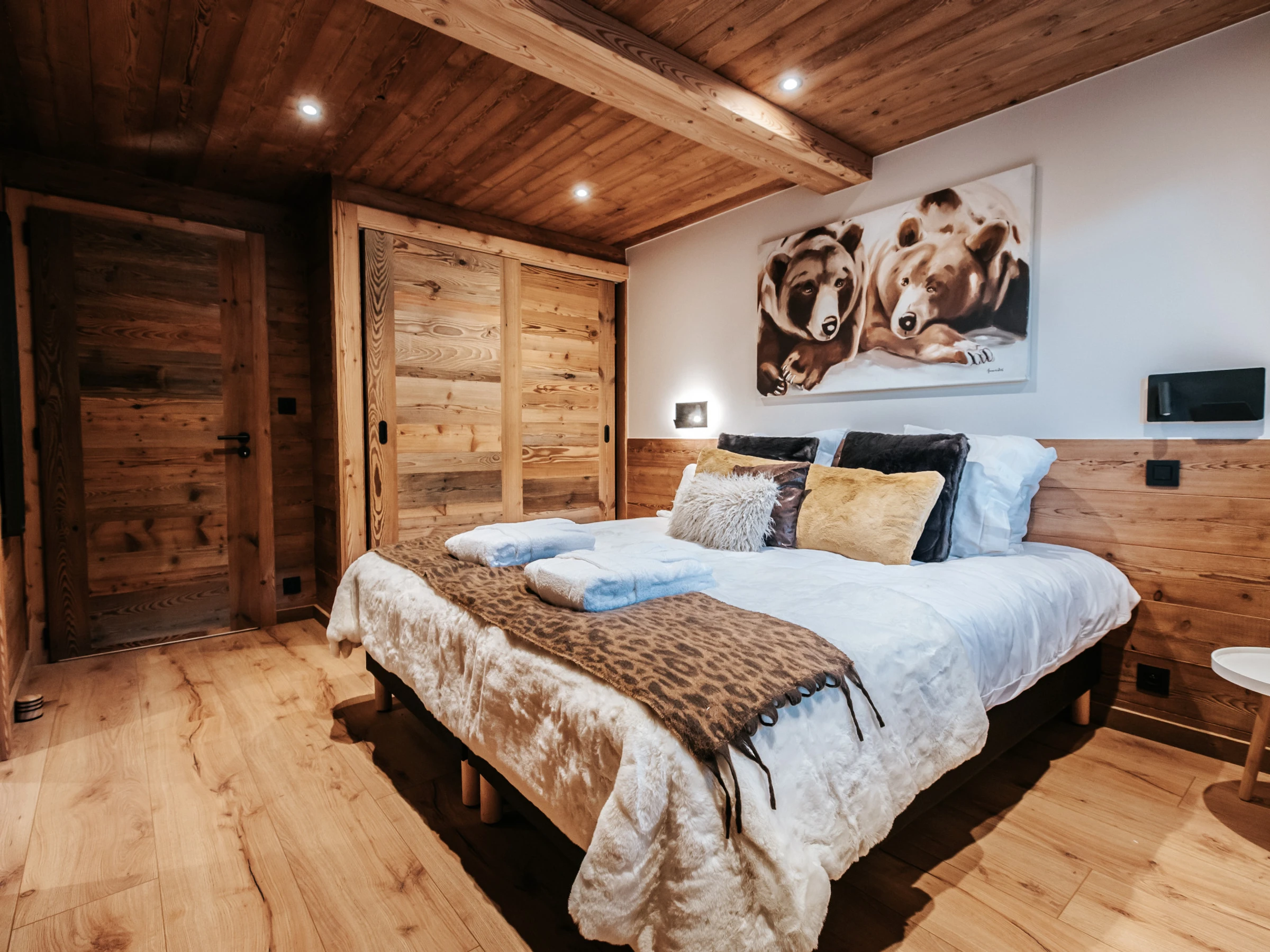 Le chalet peut accueillir jusqu’à 10 personnes grâce à ses cinq chambres en suite, dont quatre situées au premier étage et une au dernier niveau, à proximité des espaces de vie. Le dernier étage accueille une pièce de vie lumineuse réunissant salon, salle à manger et cuisine équipée. Le salon est doté d’une cheminée à insert, apportant une atmosphère chaleureuse après une journée en montagne, et s’ouvre sur une terrasse extérieure aménagée avec un jacuzzi professionnel à débordement et un sauna, pensés pour les moments de détente.