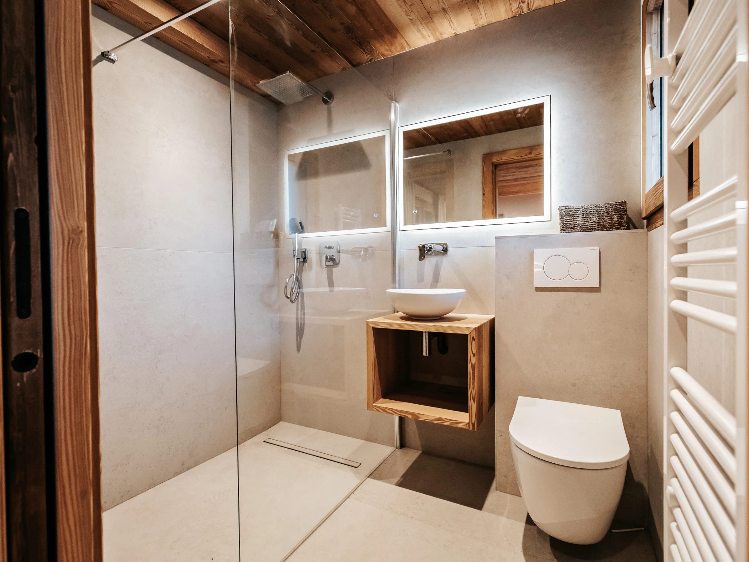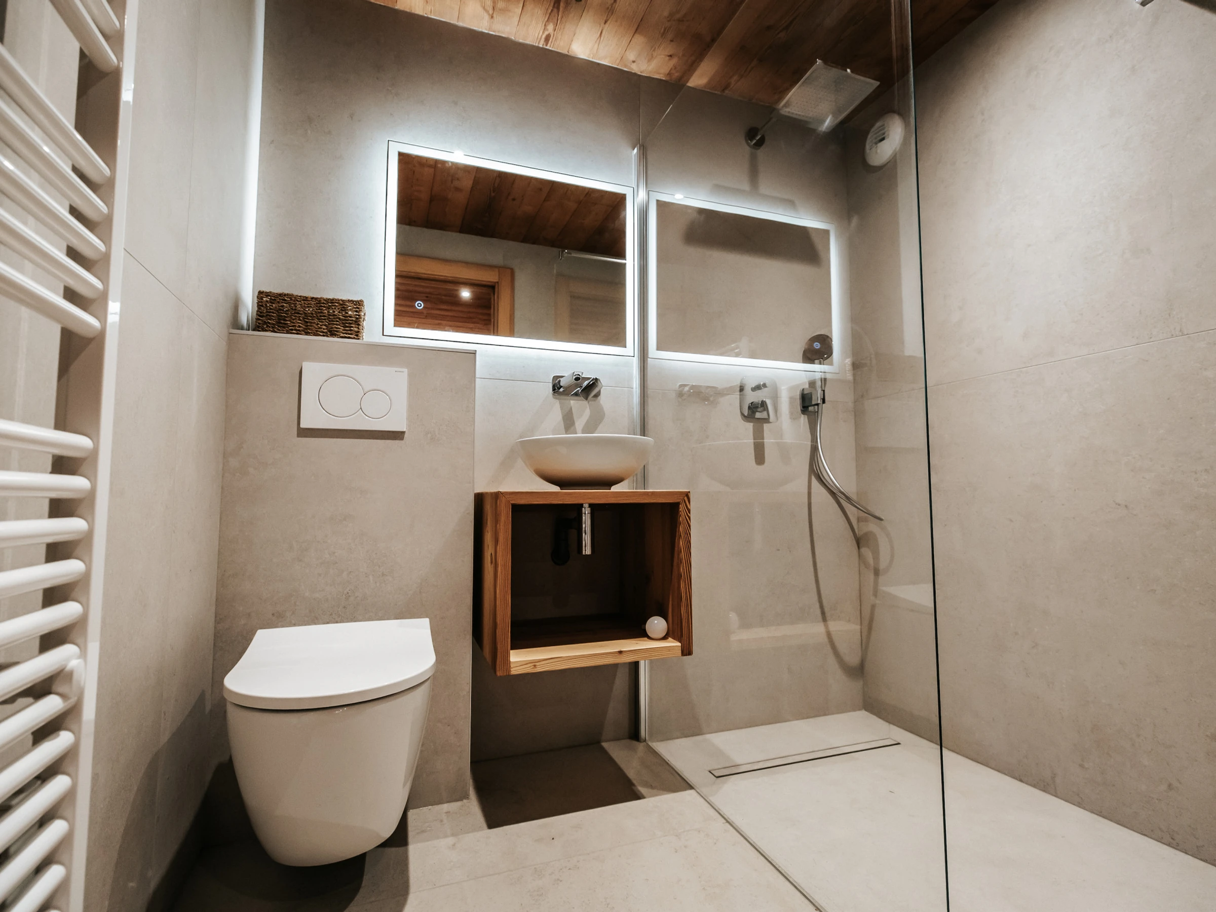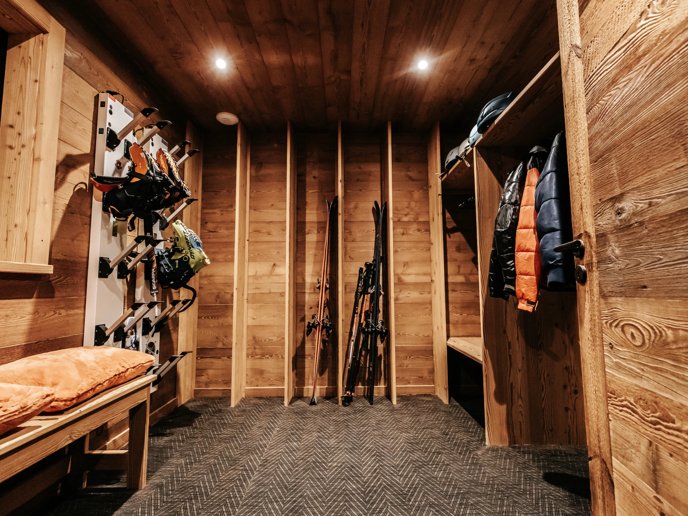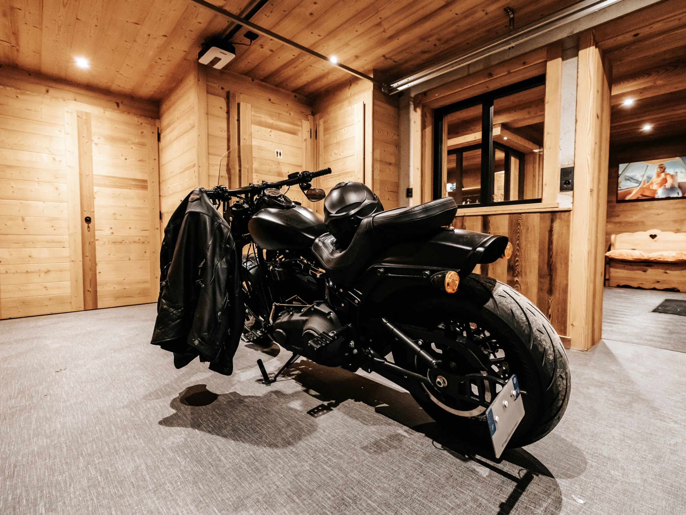 Dès l’entrée, le chalet dispose d’un casier à skis avec sèche-chaussures, facilitant le retour des pistes. Un garage fermé pour une voiture, complété par un garage couvert permettant d’accueillir jusqu’à trois motos, vient parfaire les prestations pratiques du bien.