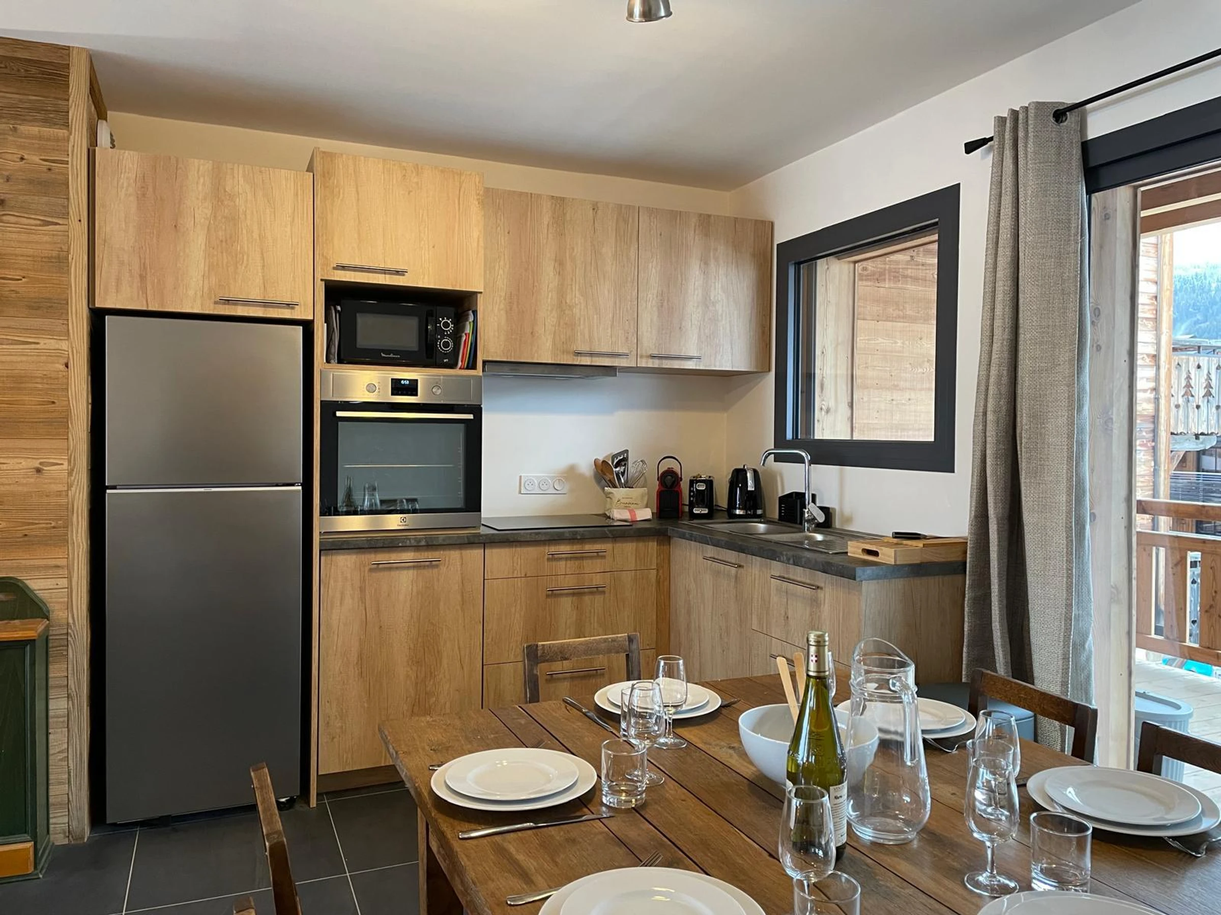 - Cuisine ouverte entièrement équipée avec espace repas et accès balcon