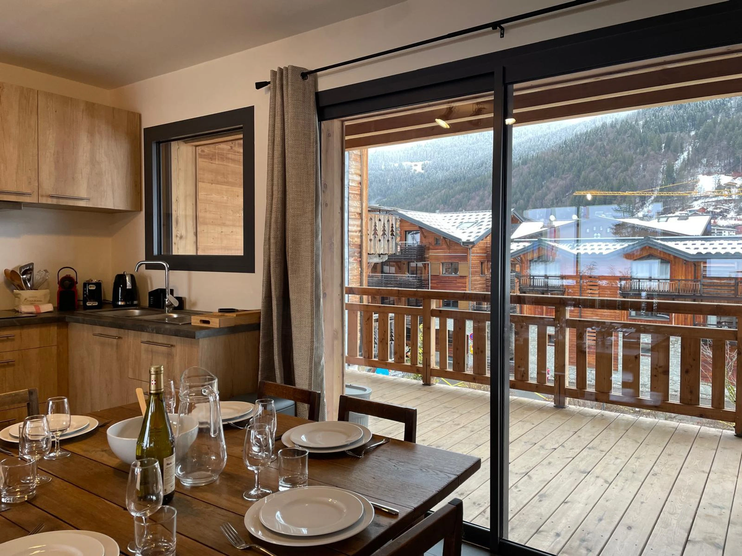 La pièce de vie, lumineuse et accueillante, avec cuisine entièrement équipée, s’ouvre sur un balcon offrant une magnifique vue sur la montagne.