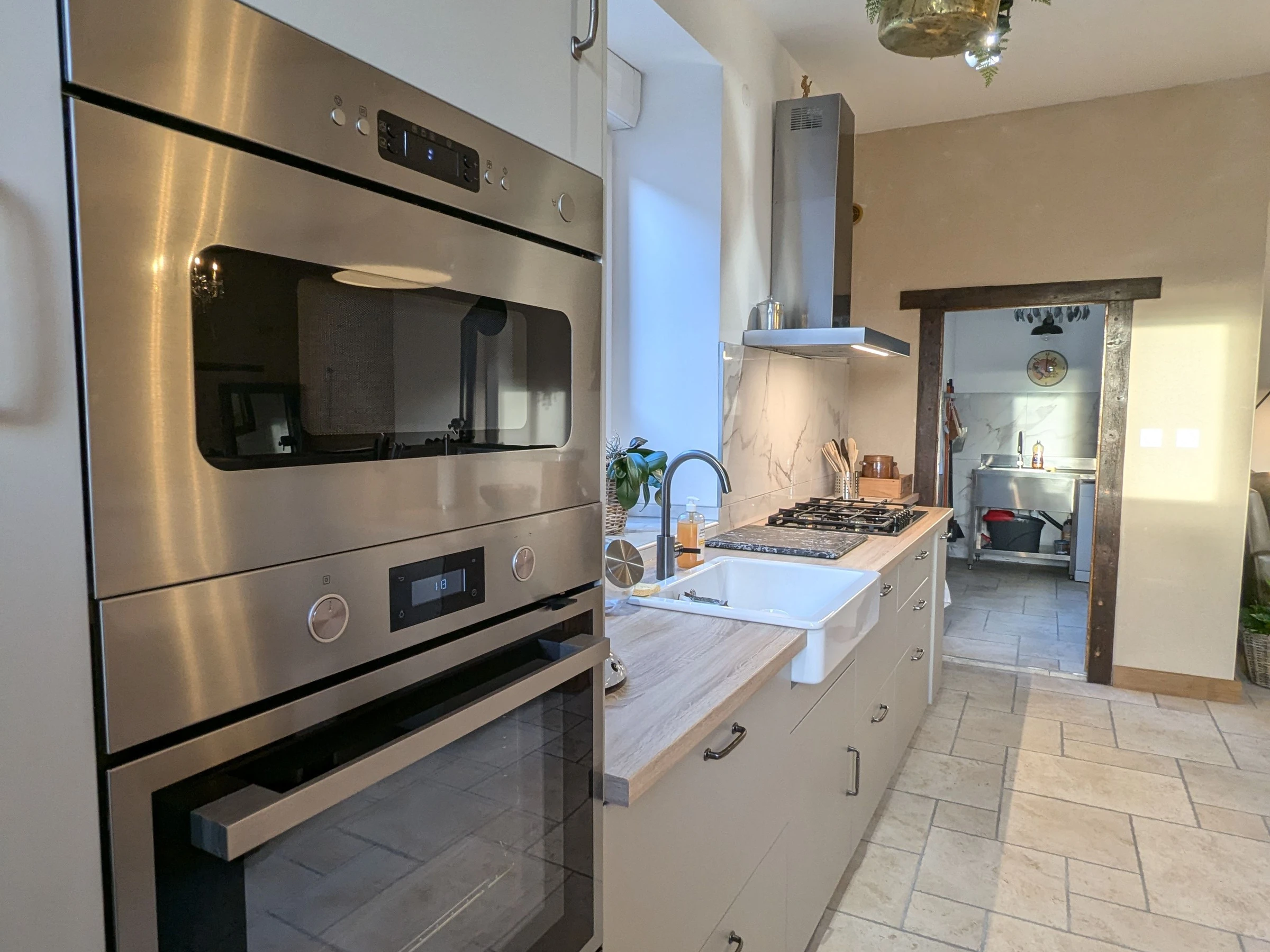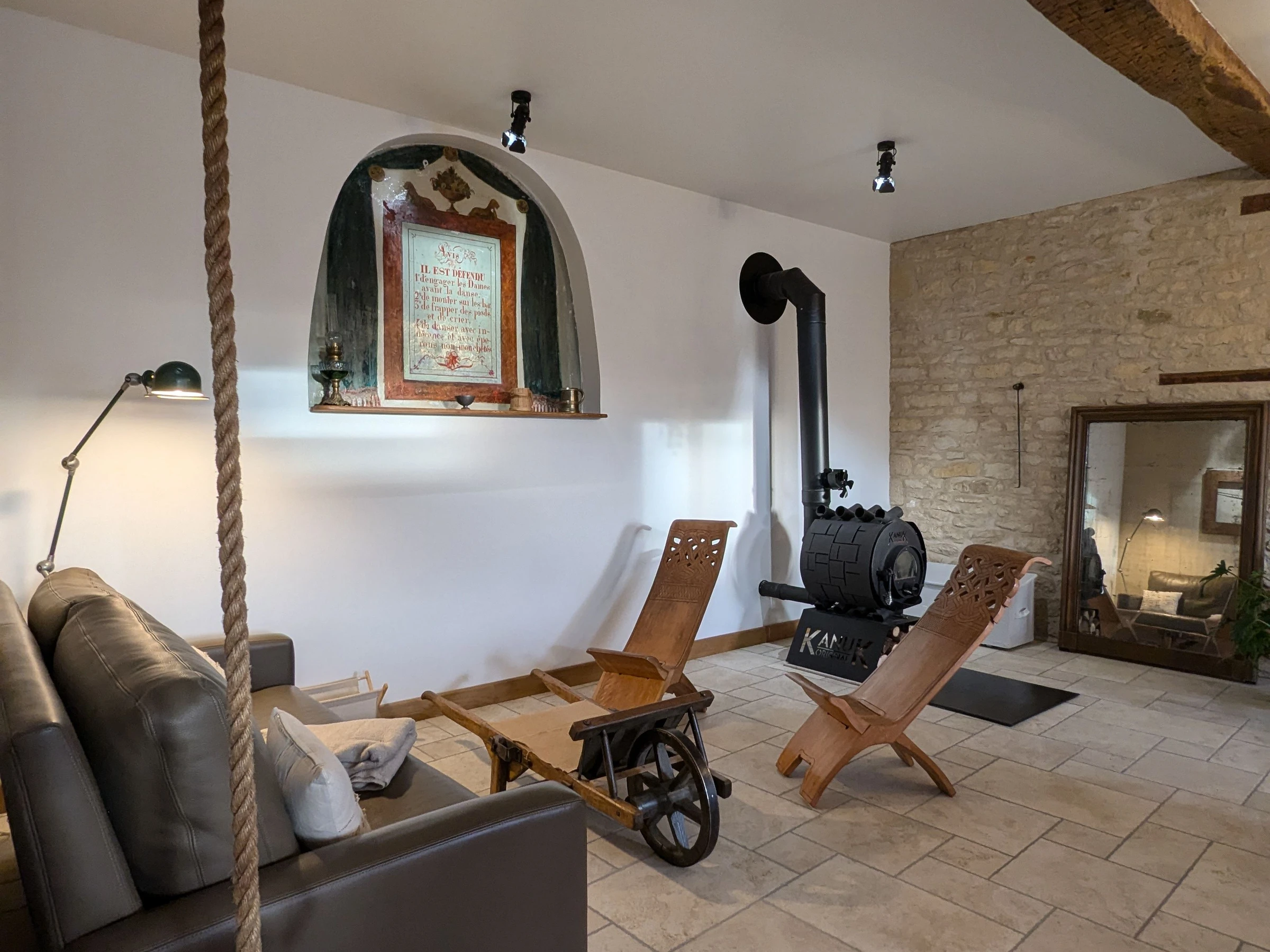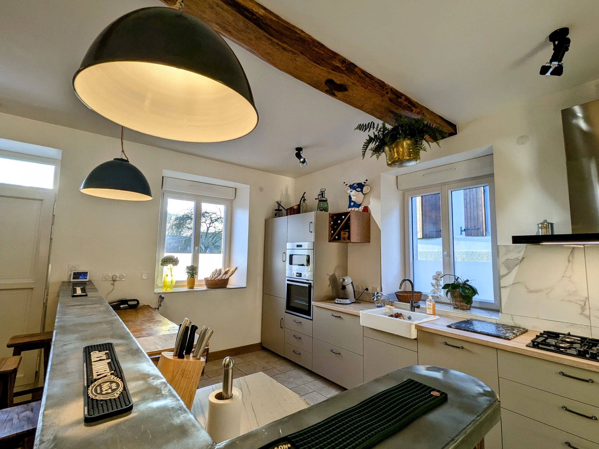 La pièce maîtresse de la maison est sans doute la grande pièce à vivre, lumineuse et spacieuse, avec ses poutres apparentes et son poêle à bois atypique. Cet espace invite à la convivialité autour du bar en zinc et de la grande table pouvant accueillir jusqu'à 12 convives. La cuisine moderne et entièrement équipée facilite la préparation de repas gourmands.