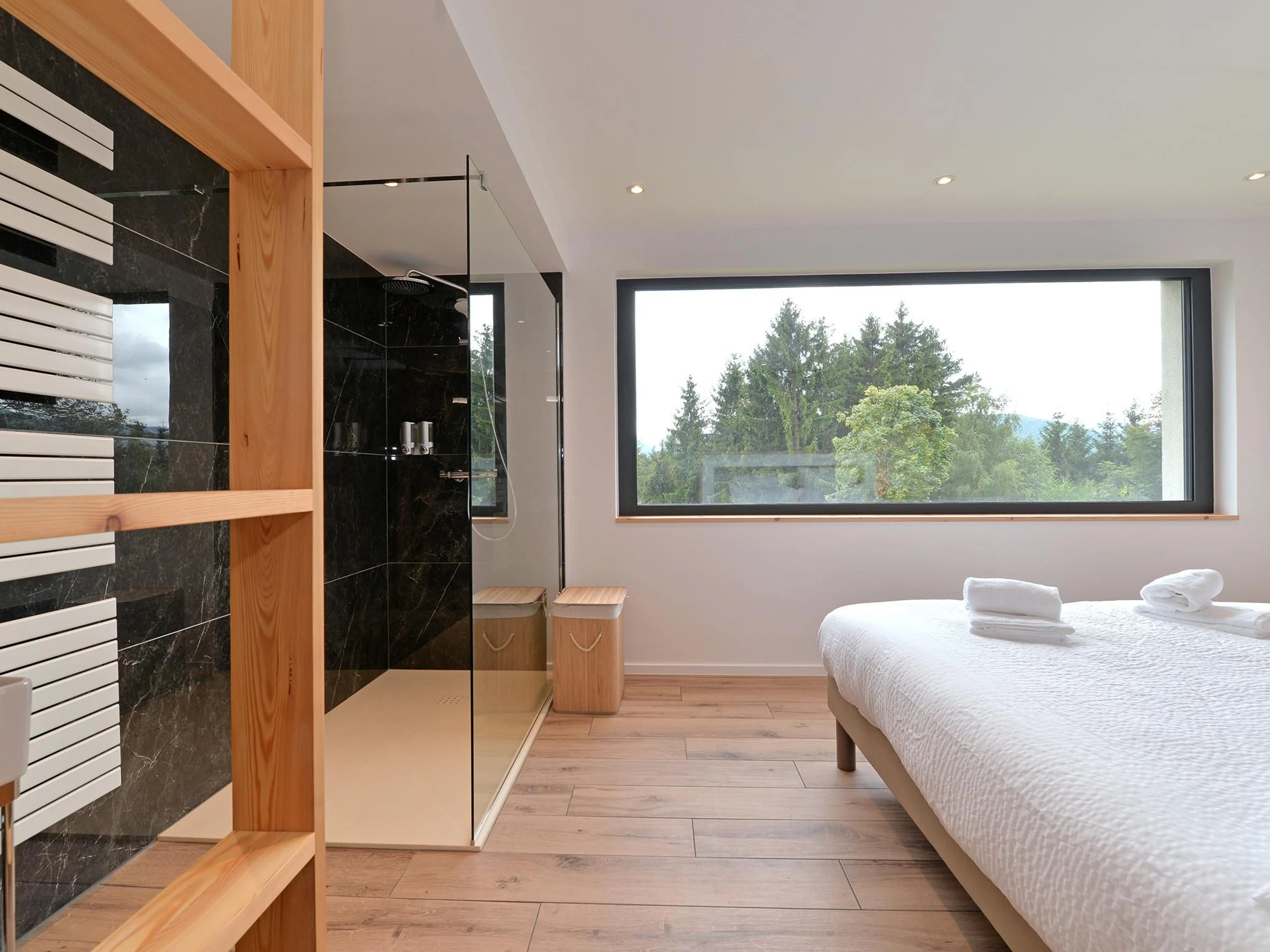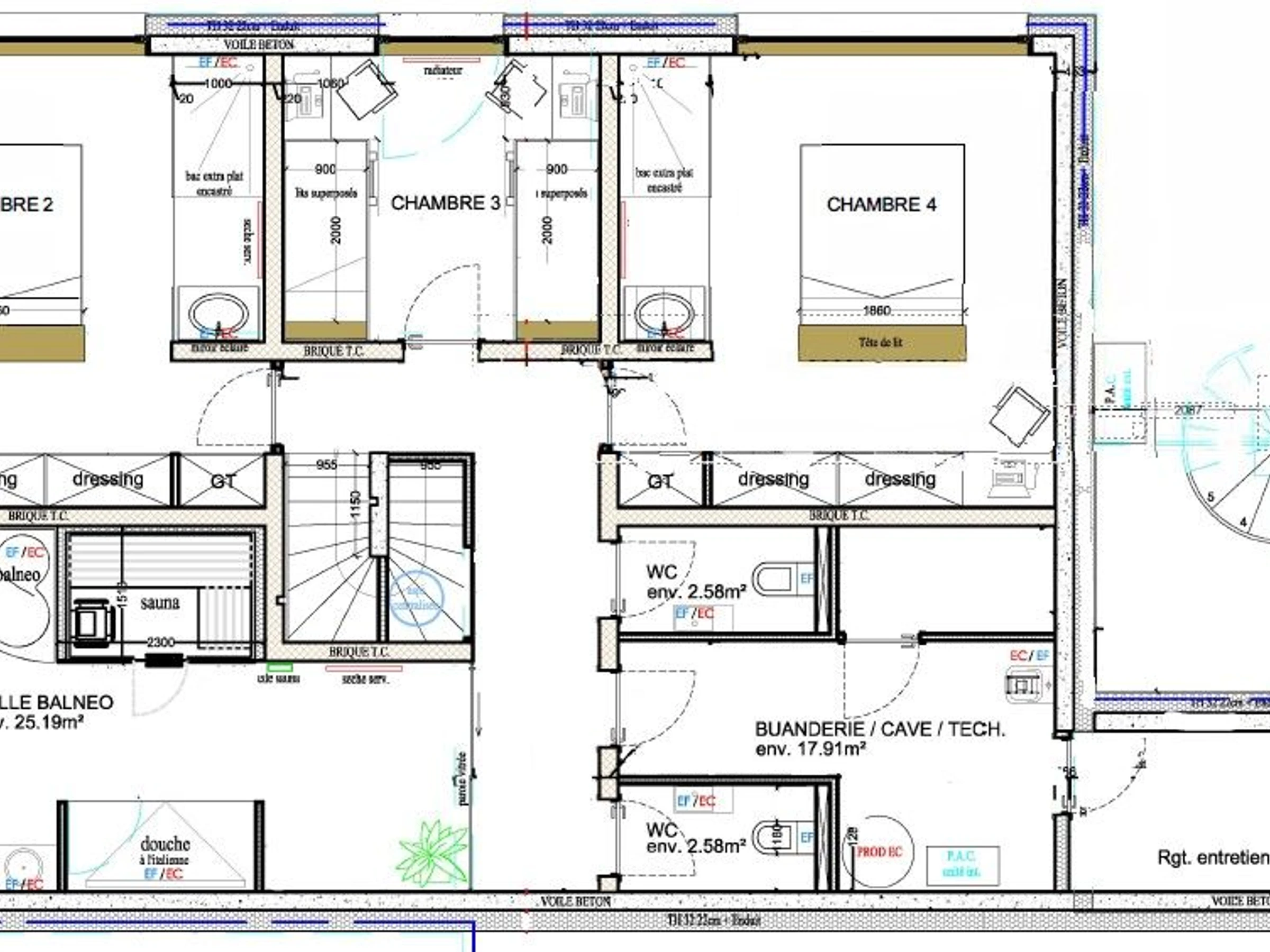 Au niveau inférieur, 3 chambres ainsi que l'espace bien-être composé d'un sauna, tapis de course incurvé, baignoire d'angle et douche à l'italienne. 2 chambres dispose d'un lit double 160x200 et espace douche et lavabo ouvert sur la chambre. La 3ème chambre comprend 2 lits superposés pour 4 couchages de 90x190. 2 WC indépendants.