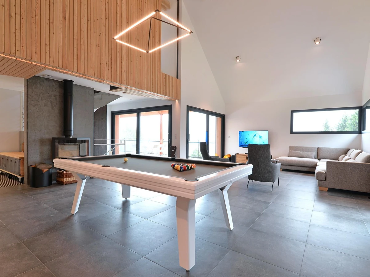 Il se compose : d'une grande pièce à vivre avec salon, billard, cheminée avec bois fourni gratuitement, grande TV connectée avec enceinte Bluetooth, cuisine ouverte entièrement équipée (cave à vin, électroménager haut de gamme, machine à café à grain et à filtre) et son coin repas. La cuisine a été conçue pour être accessible en fauteuil roulant. A ce niveau également, une chambre accessible PMR avec un grand lit double 160*200cm et salle d'eau privative avec WC. Cette chambre dispose d'un accès direct à la terrasse ainsi que d'une très belle vue sur la vallée.