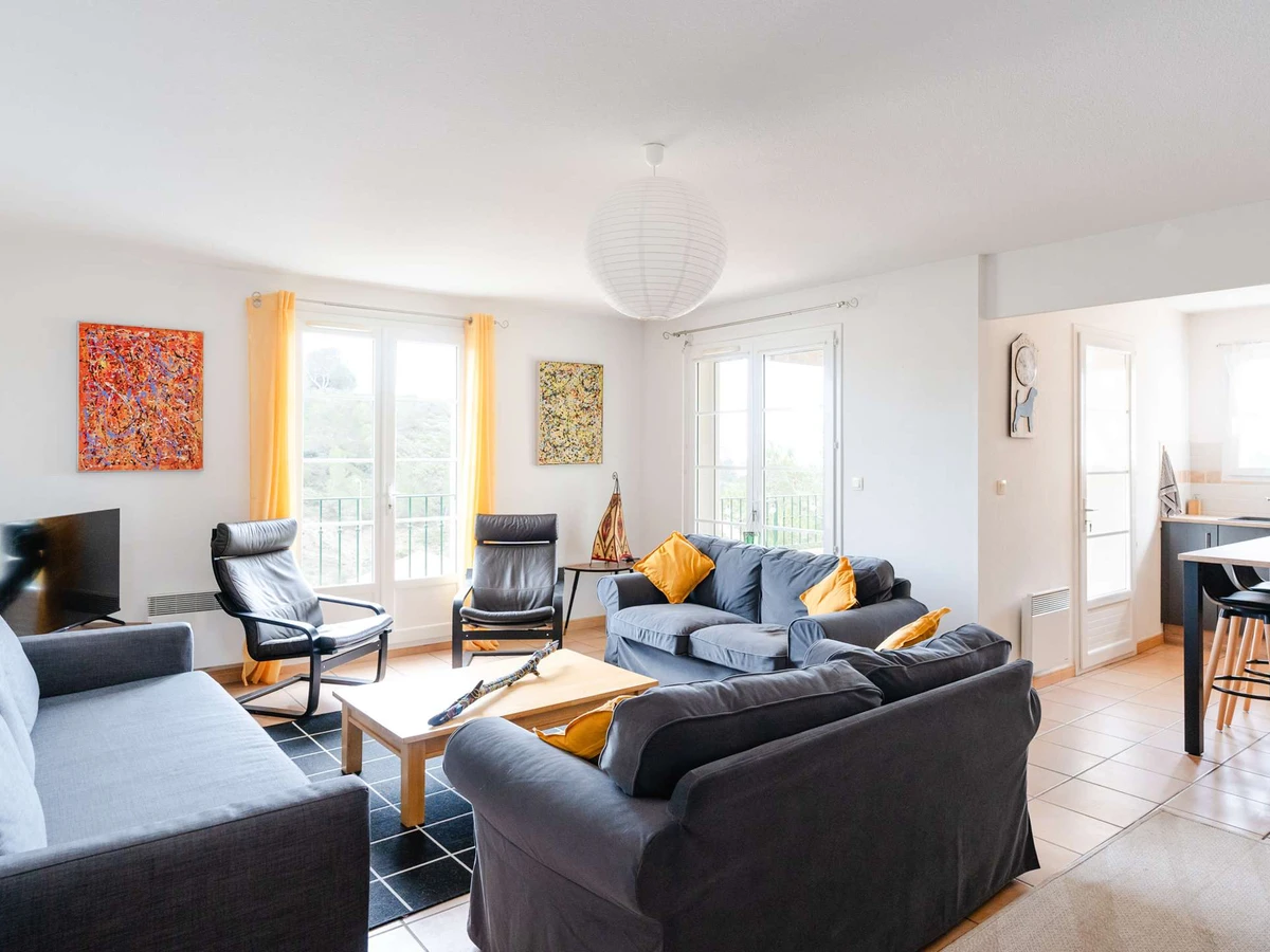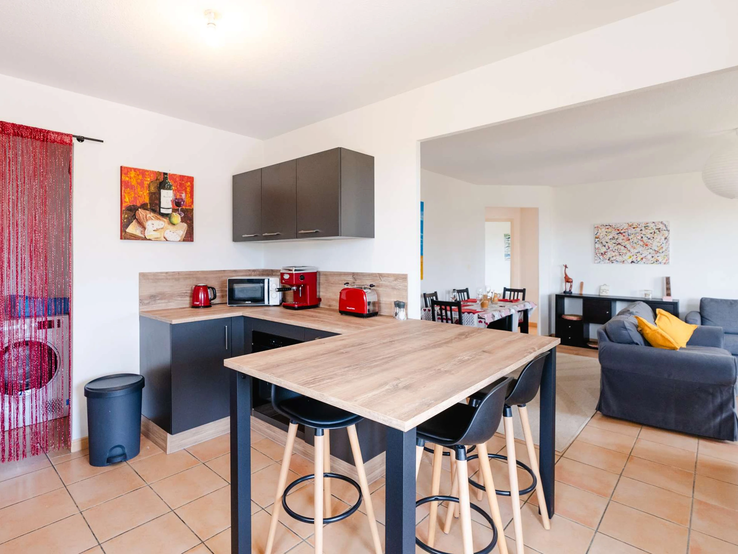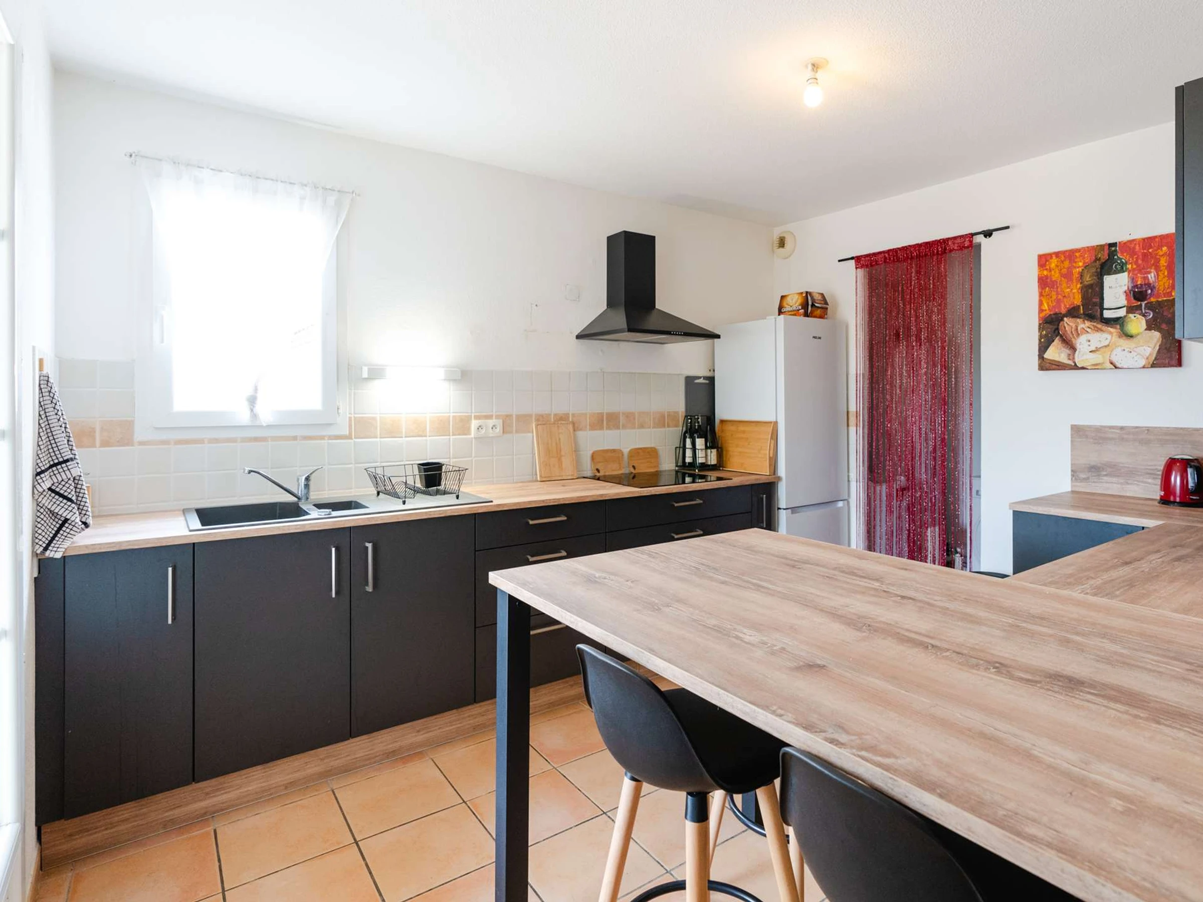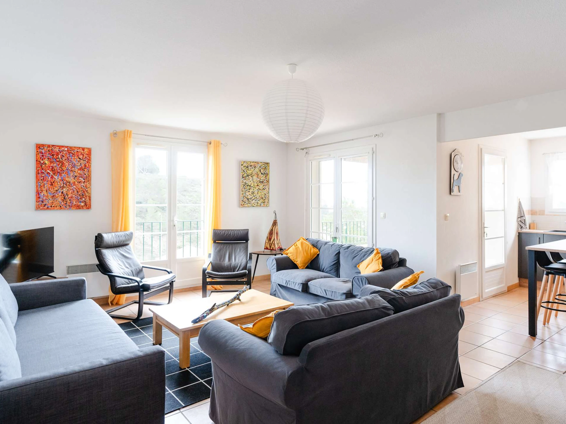 Entrée avec placard et WC séparés. Grand espace salon avec 3 canapés, table basse et TV connectée. La cuisine moderne avec breakfast bar est équipée d'une plaque induction 4 feux avec hotte aspirante, cafetière à dosettes Senseo, four, micro-ondes, lave-linge, sèche linge, réfrigérateur avec compartiment congélateur.