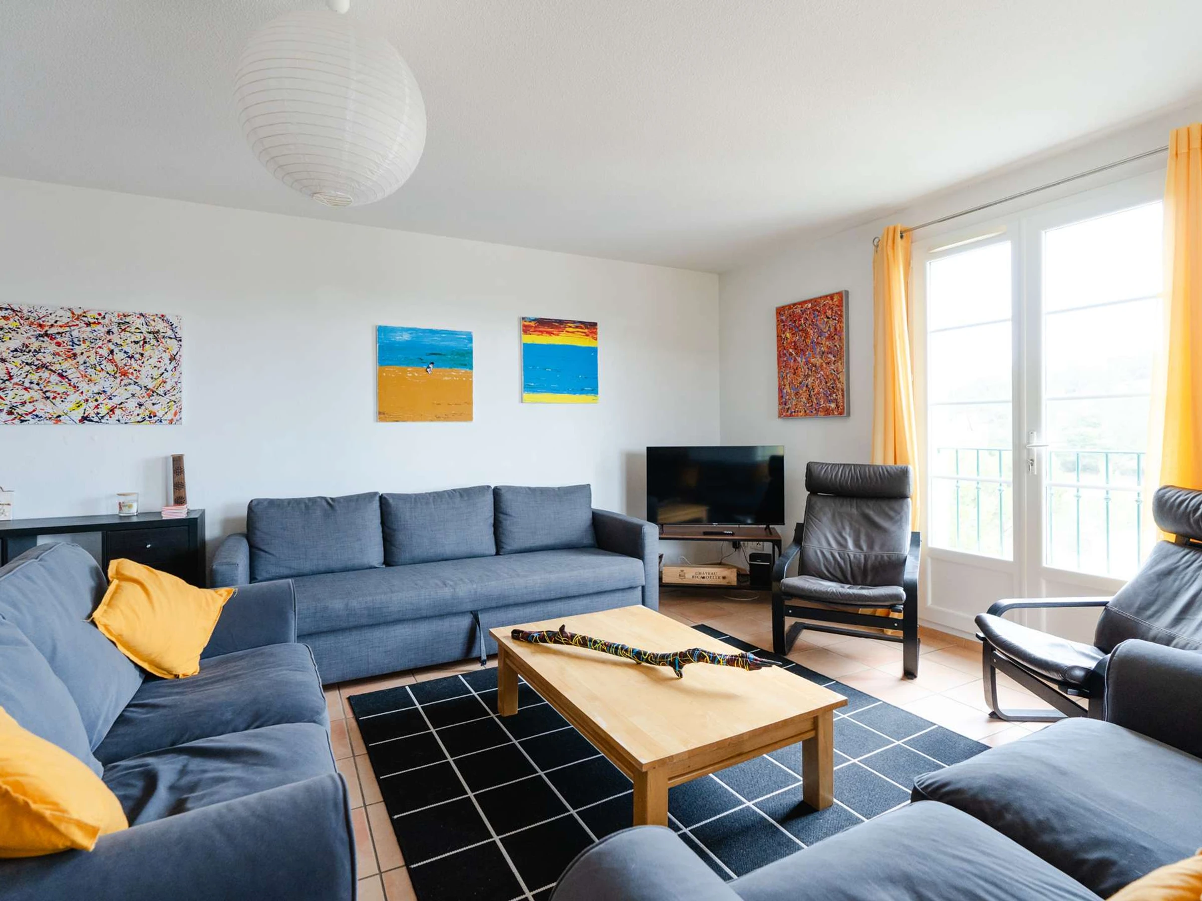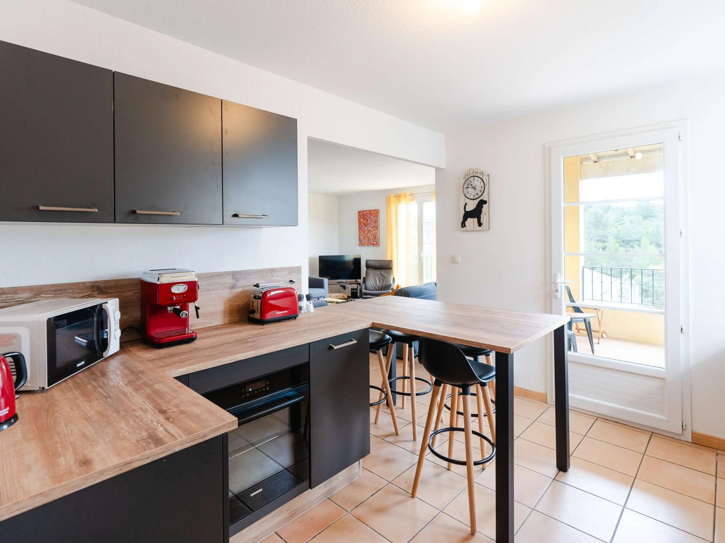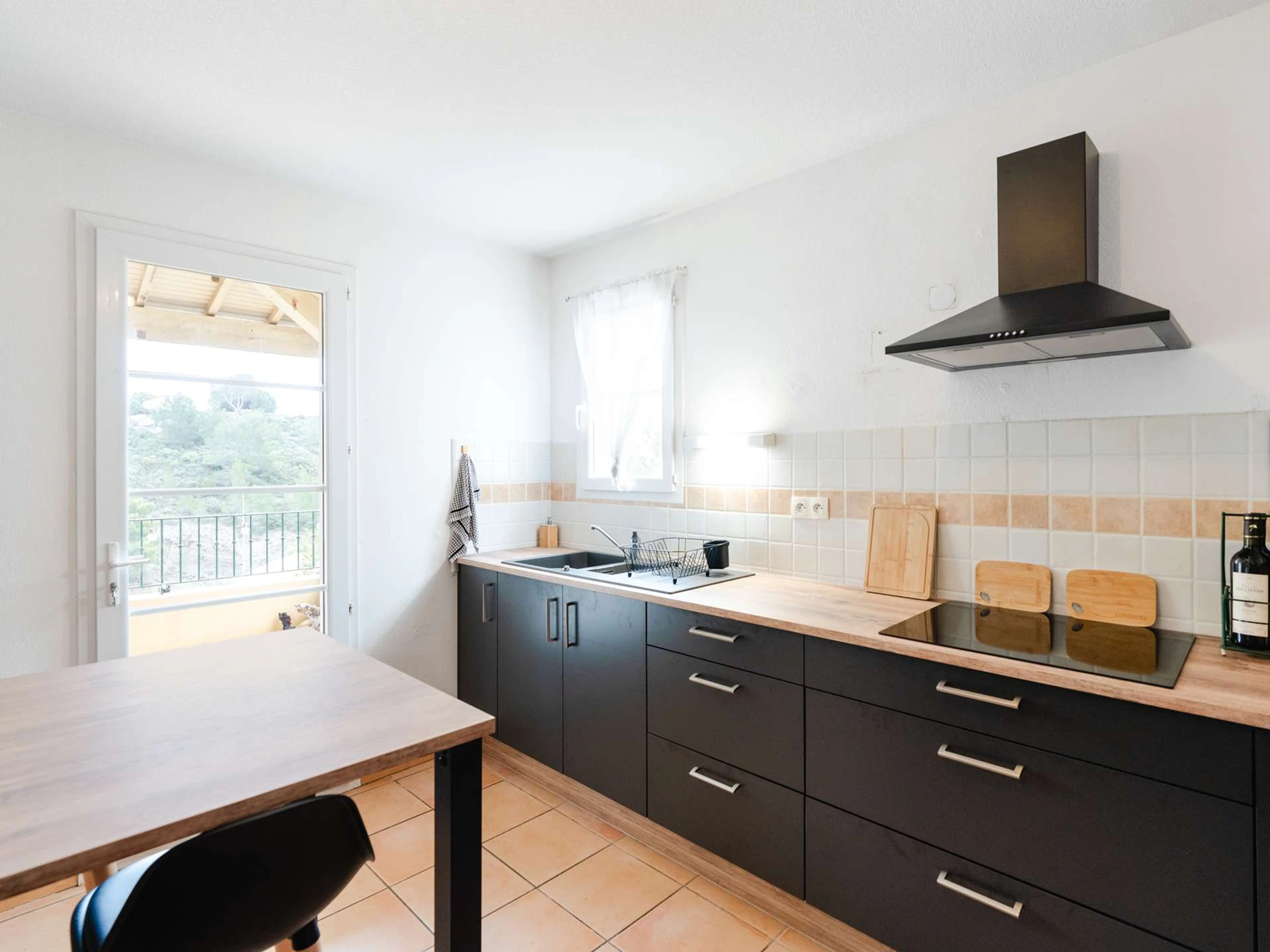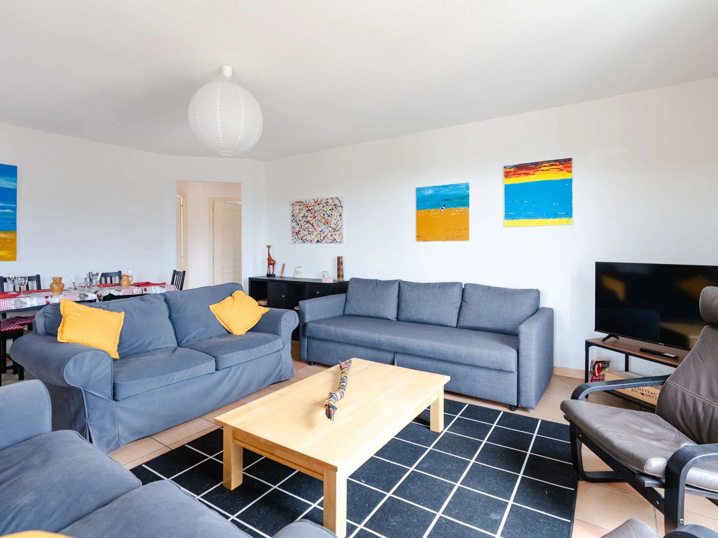 Entrée avec placard et WC séparés. Grand espace salon avec 3 canapés, table basse et TV connectée. La cuisine moderne avec breakfast bar est équipée d'une plaque induction 4 feux avec hotte aspirante, cafetière à dosettes Senseo, four, micro-ondes, lave-linge, sèche linge, réfrigérateur avec compartiment congélateur.