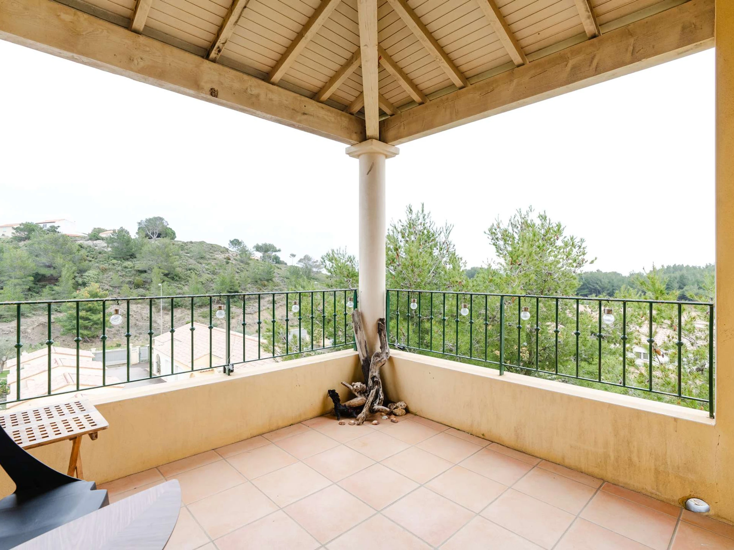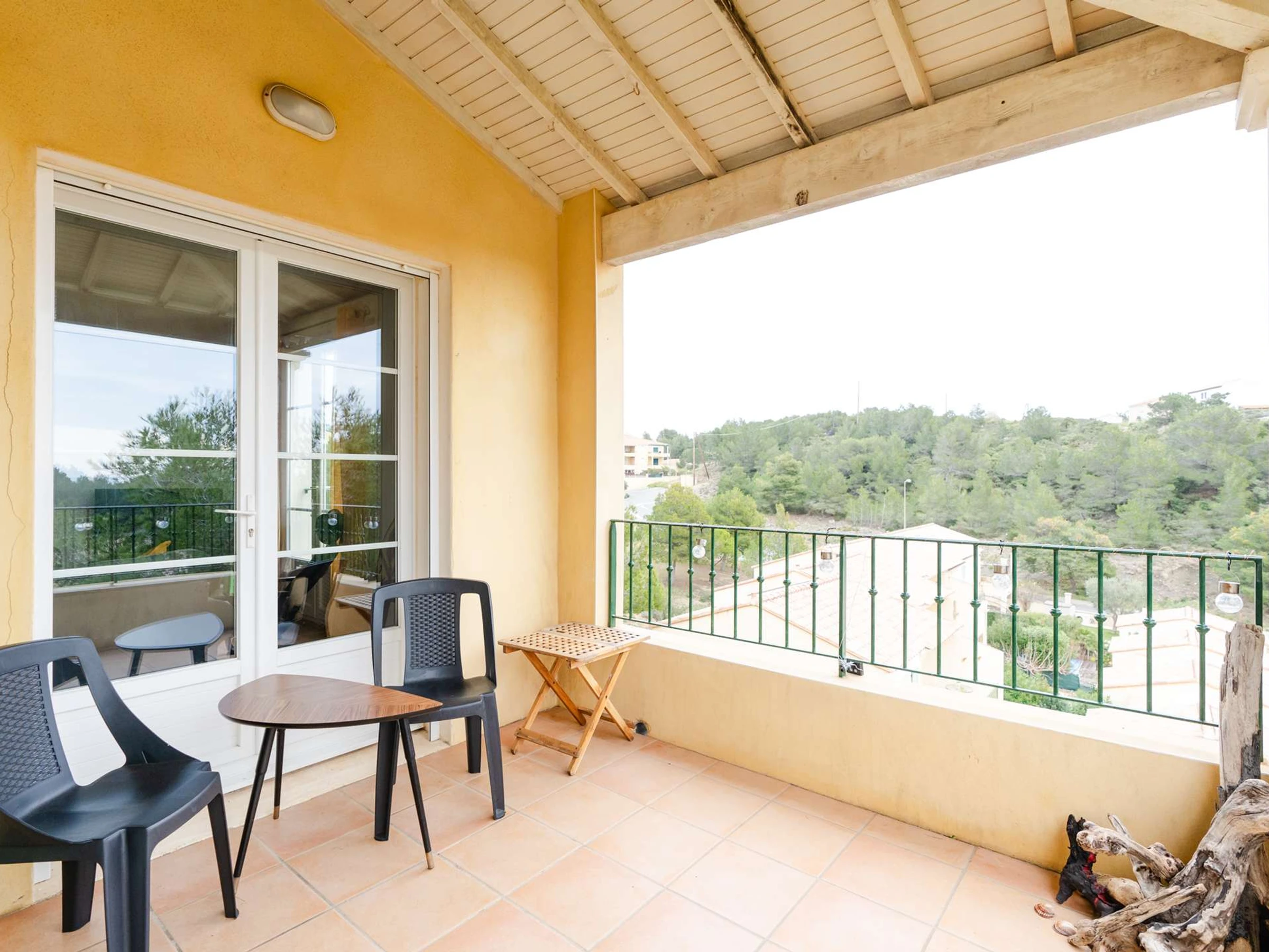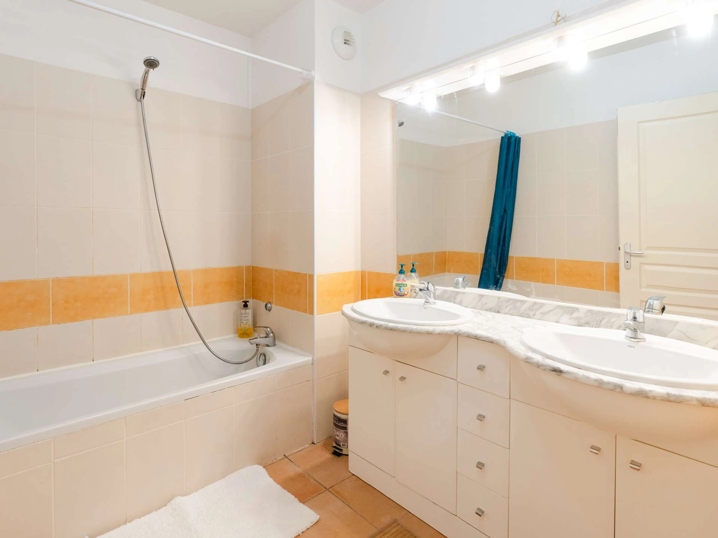 La salle de bains avec baignoire, meuble double vasque. Un balcon de 9 m² exposé sud-est avec vue sur la pinède environnante complète l'équipement.