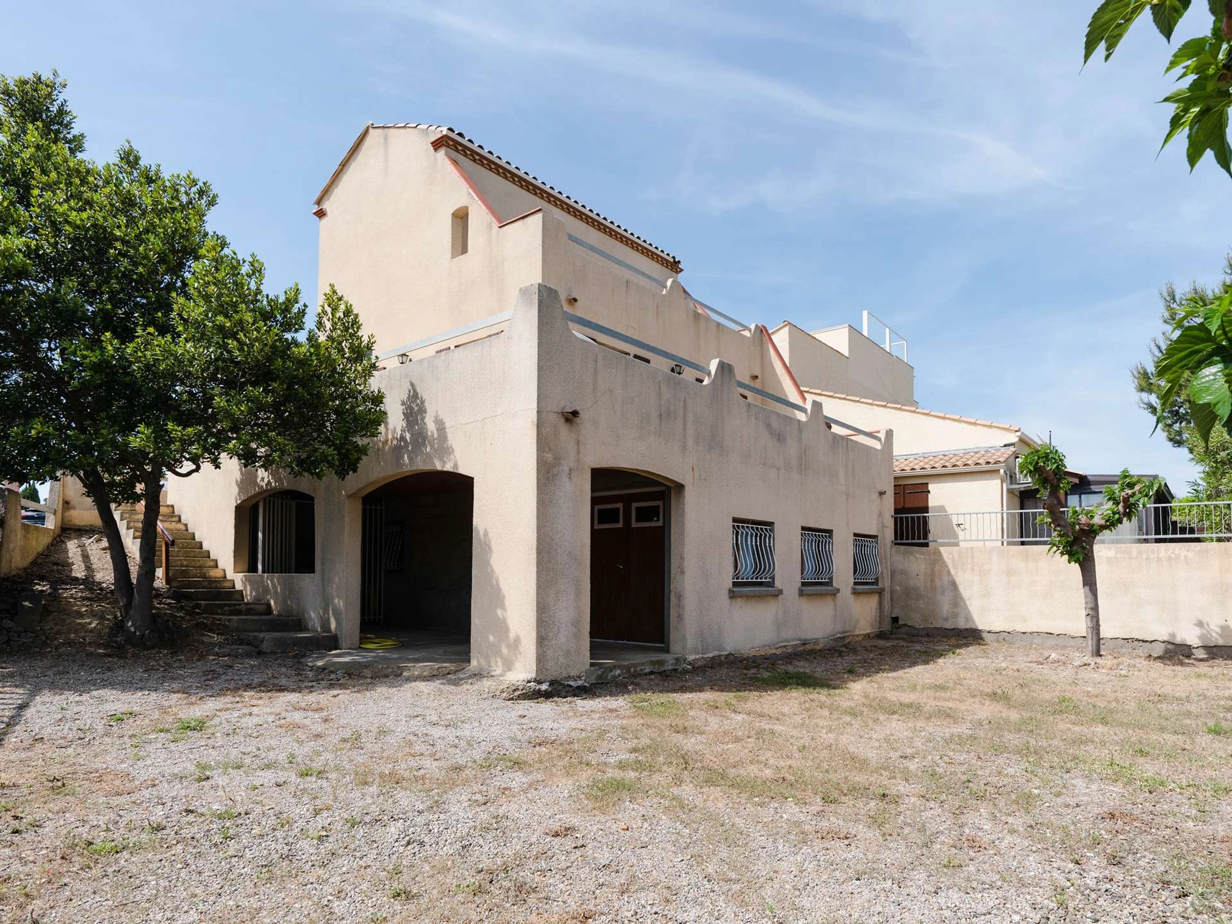 L'escalier sécurisé par 2 barrières mène au 1er étage où se trouvent un WC avec lave-mains, une seconde chambre avec lits superposés (2x90x190) et placard, et une 3ème chambre avec lit double (140x200) et rangements. Les 2 chambres ont accès à un solarium avec vue sur le Massif de la Clape et la mer. Wifi inclus.