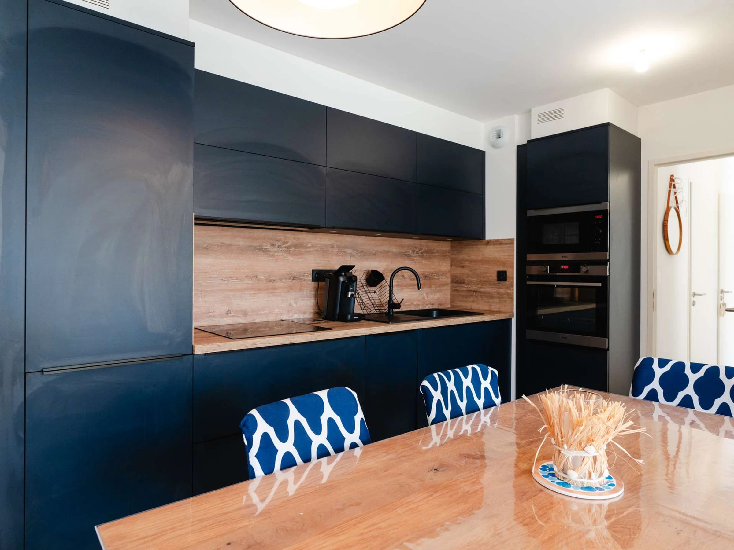 Le logement se situe au premier étage du bâtiment, et dispose d'un espace salon avec cuisine ouverte équipée (plaque de cuisson 3 feux induction, hotte aspirante, cafetière SENSEO, four, micro-ondes, réfrigérateur avec congélateur, petit lave-vaisselle), table, canapé, fauteuils, TV (chaines françaises uniquement), accès à la terrasse de 25m² dotée d'un salon de jardin.