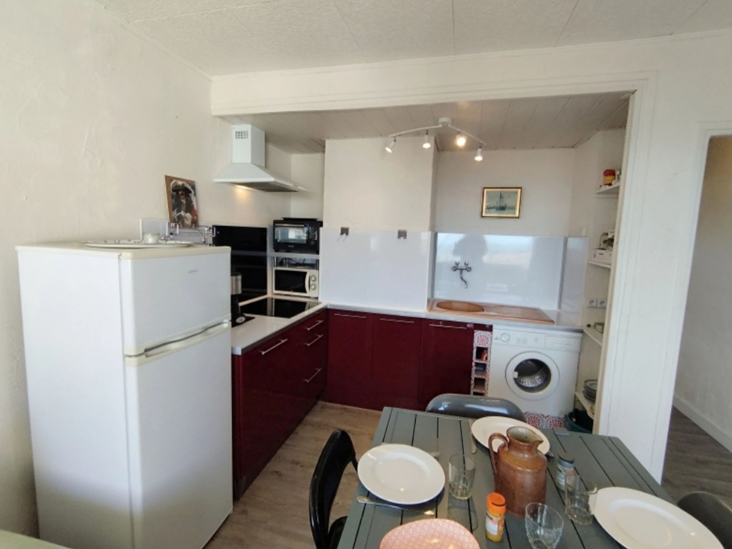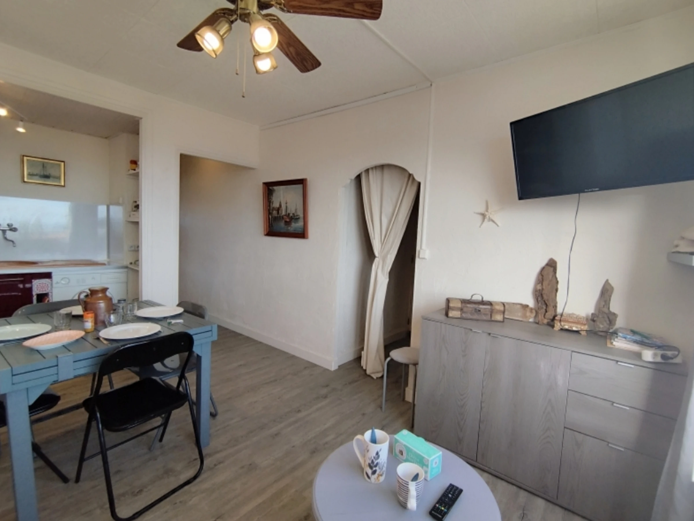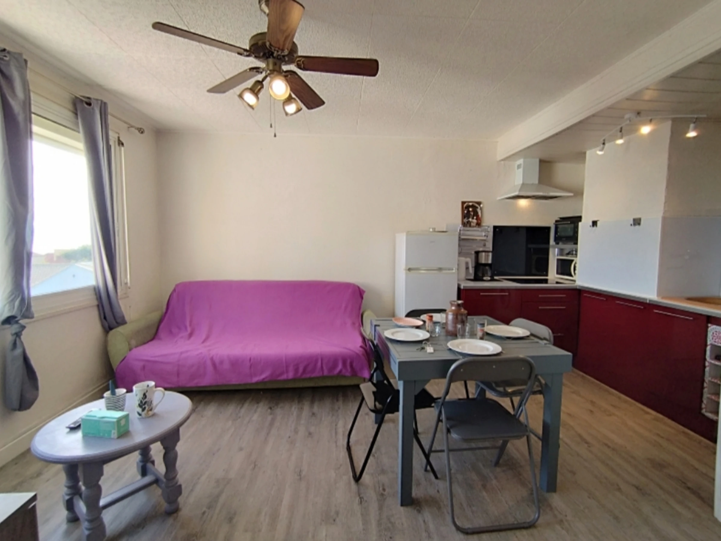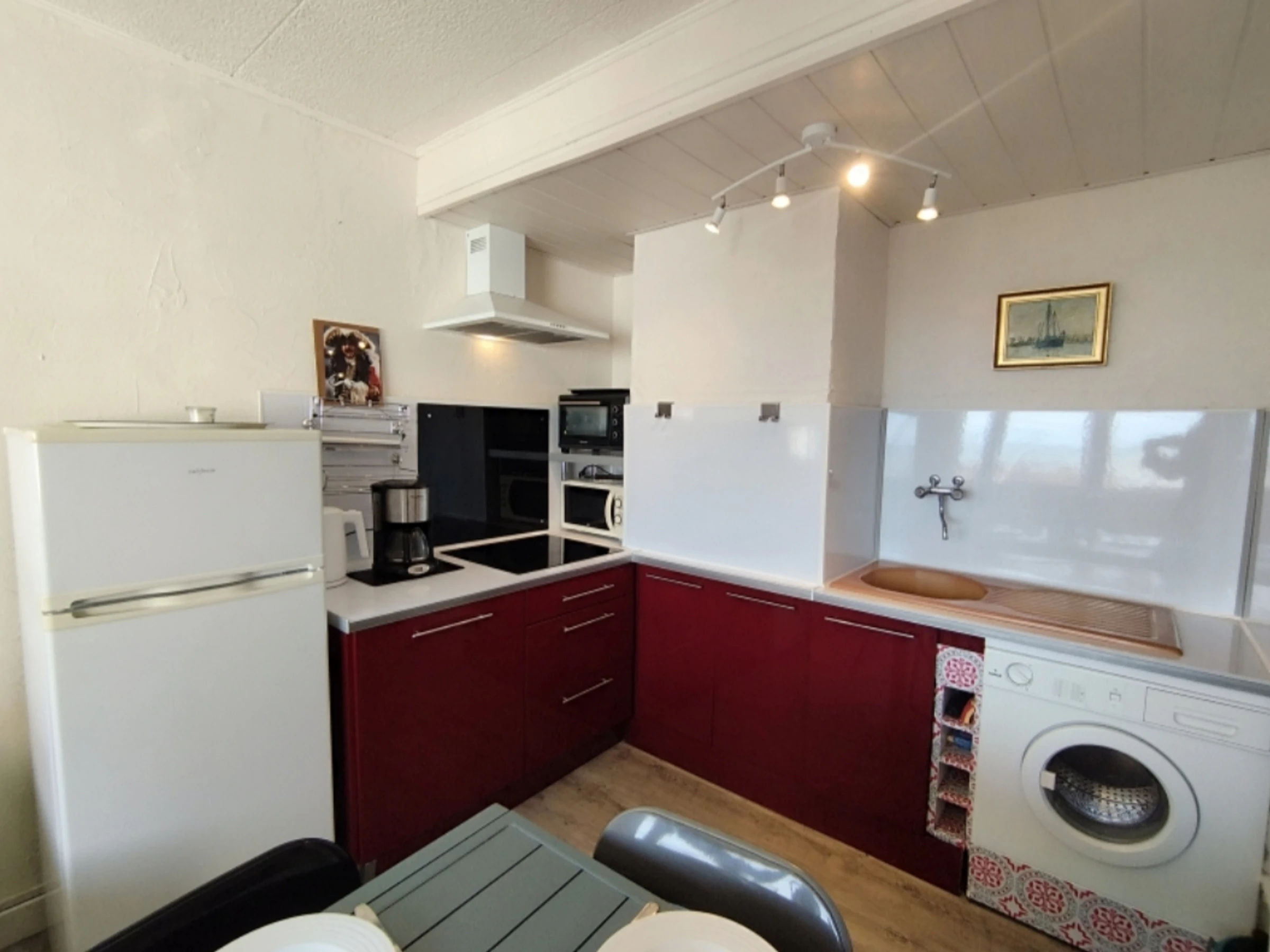 Équipements complets : TV écran plat, frigo-congélateur, lave-linge, micro-ondes, minifour, hotte, cafetière électrique, bouilloire, plaques induction, lit parapluie, ventilateurs...