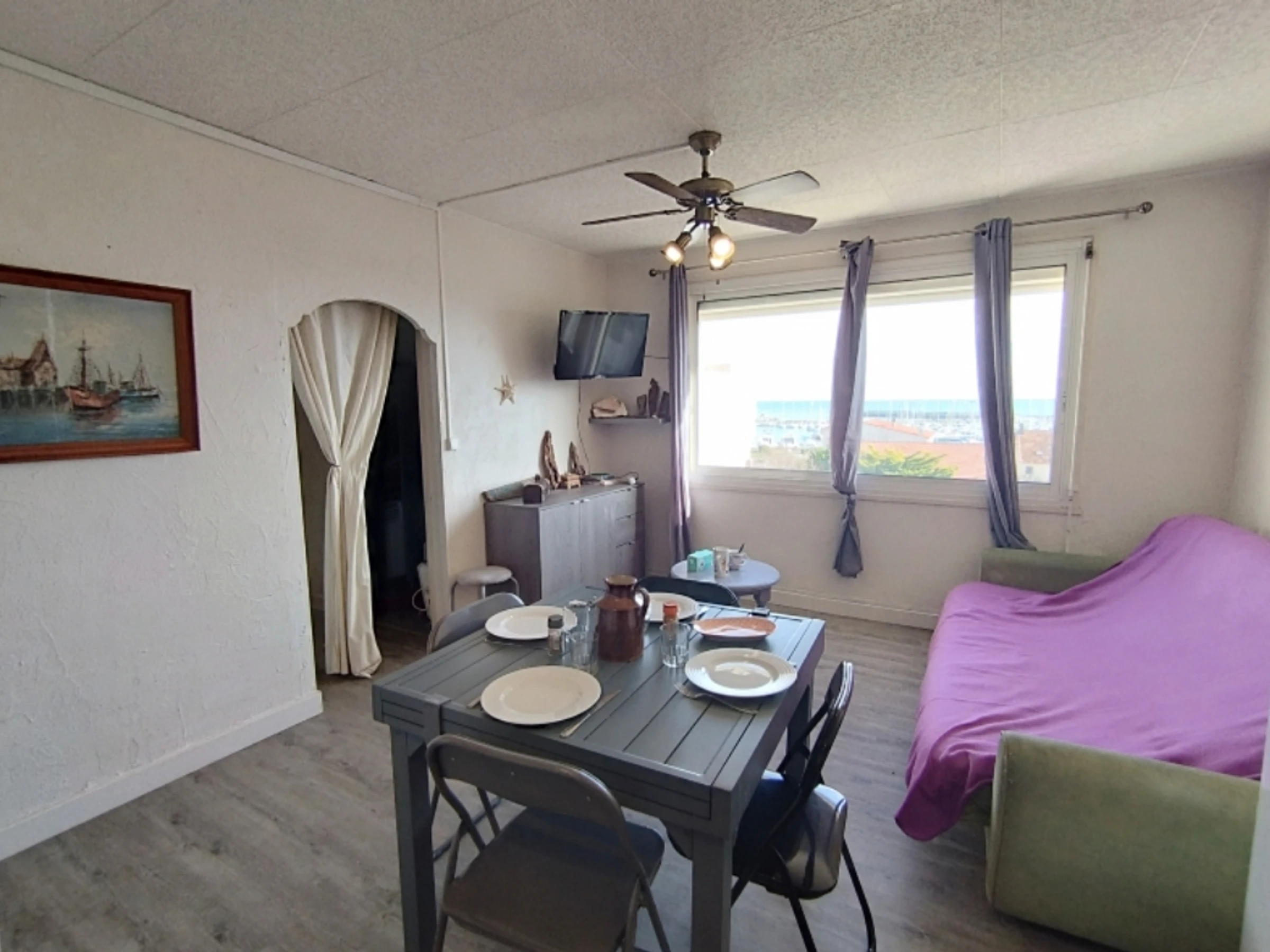 Séjour lumineux (aperçu port), coin cuisine aménagé.