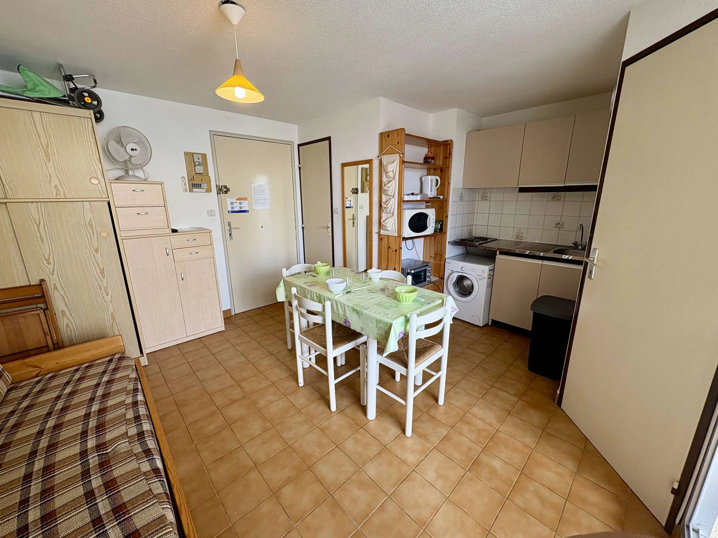 Cette location saisonnière dispose d'un séjour avec canapé gigogne 2 places et télévision (sous réserve d'une bonne réception), d'un coin cuisine équipé, d'une chambre avec lits superposés et d’une salle d'eau avec wc.