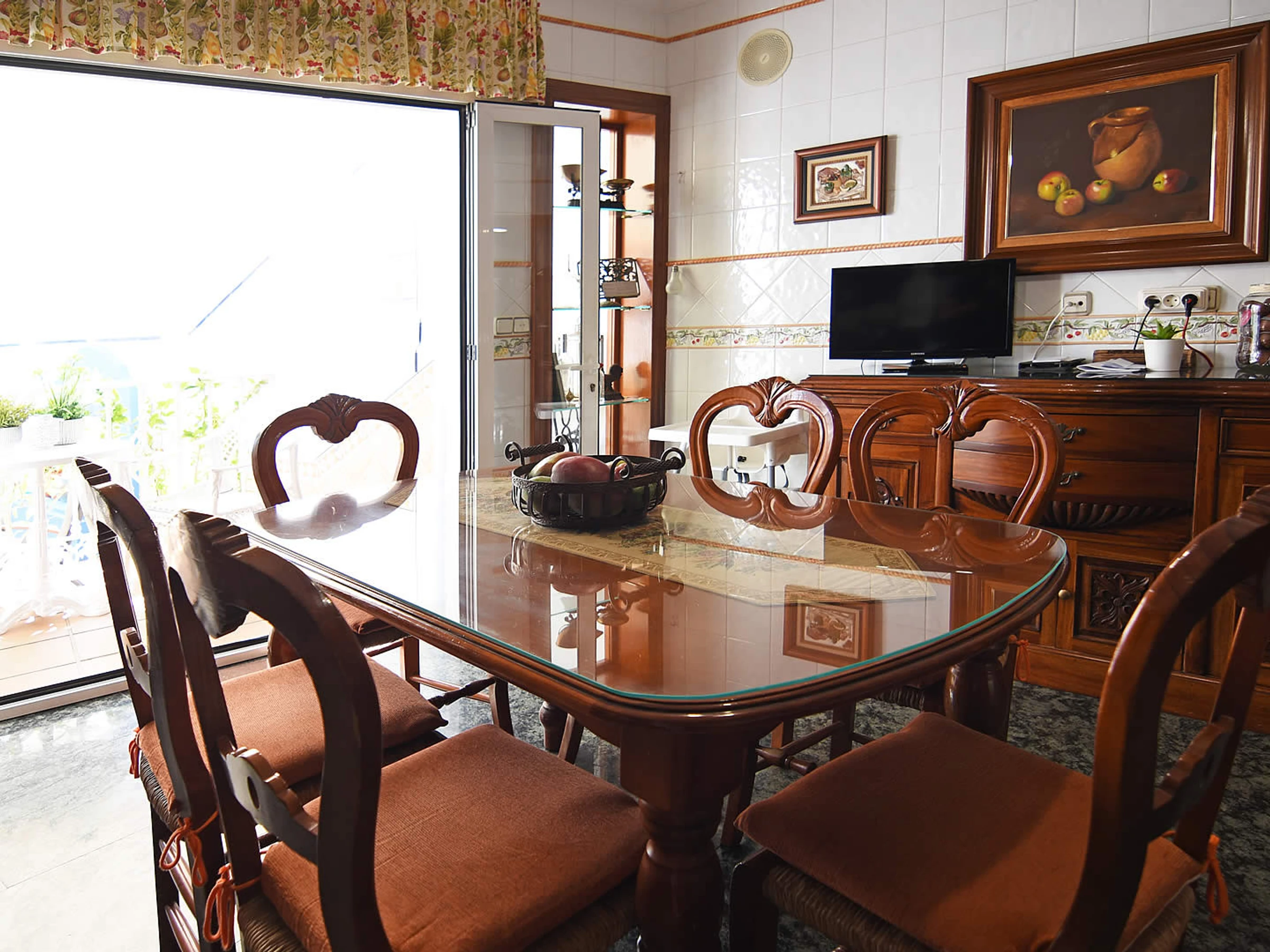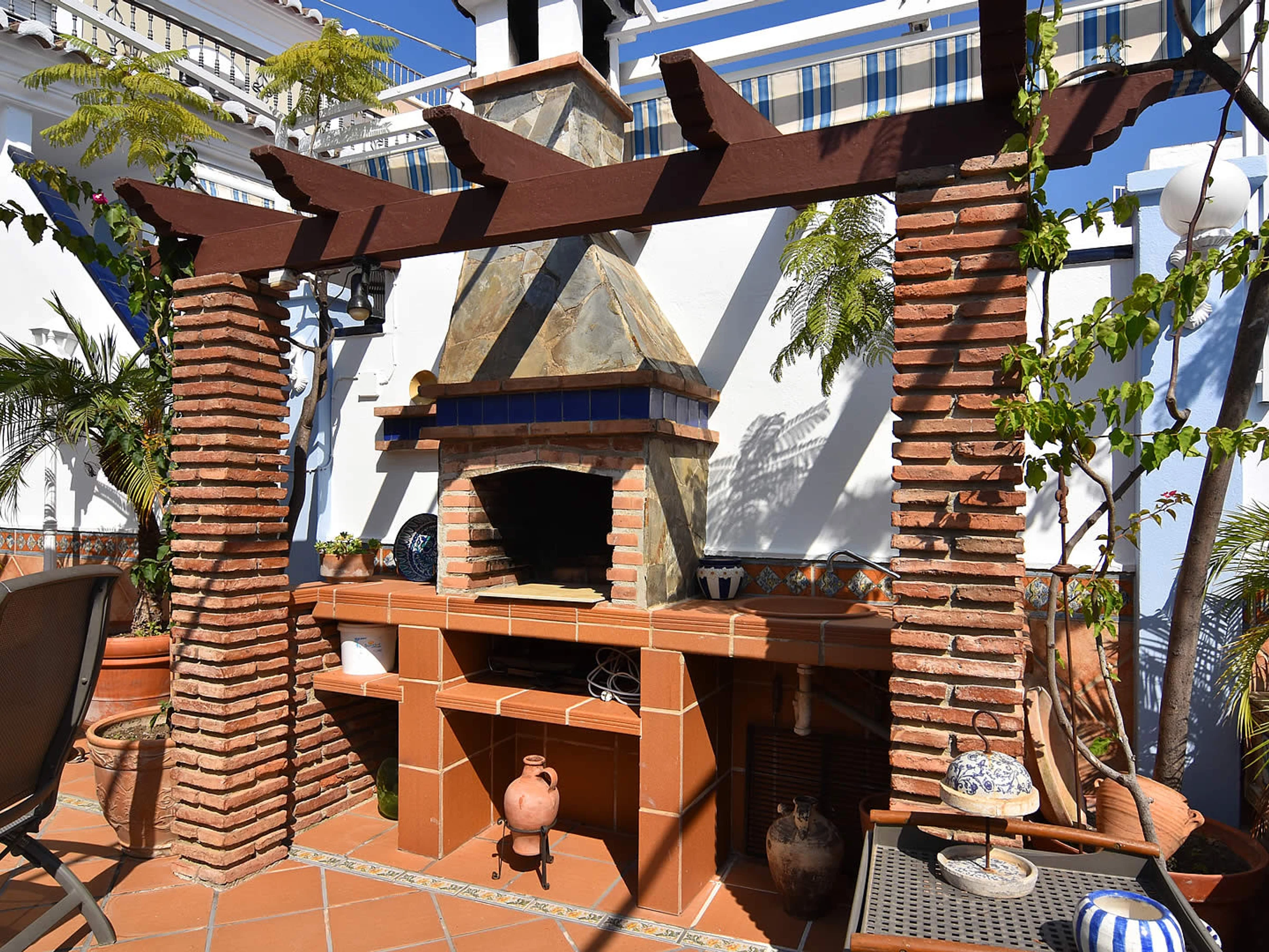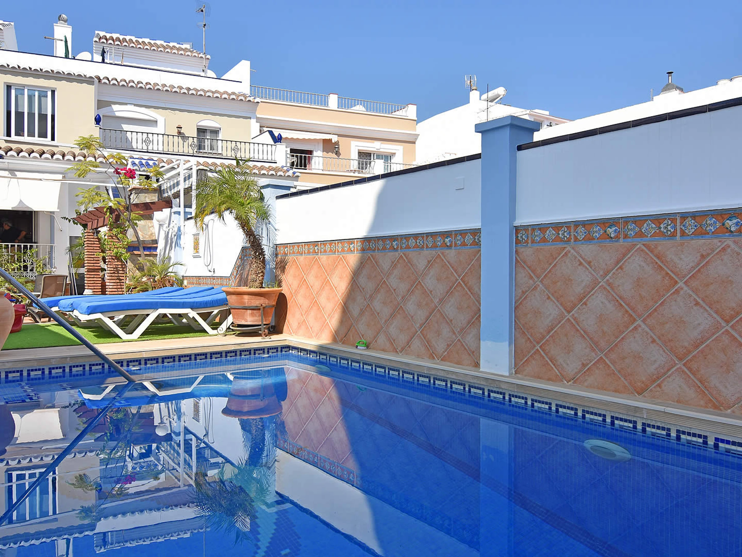 Pas besoin de voiture de location, car vous n'êtes qu'à quelques minutes à pied de la Playa Calahonda de Nerja et des nombreux bars à tapas, restaurants et boutiques du centre de Nerja. En raison de la forte demande de places de stationnement dans la rue de cette zone centrale, nous vous suggérons d'arriver en taxi. Ceux qui souhaitent visiter les belles villes andalouses peuvent soit prendre les transports en commun depuis la gare routière voisine de l'Avenida de Pescia (à 200 m) soit faire une visite guidée. Derrière les façades de cette maison de ville typiquement espagnole, vous trouverez un hébergement spacieux: depuis la rue Mendez Nuñez, des marches mènent à la porte d'entrée qui s'ouvre sur le salon / salle à manger de style classique. À l'arrière et donnant sur la piscine privée (3x5m, profondeur 1,5m), vous trouverez une terrasse relaxante avec un barbecue en brique et une table avec des chaises pour profiter des repas en plein air. À l'étage supérieur, la grande terrasse sur le toit offre une option supplémentaire aux accros du soleil pour se détendre et profiter de celui-ci.