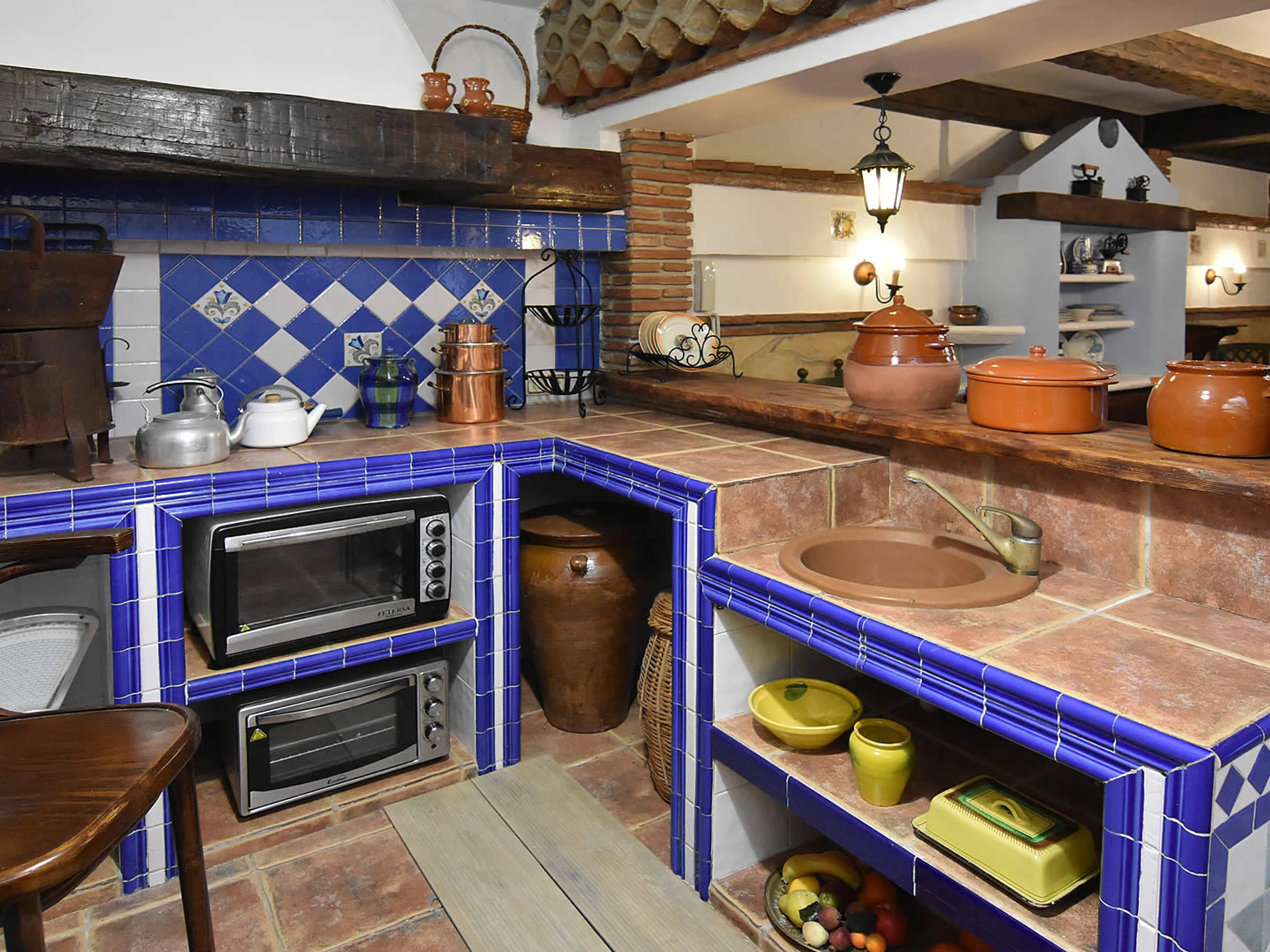 Au rez-de-chaussée, il y a un coin salon confortable avec une table et des chaises puis un téléviseur à écran plat avec télévision par satellite (avec BBC et ITV) et haut-parleur Bluetooth. La cuisine est située vers l'arrière de la villa et est entièrement équipée avec plaque vitrocéramique, four, micro-ondes, réfrigérateur/congélateur, lave-vaisselle et lave-linge. Les portes-fenêtres de la cuisine s'ouvrent sur une petite terrasse surélevée avec des marches menant à la piscine privée. Il y a une salle de douche au rez-de-chaussée.