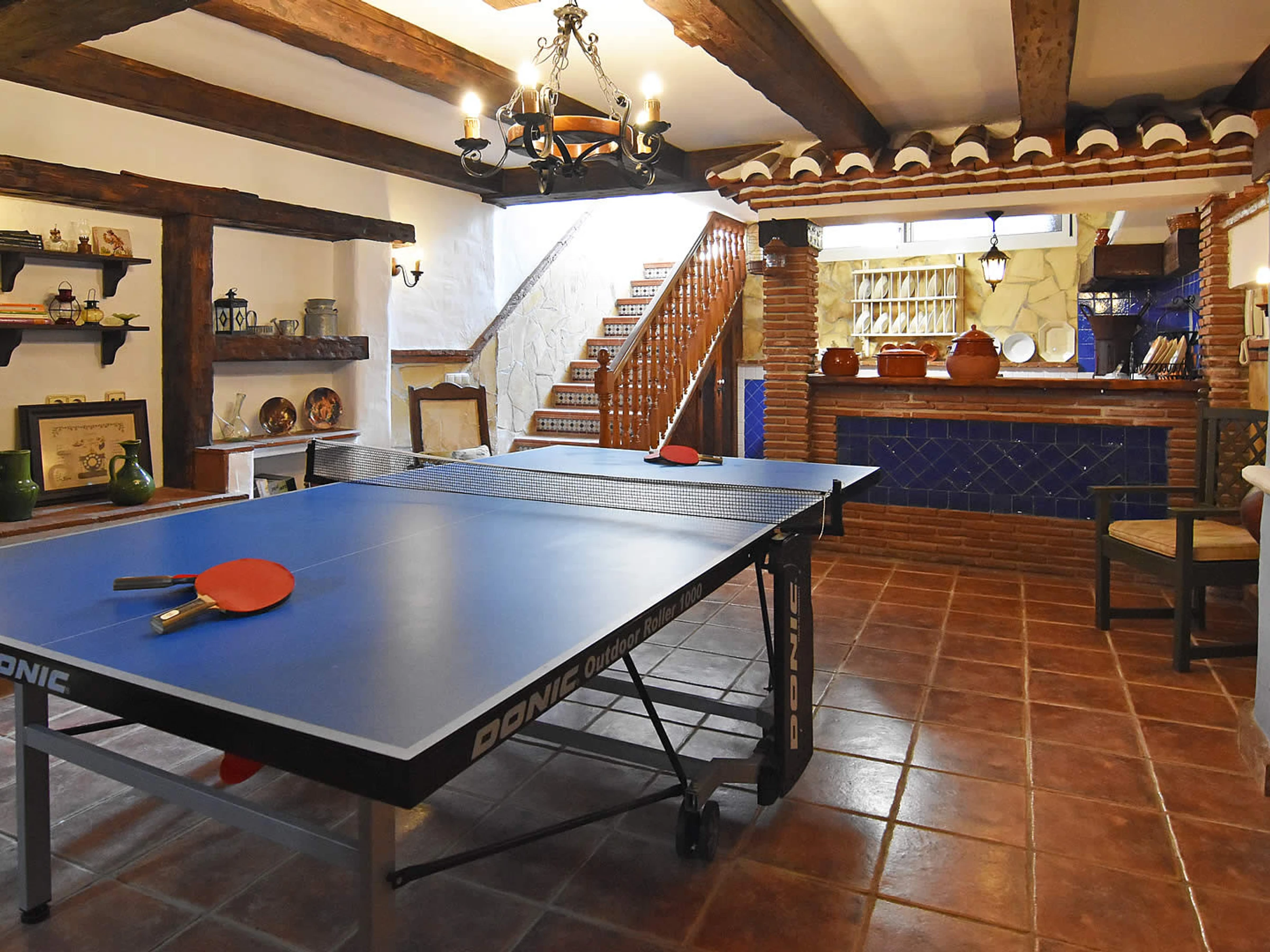 Au niveau inférieur, il y a un espace de vie attrayant avec des poutres apparentes, une cheminée, une deuxième table à manger et des chaises ainsi qu'un bar pour le petit-déjeuner avec des tabourets et un coin kitchenette. C'est un endroit idéal pour accueillir et divertir vos invités. Il y a aussi un WC au niveau inférieur.