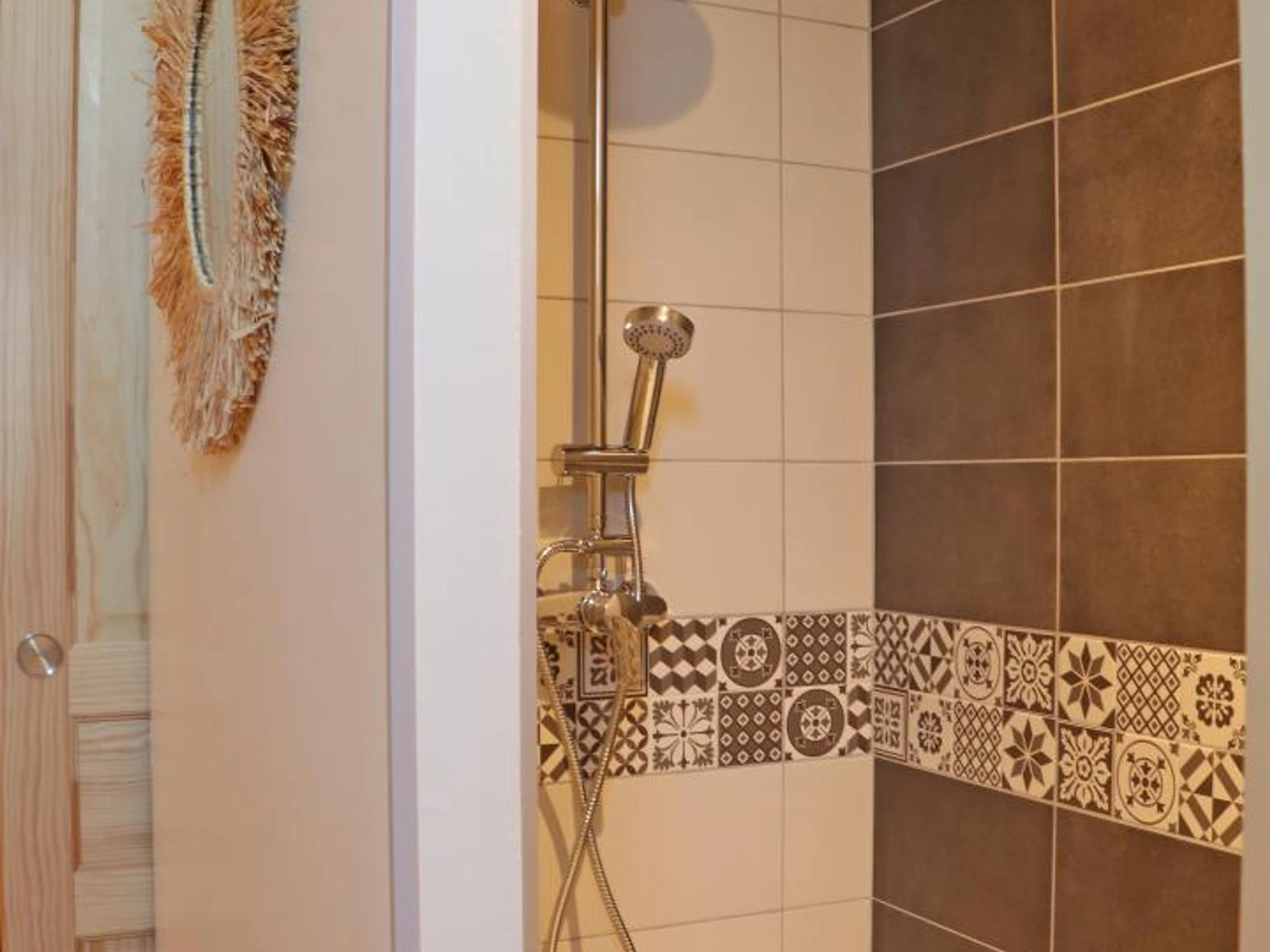 chambre avec lit fait 2 personnes 180 x 200 cm, fauteuil suspendu, salle d'eau ouverte et wc indépendant.