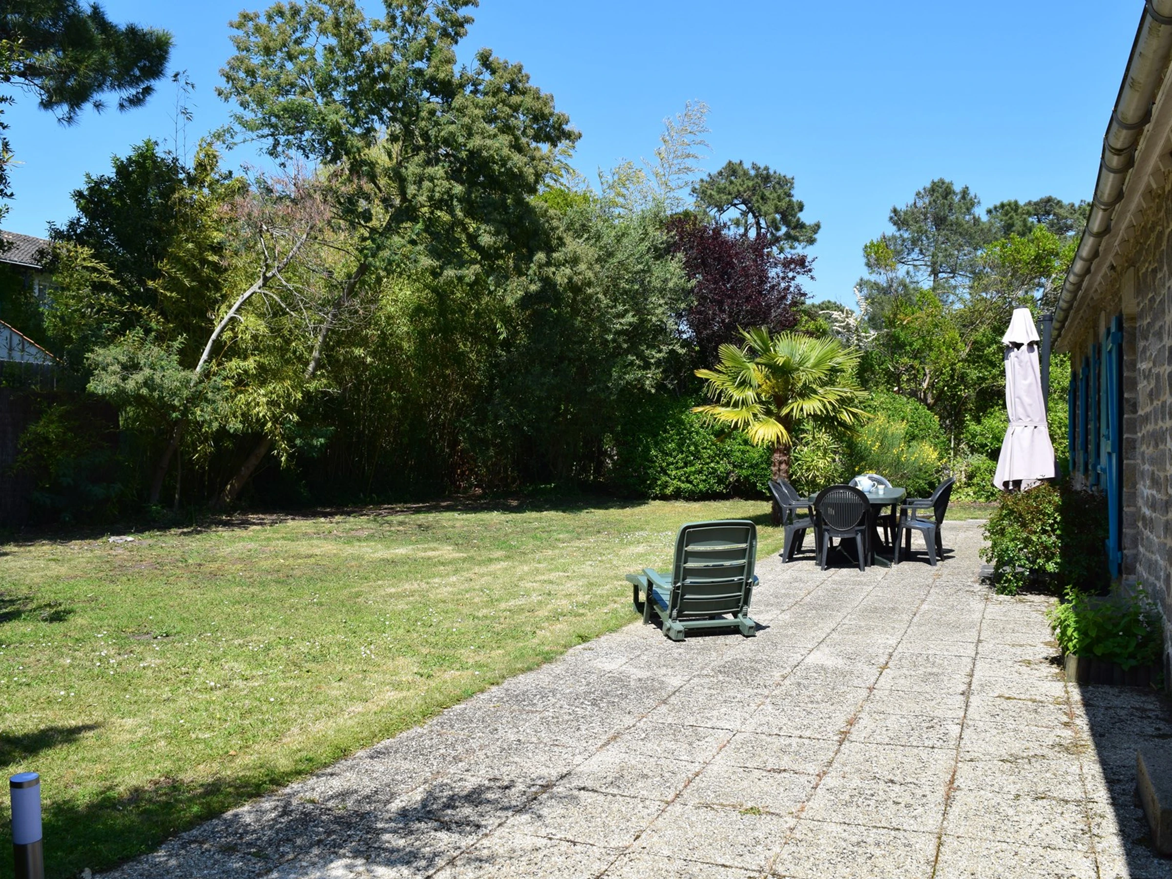 Les Plus de cette location à la mer : Un joli terrain clos avec une terrasse, salon de jardin, bains de soleil et barbecue. Ménage de fin de séjour inclus