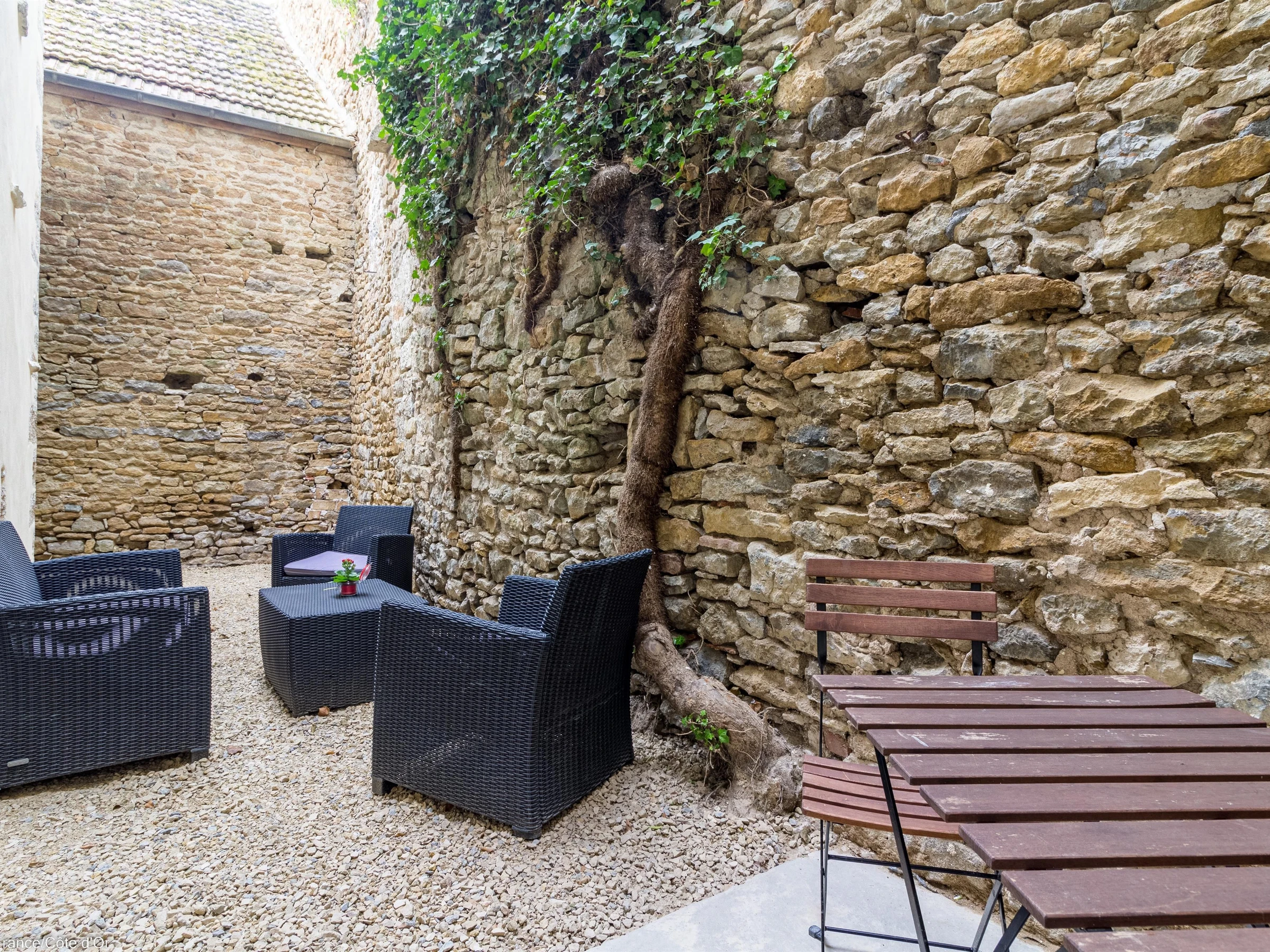 Petite cour fermée à l'abri des regards, à l'arrière de la maison avec terrasse et mobilier, barbecue.