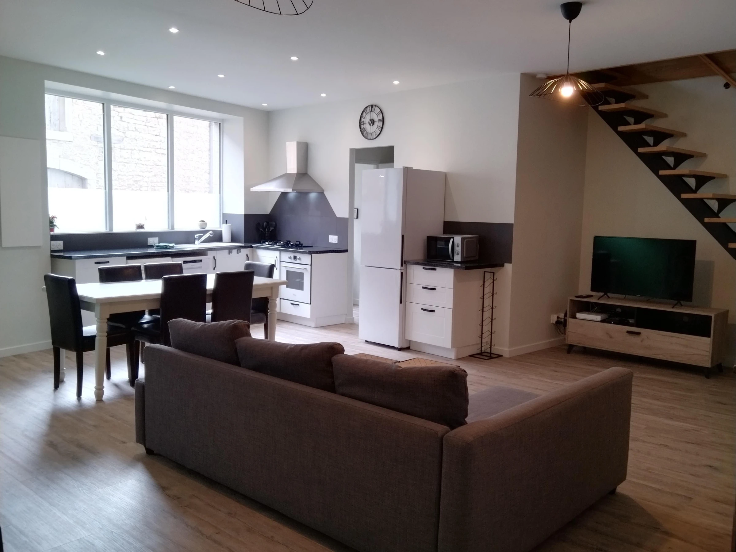 Au RDC, grande pièce de vie lumineuse de 50 m² tout confort, avec TV écran plat. Cuisine ouverte équipée. Cellier attenant avec machine à laver et WC indépendant.