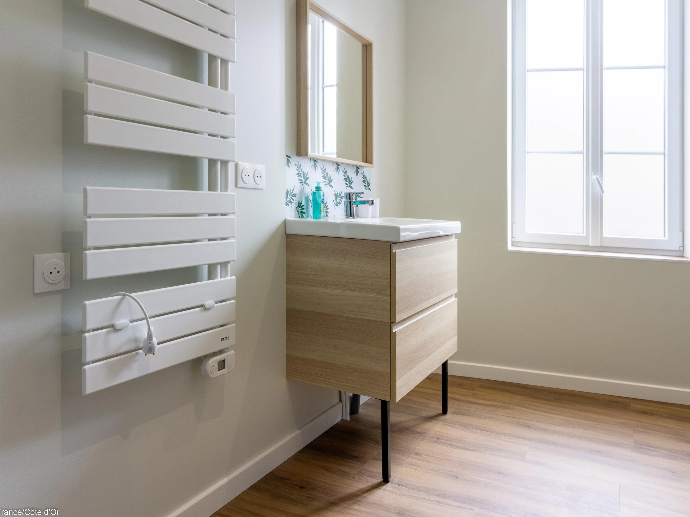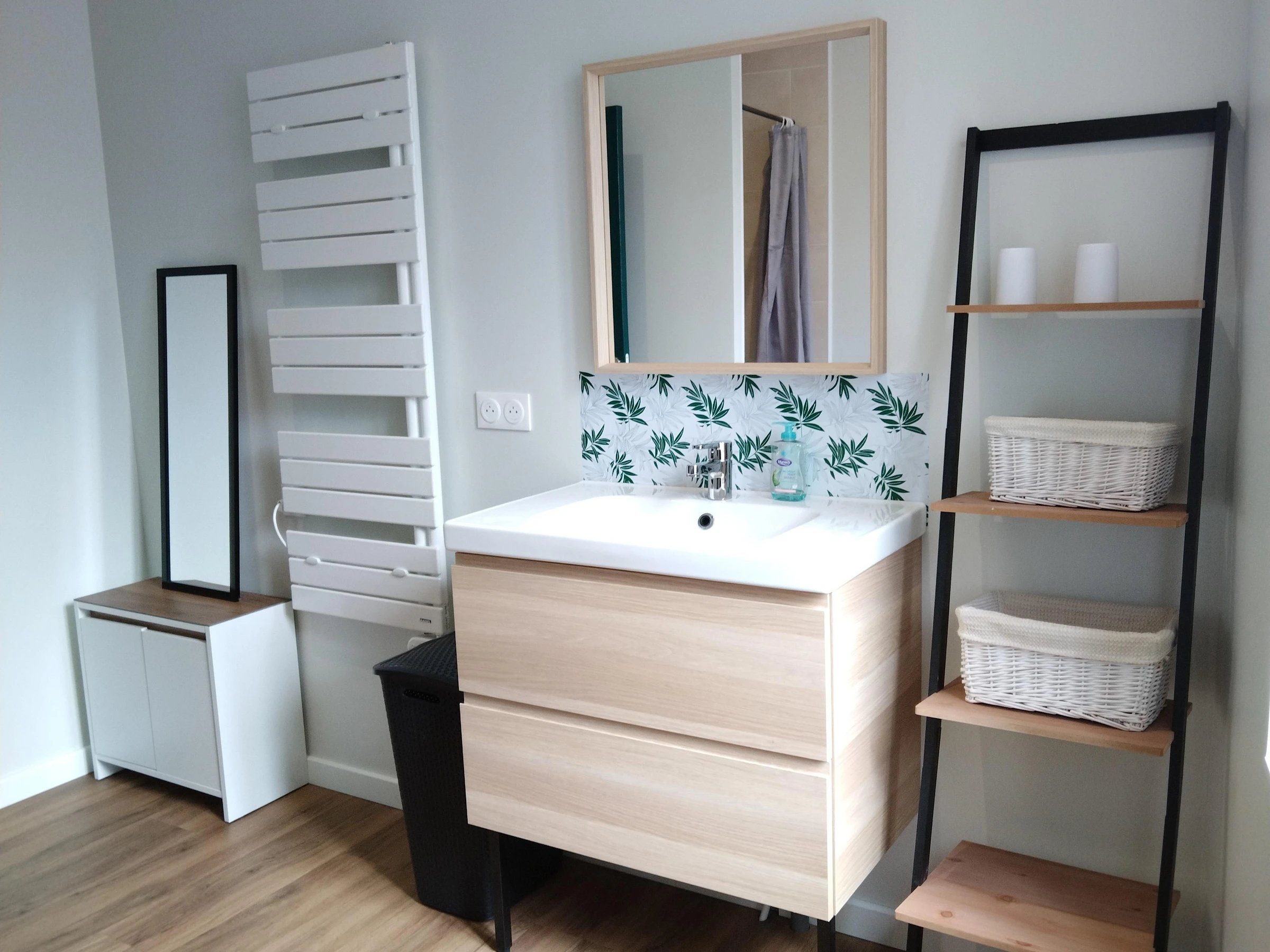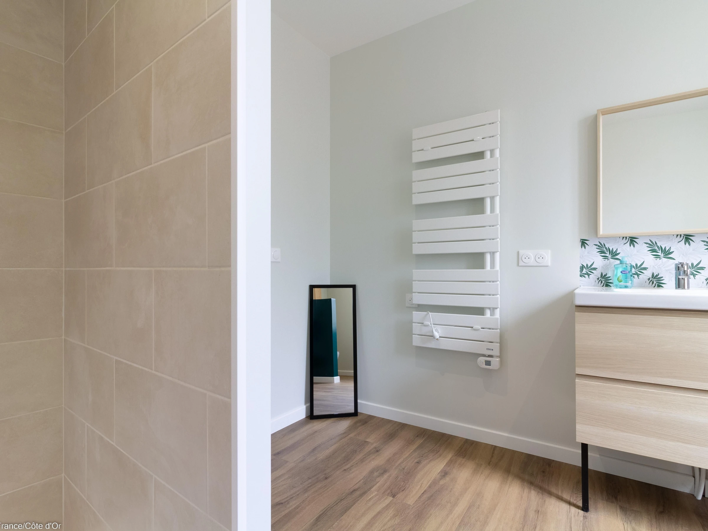 On accède à l’étage par un bel escalier contemporain, non sécurisé d’un côté. Barrière de sécurité enfant en haut de l'escalier. Un couloir dessert une grande salle d’eau avec douche à l’italienne et 3 chambres.
