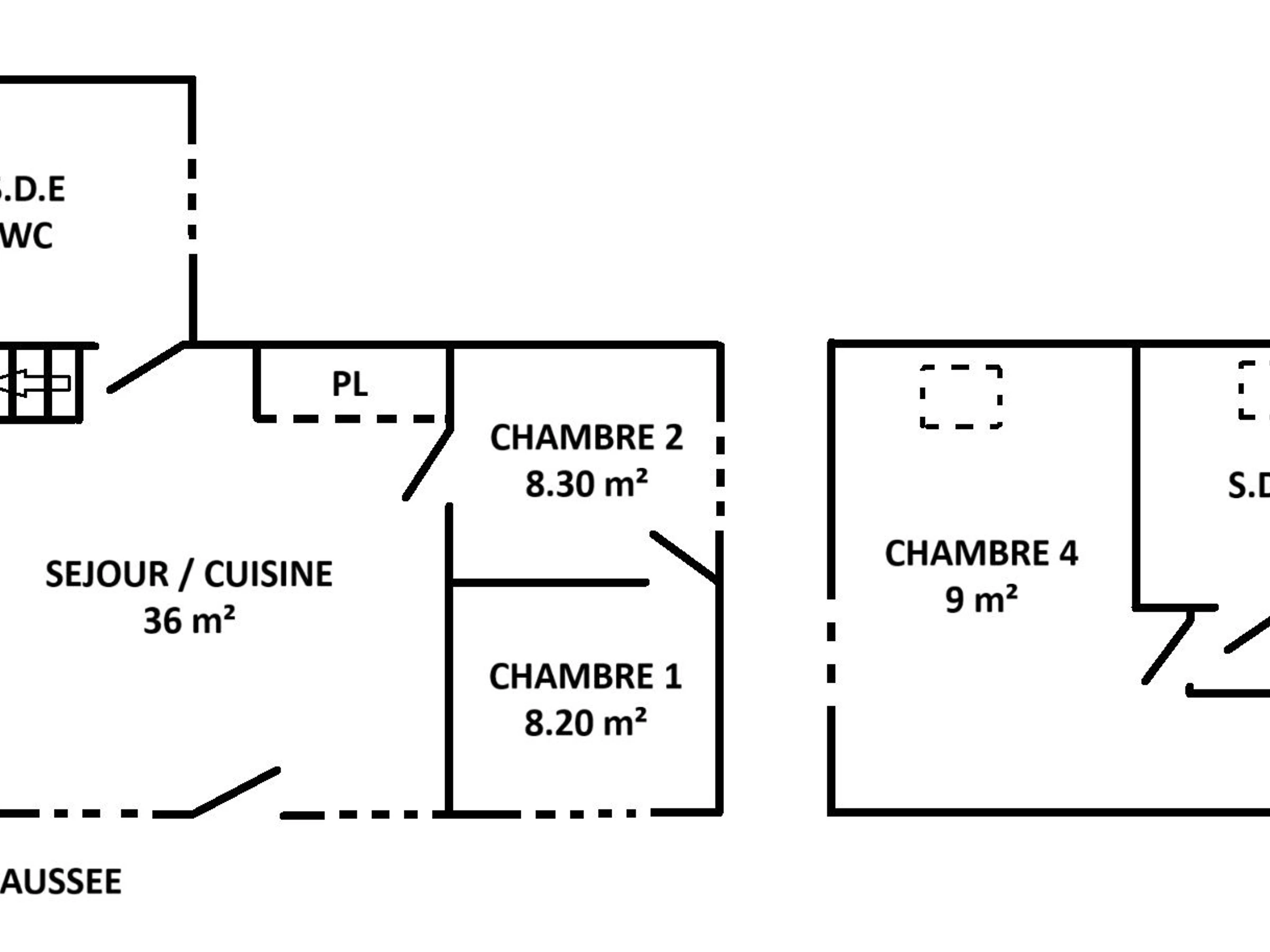 RDC: cuisine aménagée ouverte sur salon/séjour avec cheminée (2 marches pour accéder au salon), 2 chambres traversantes (1: 2 lits 80x190 jumelables, 2: 2 lits 90x190 jumelables), grande salle d'eau avec 2 douches séparées et 1 WC, 1 chambre (2 lits 90x190 jumelables) avec salle d'eau/wc attenants.