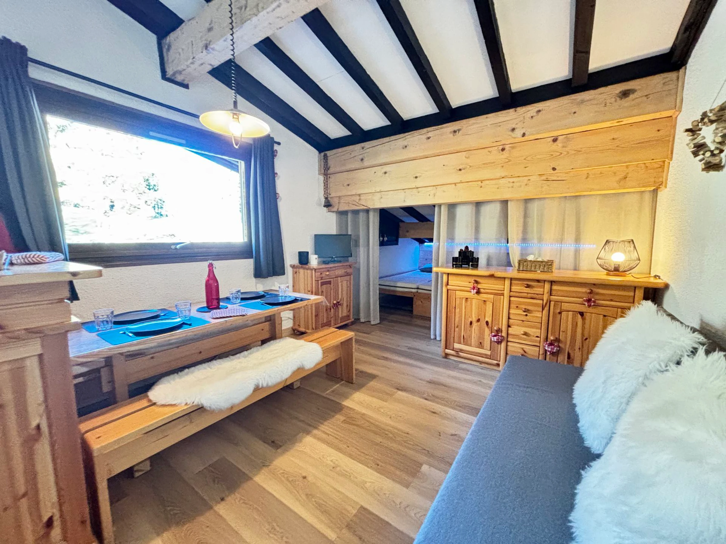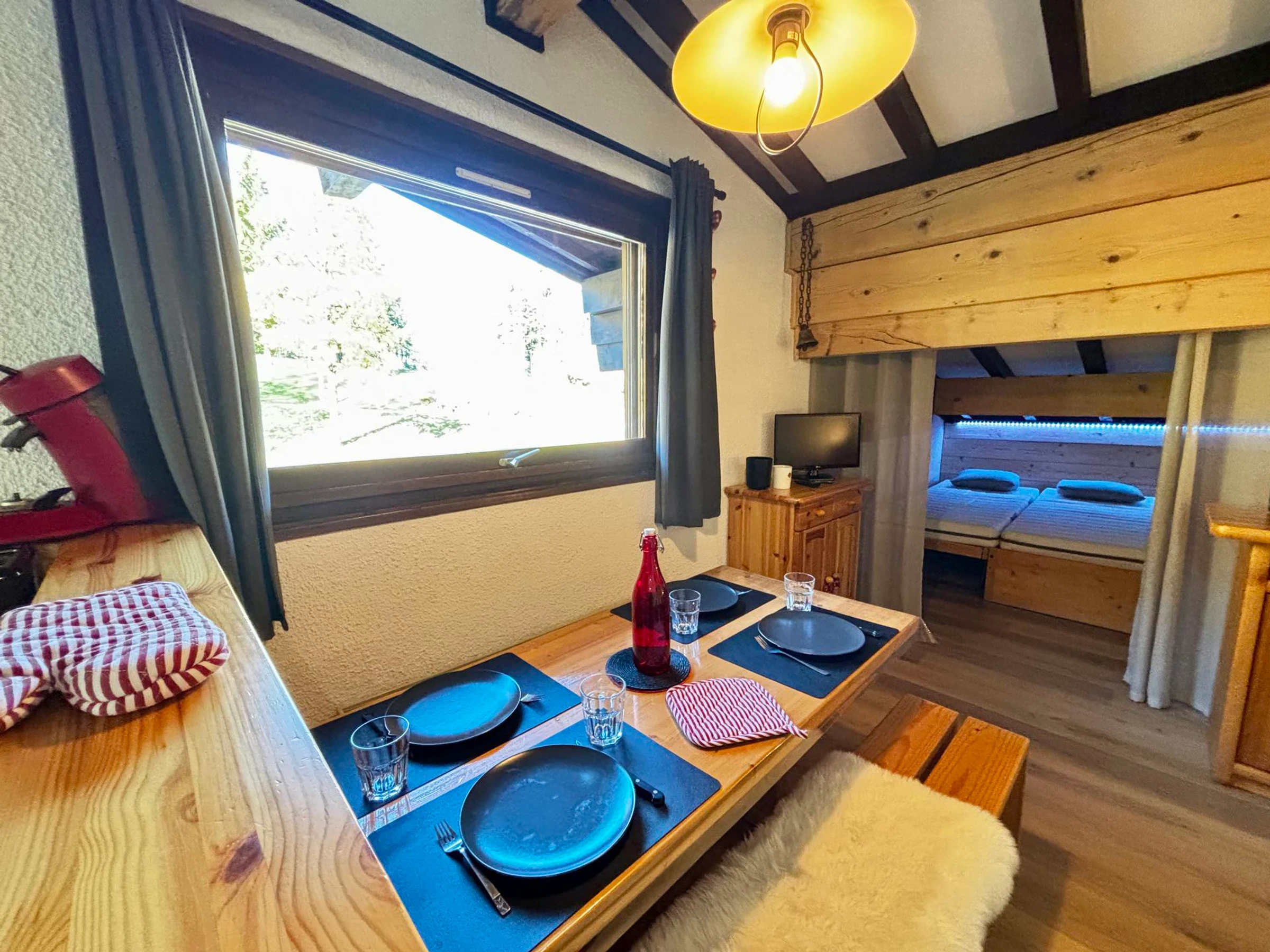NOTRE AVIS : Ce studio bien agencé et très fonctionnel, offre un espace optimisé idéal pour un couple ou une petite famille. Situé dans un environnement calme, au pied des pistes, il permet un accès skis à quelques mètres de l'’Espace Diamant.