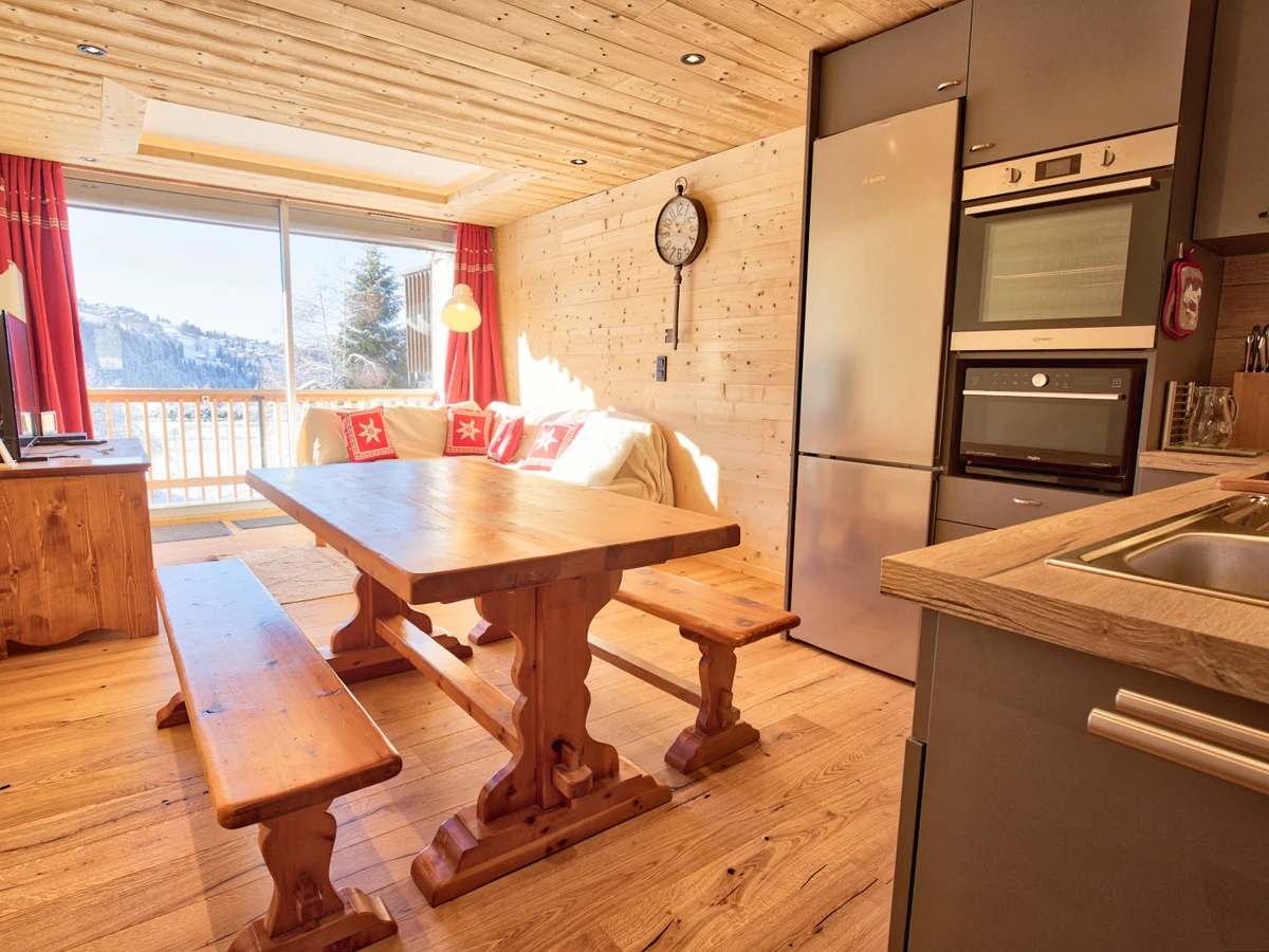 Appartement de 48 m² entièrement rénové pour six voyageurs dans une résidence au pied des pistes de ski. Situé au 2ème étage, vous allez apprécier le balcon en exposition sud offrant une vue dégagée sur le village, le Mont Charvin et la vallée.