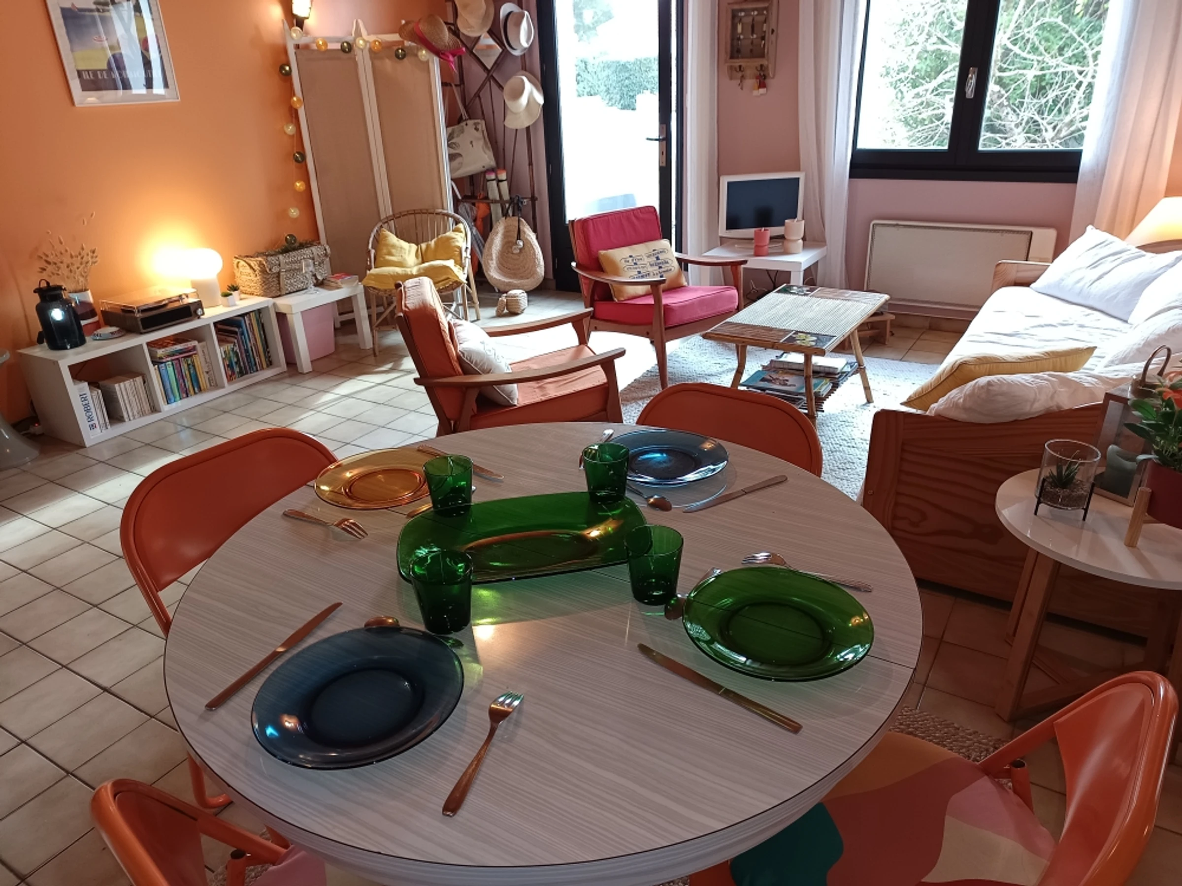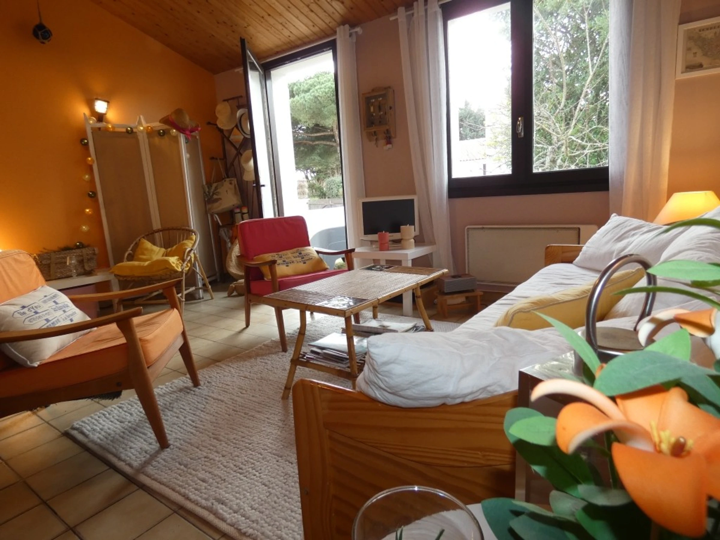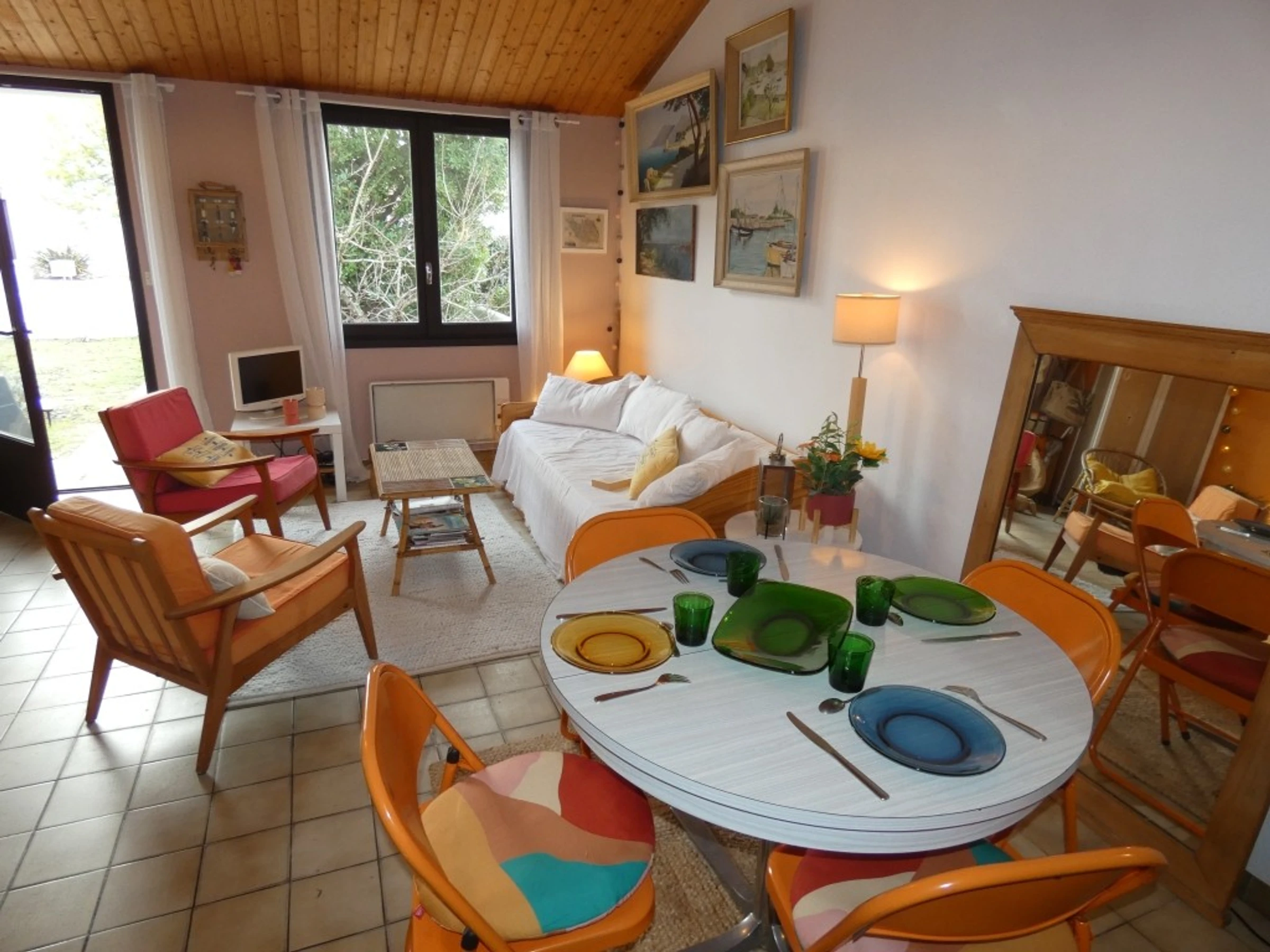 - d'un séjour à l'esprit vintage aménagé avec du mobilier année 70, canapé, fauteuils, télévision.