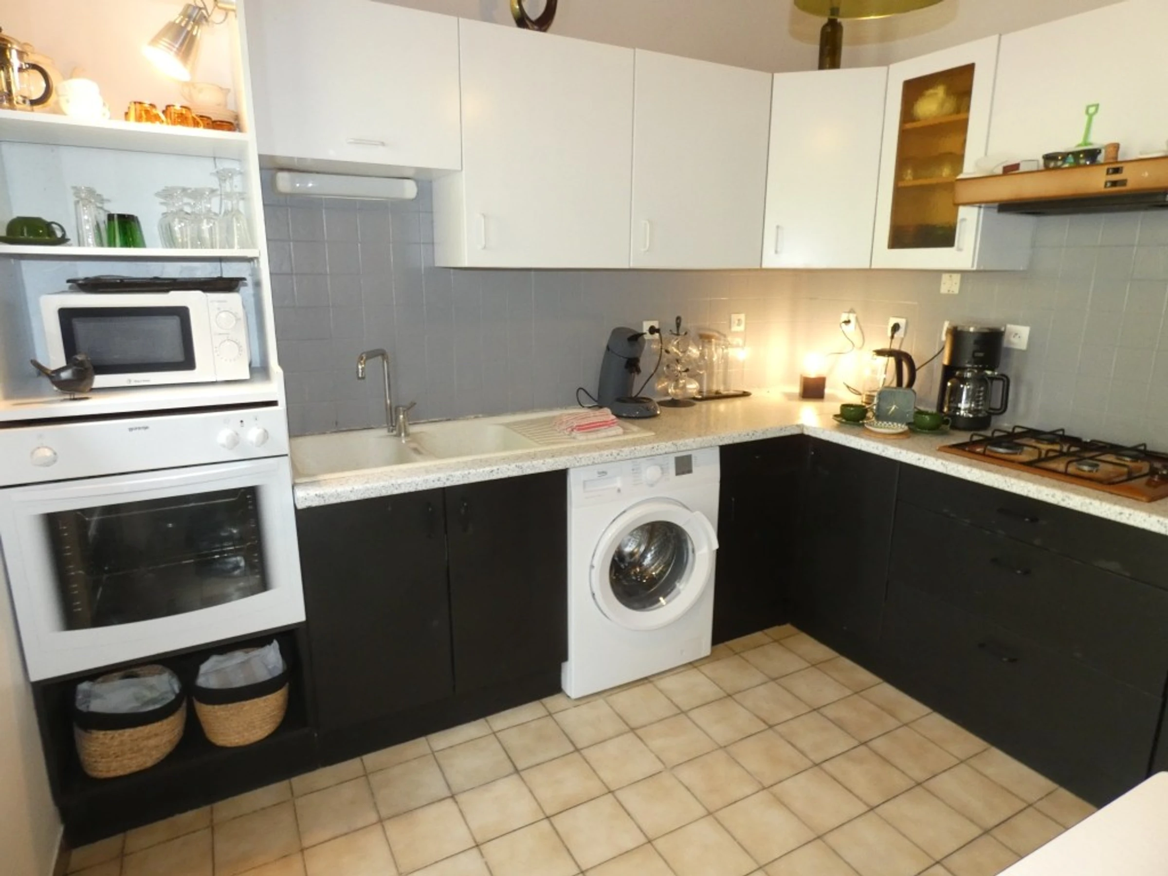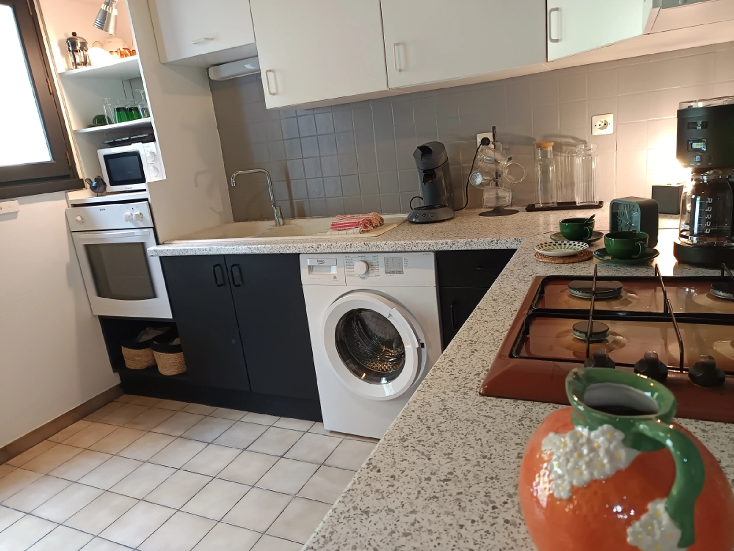 - Une cuisine contemporaine équipée : plaque cuisson 4 feux gaz, four électrique, micro-ondes, cafetières standard et dosettes, bouilloire, grille-pains, lave-linge, les couverts pour 4 personnes