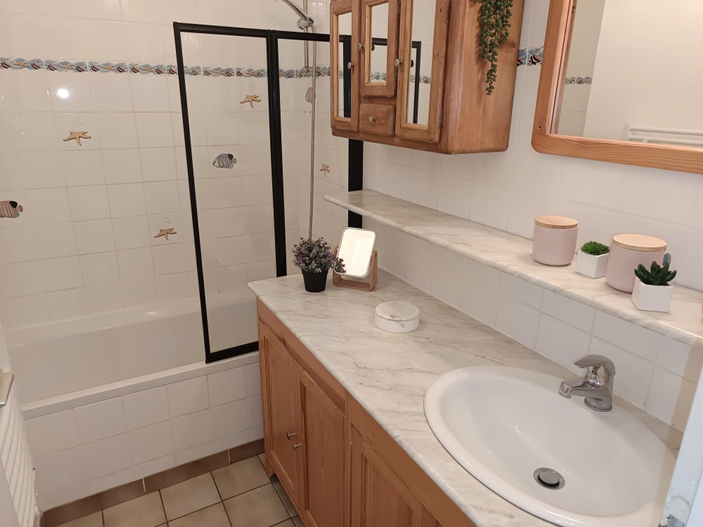 - Une salle de bains avec vasque, baignoire, sèche serviettes