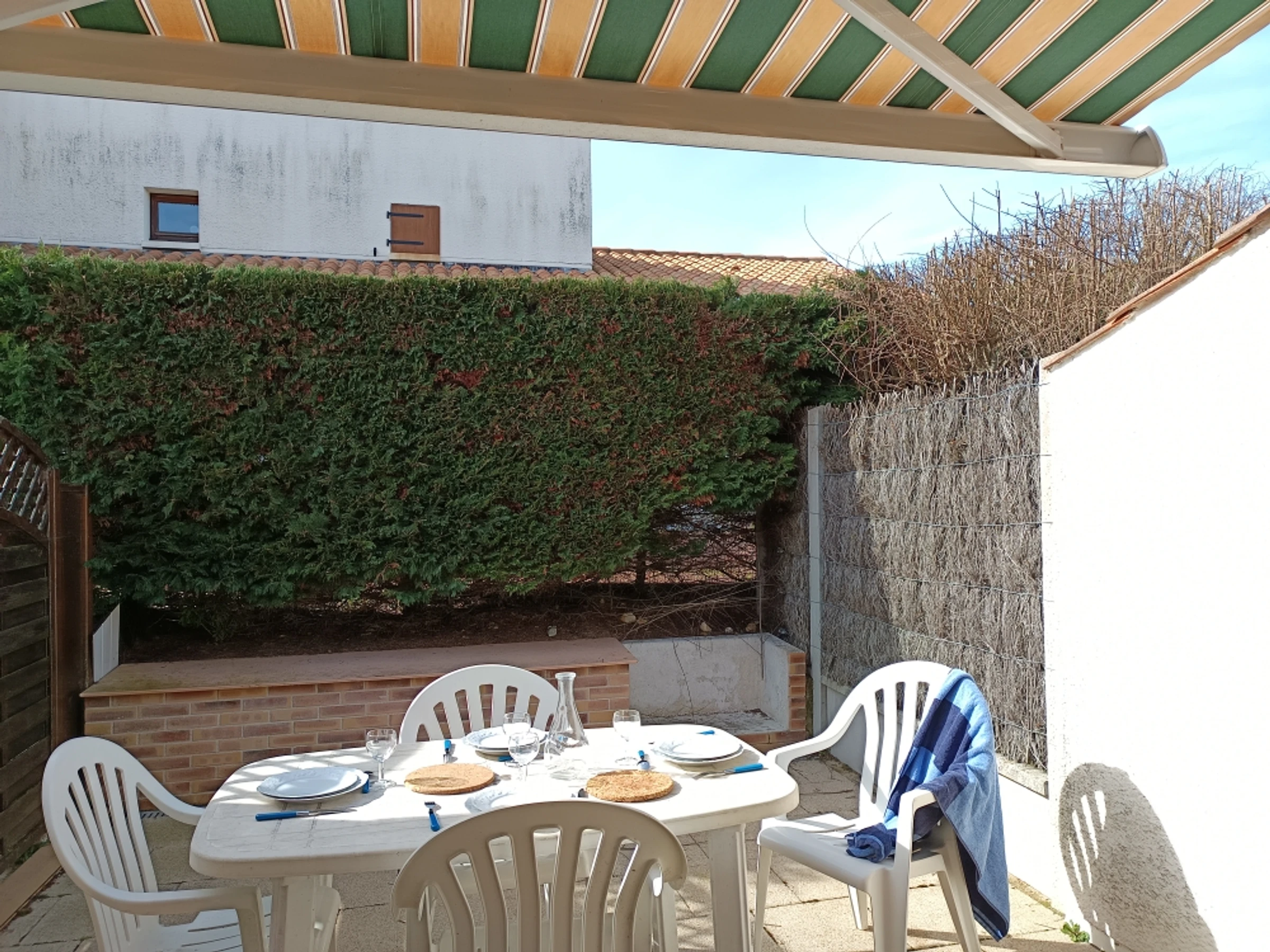 - Une terrasse aménagée d'une table et ses quatre chaises, un barbecue, une store banne