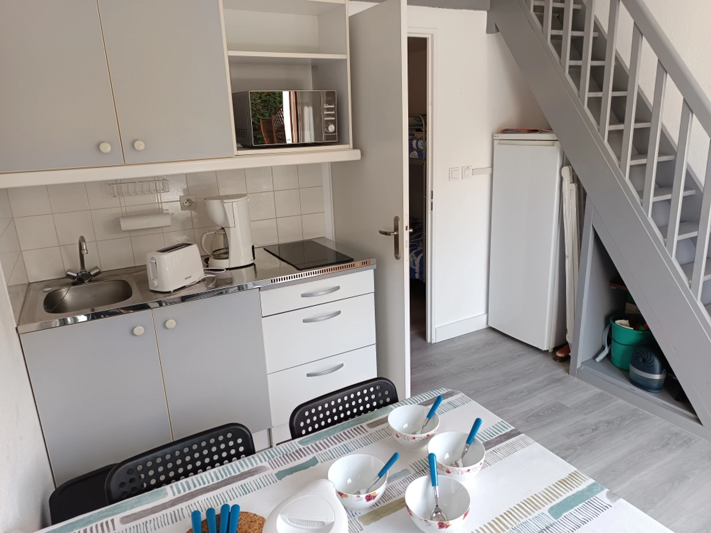 - un espace cuisine ouvert sur le séjour avec une plaque de cuisson induction, réfrigérateur, four micro-ondes multifonctions