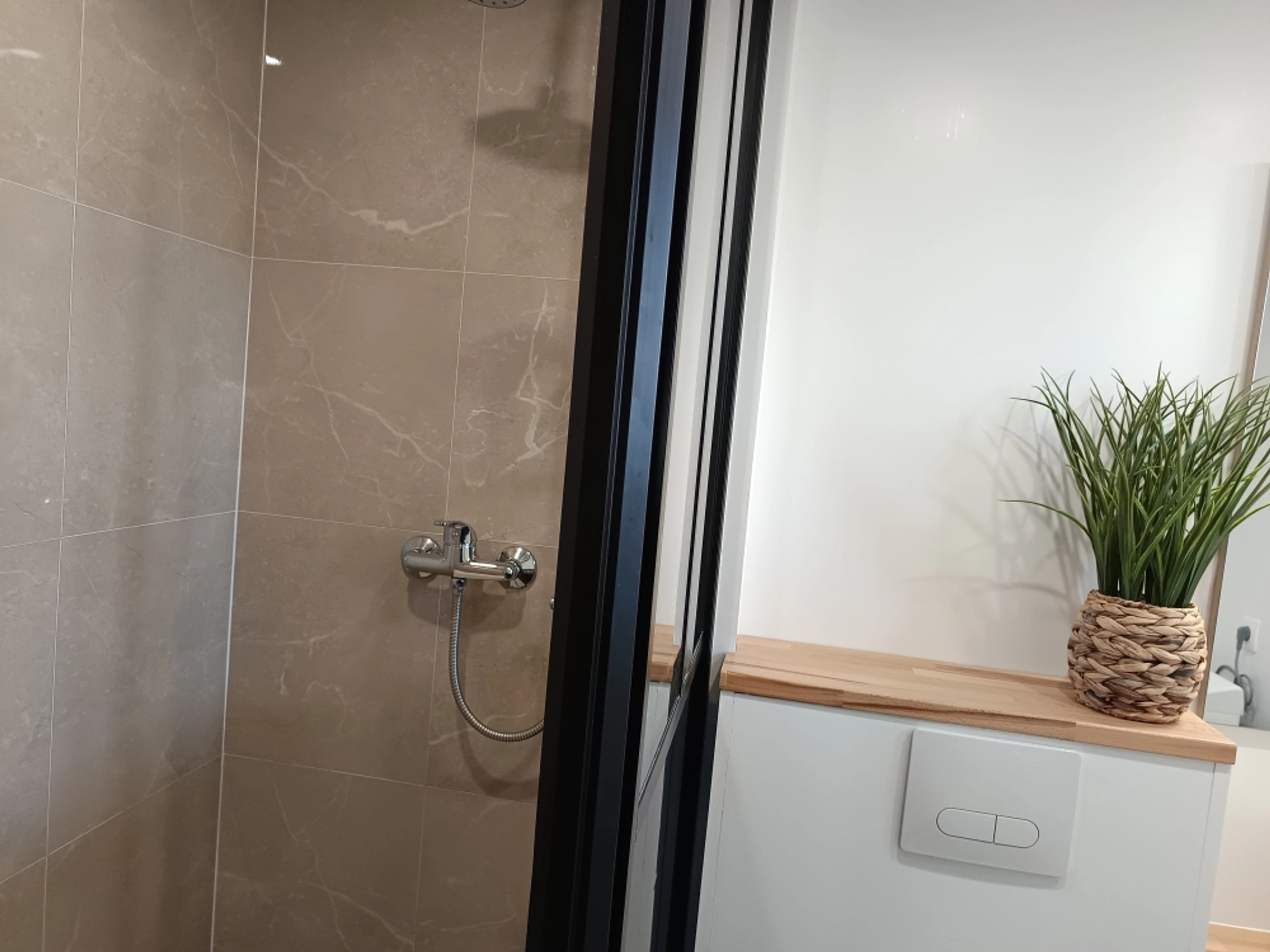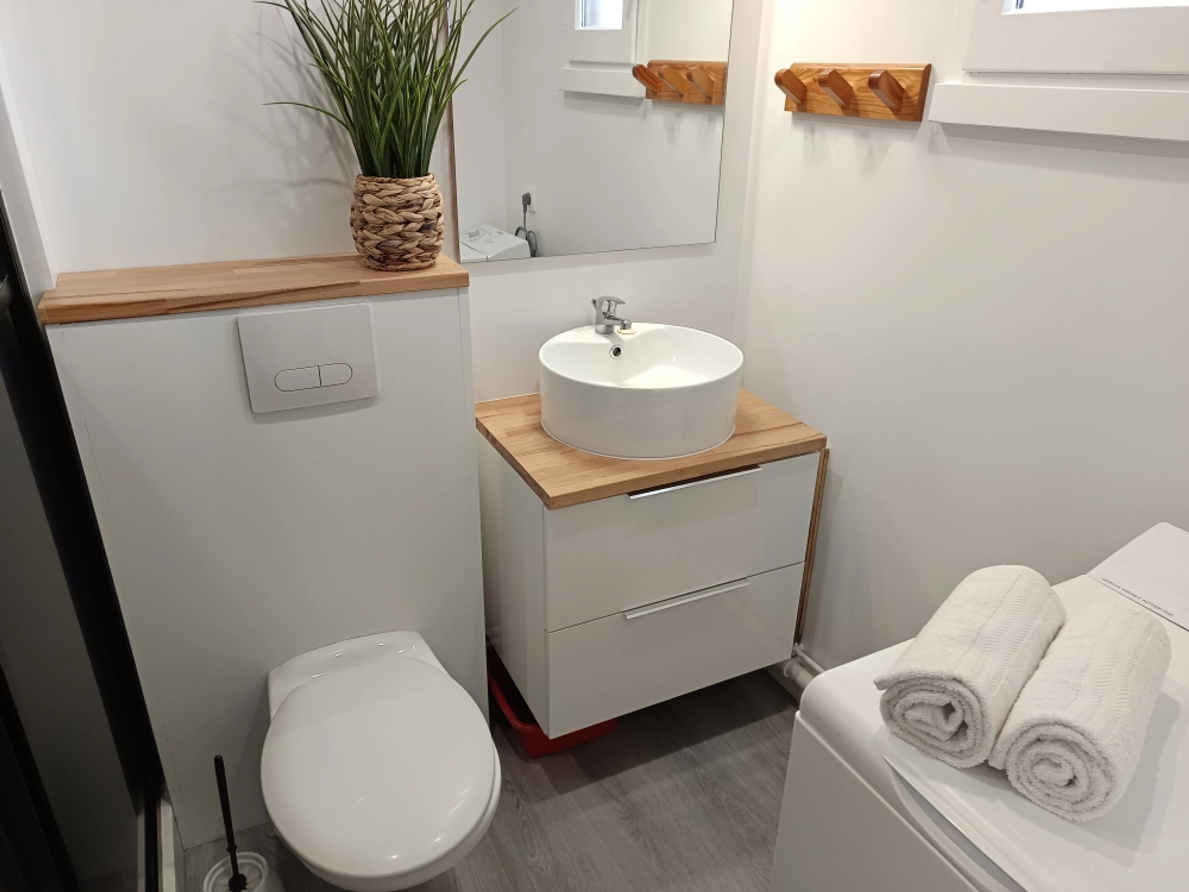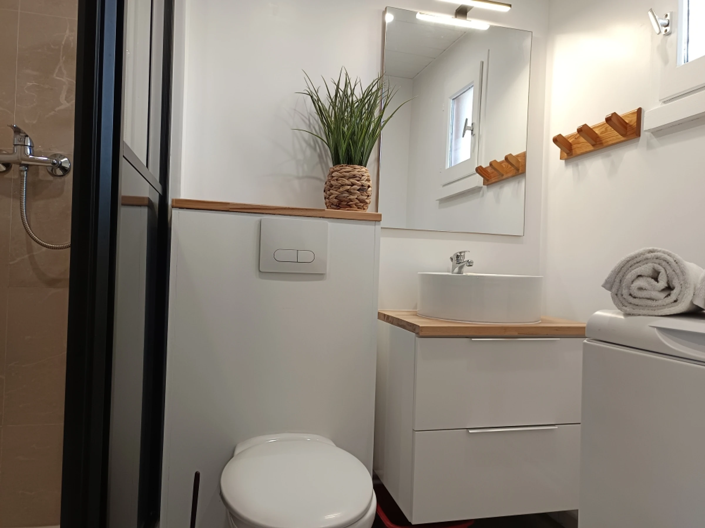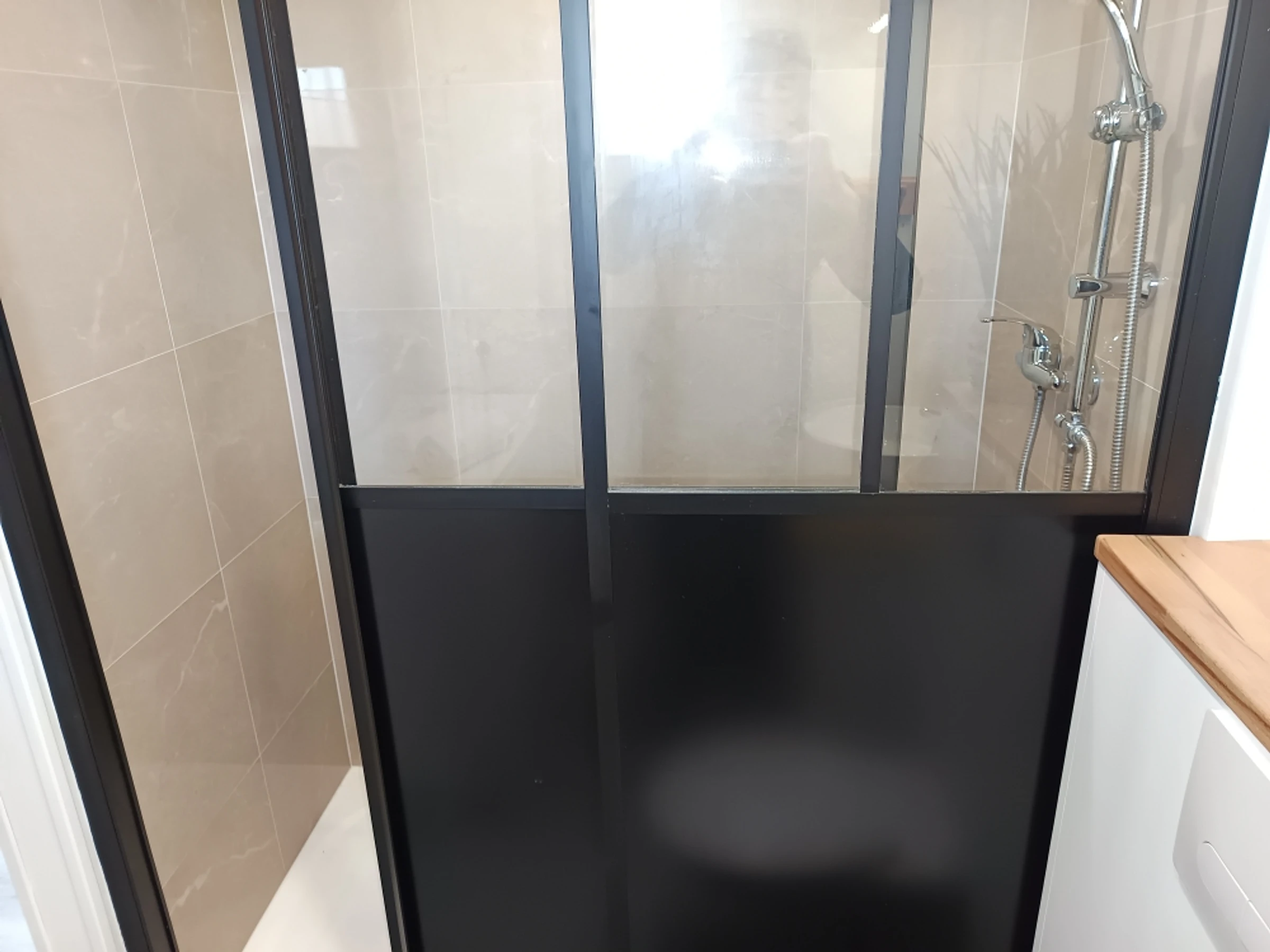 - une salle d'eau élégante avec sa vasque blanche posée sur un meuble, une verrière épurée fait office de pare-douche, lave-linge