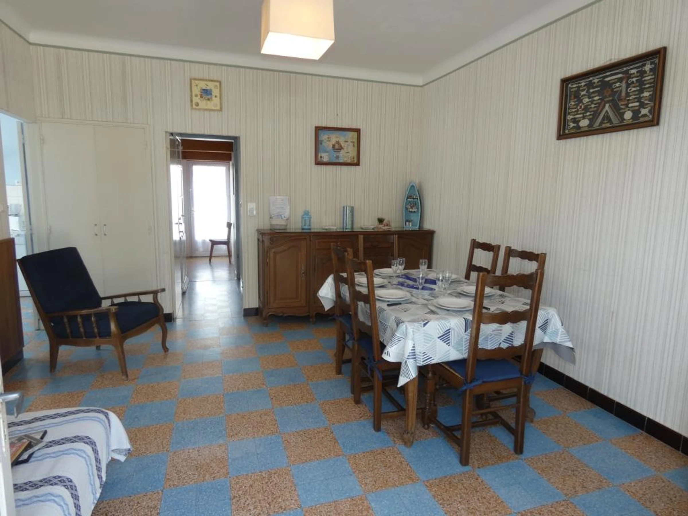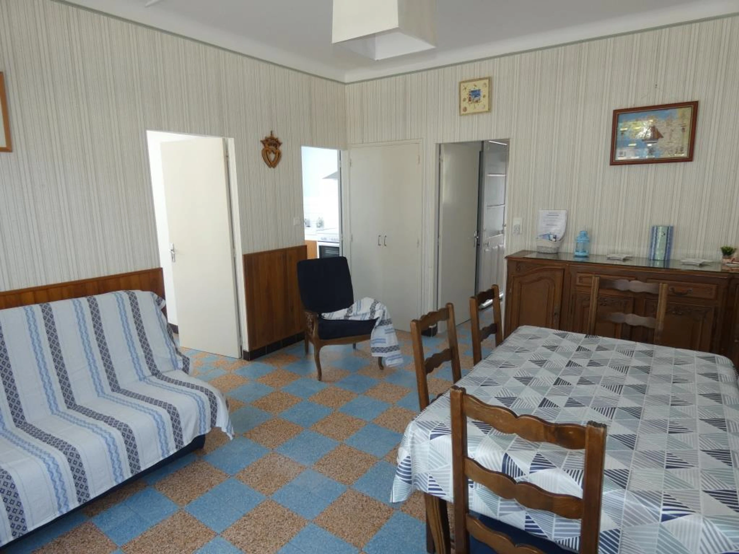 - un séjour : table dinatoire avec chaises, canapé, télévision