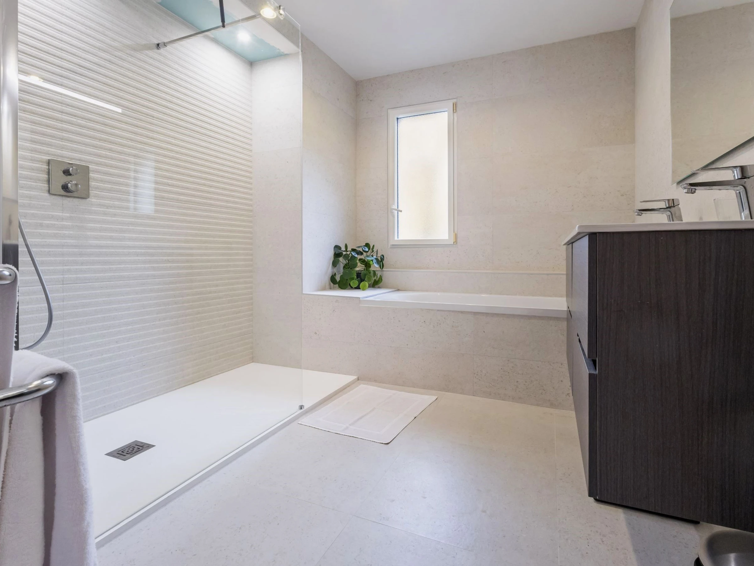 RDC : cuisine aménagée séparée ouverte sur séjour/salon avec cheminée centrale ouverte, 2 chambres (chacune avec 2 lits 90x200 jumelables), salle de bains (douche + baignoire), bureau avec vélo elliptique et banc de musculation et WC indépendant.