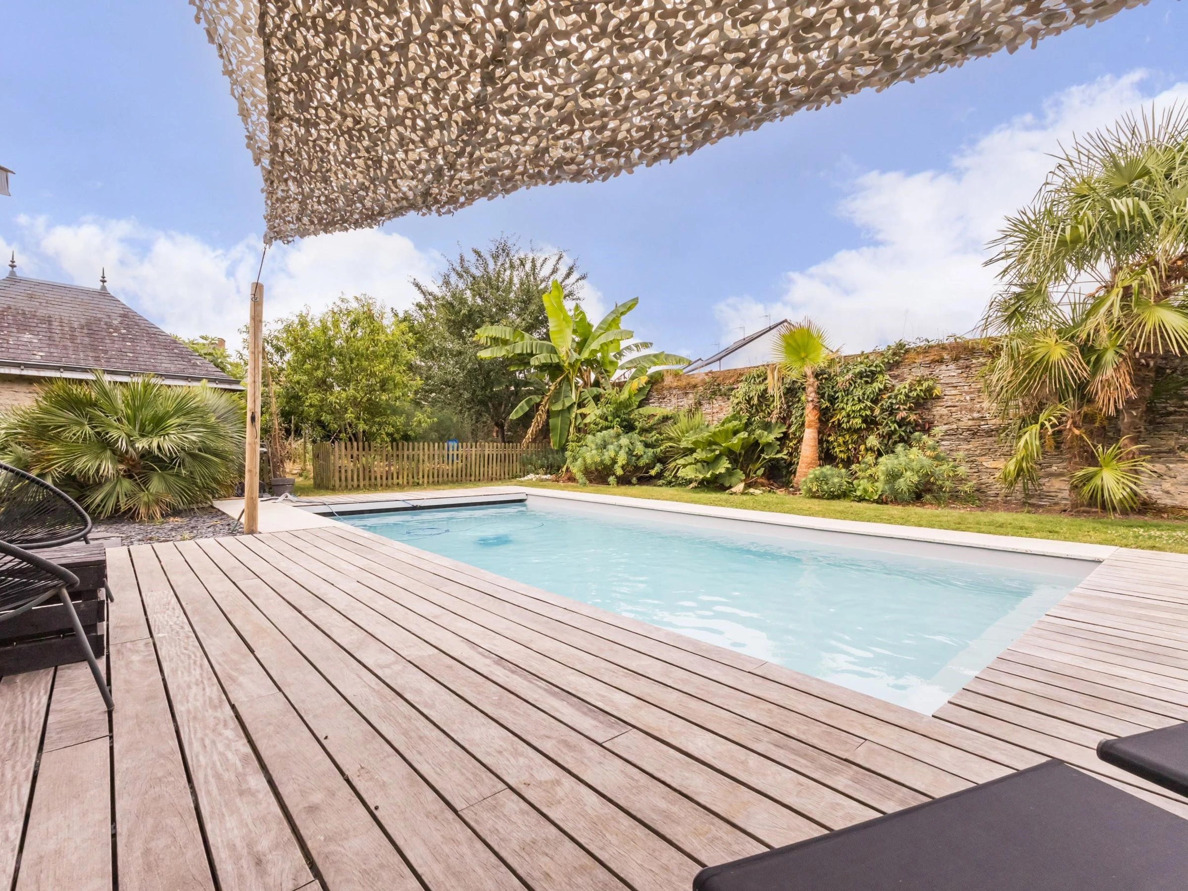 Terrasse plein sud aménagée et ombragée, et charmant jardin arboré clos d'environ 1700 m², avec piscine privative chauffée (9x4m - accessible d'environ mai à octobre), et terrain de pétanque.