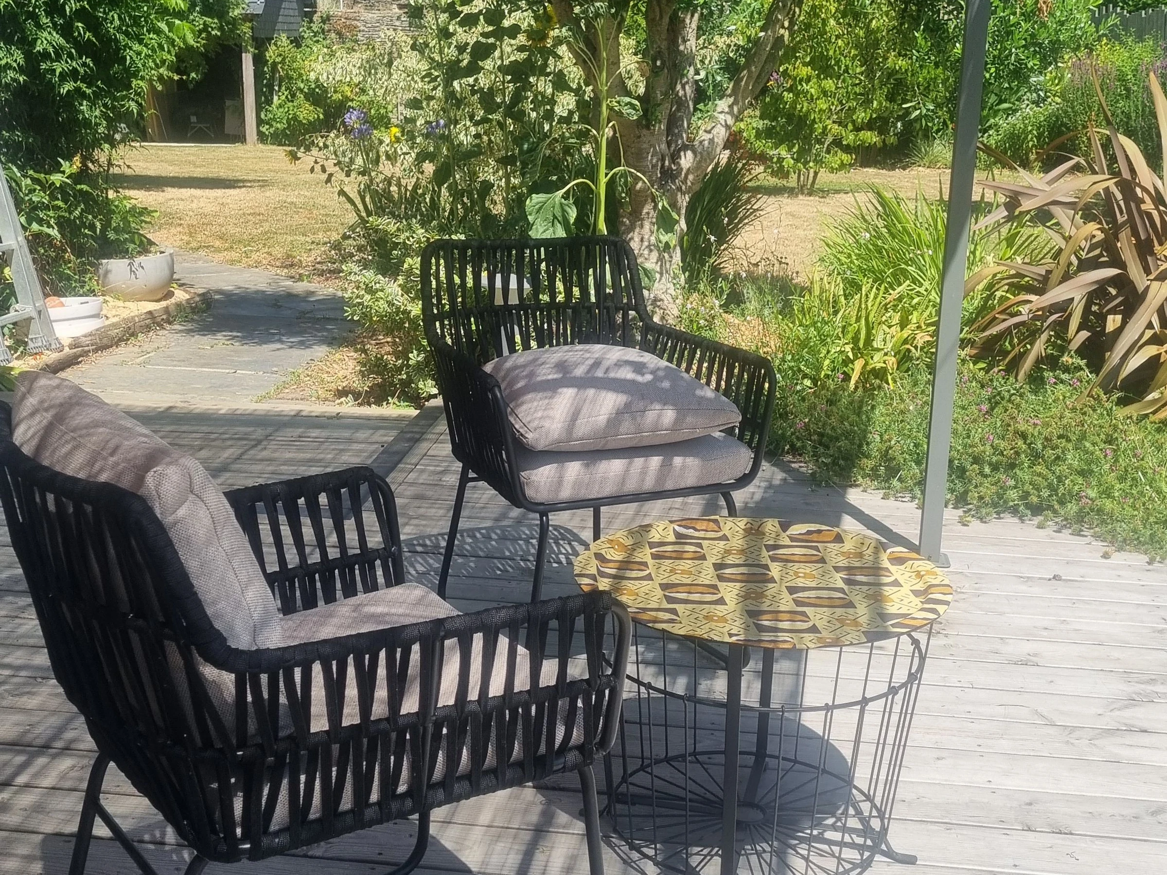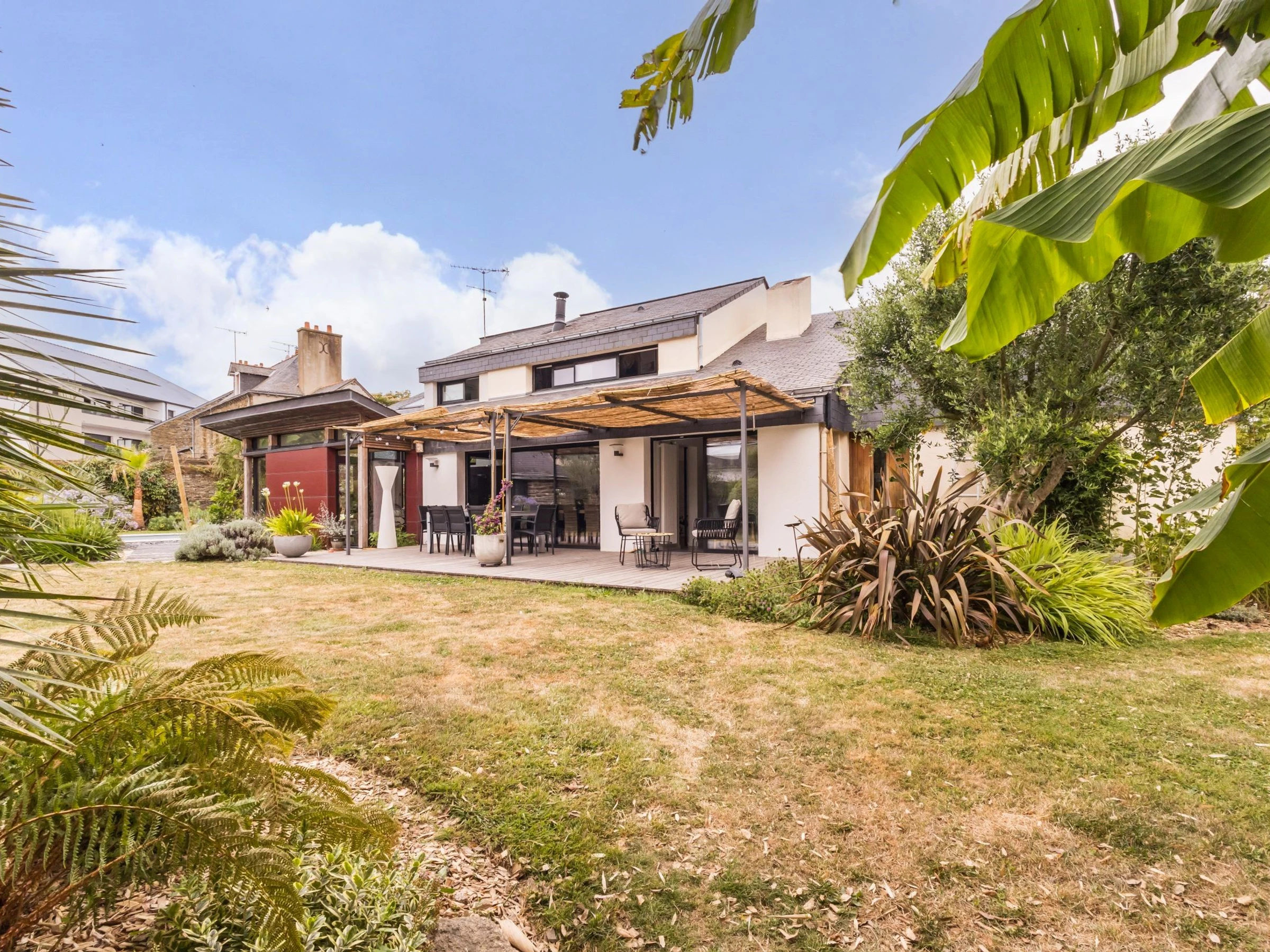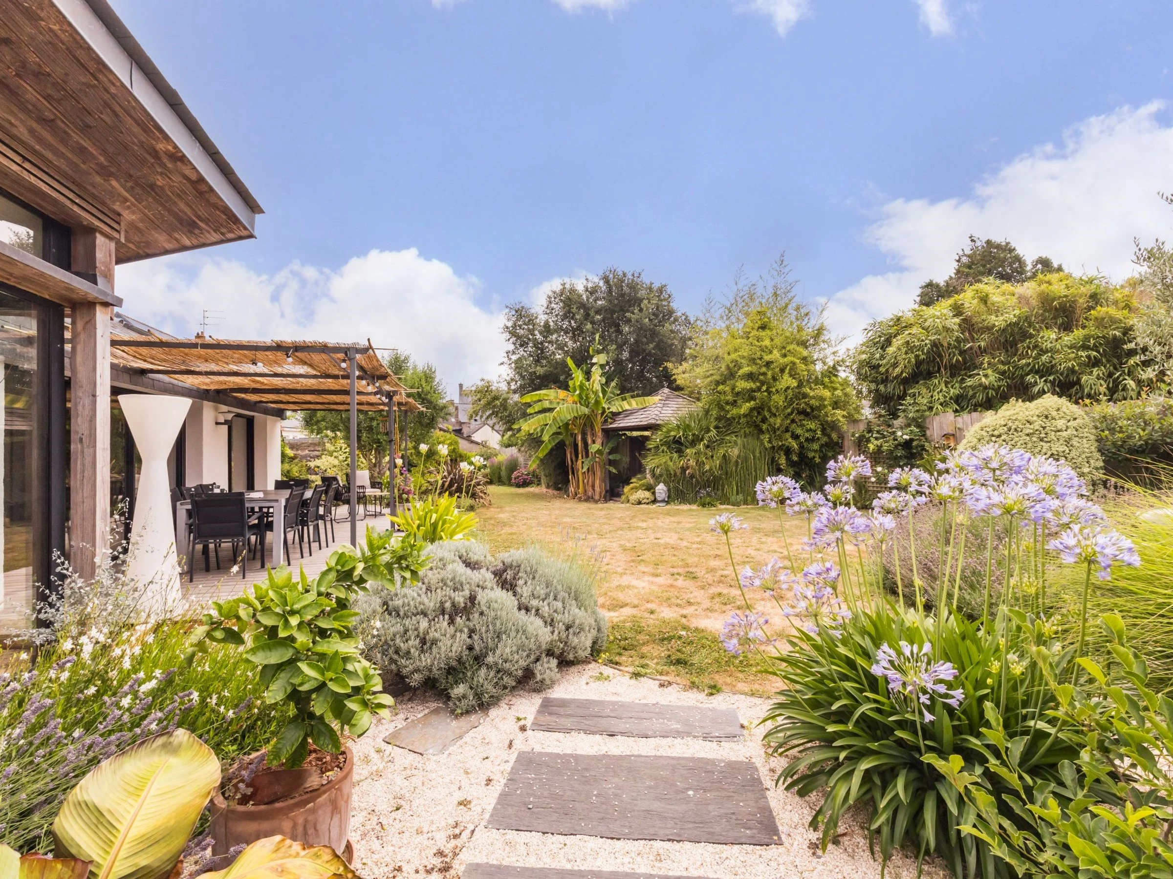 Terrasse plein sud aménagée et ombragée, et charmant jardin arboré clos d'environ 1700 m², avec piscine privative chauffée (9x4m - accessible d'environ mai à octobre), et terrain de pétanque.