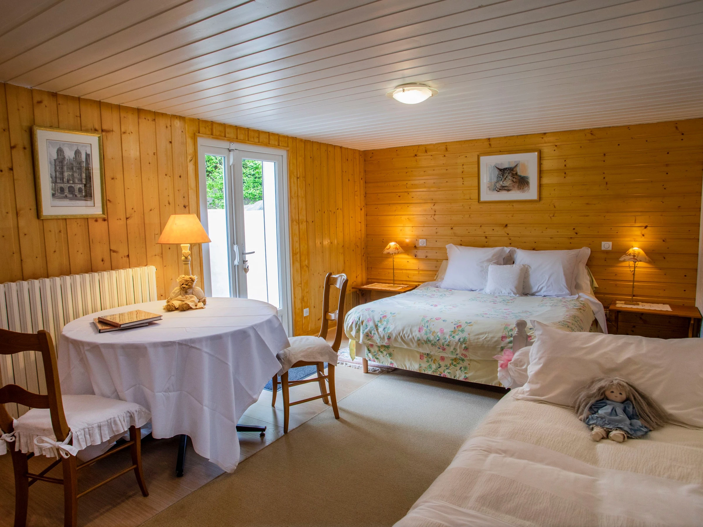 Chambre pour 4 personnes, accessible depuis le jardin, en souplex. Elle est dotée d'un lit 160x200cm et de deux lits 90x190cm. Salle d'eau privative avec WC.