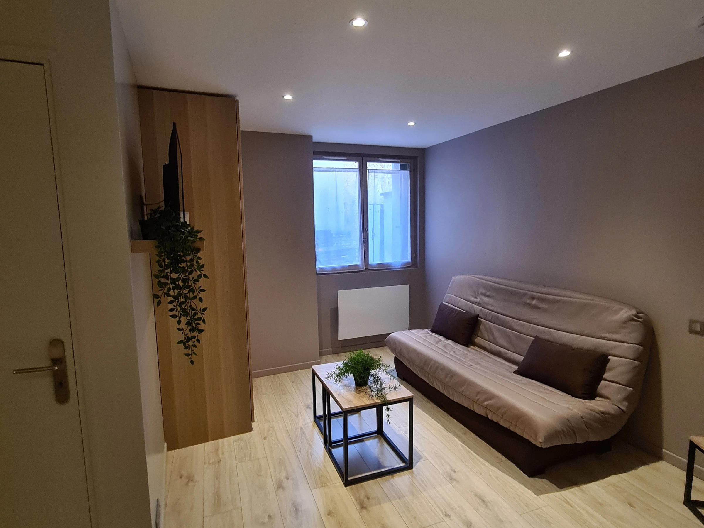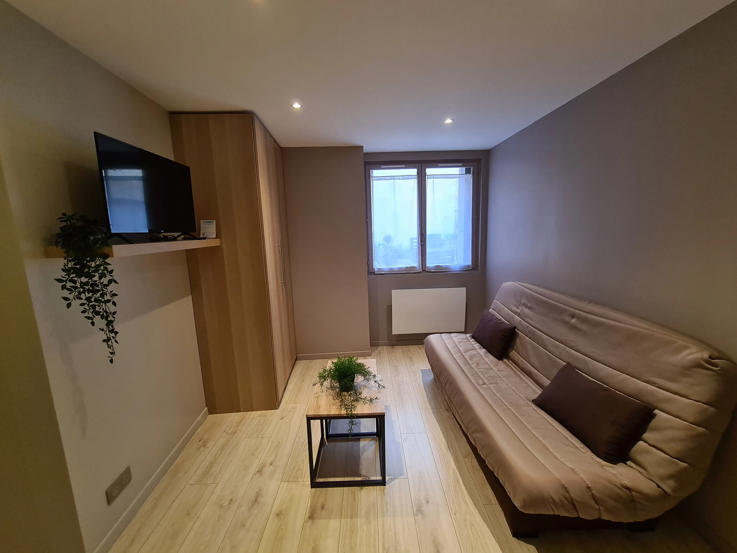 Coin salon avec un canapé convertible (130x190), une table basse, un chevet, une TV et un dressing.