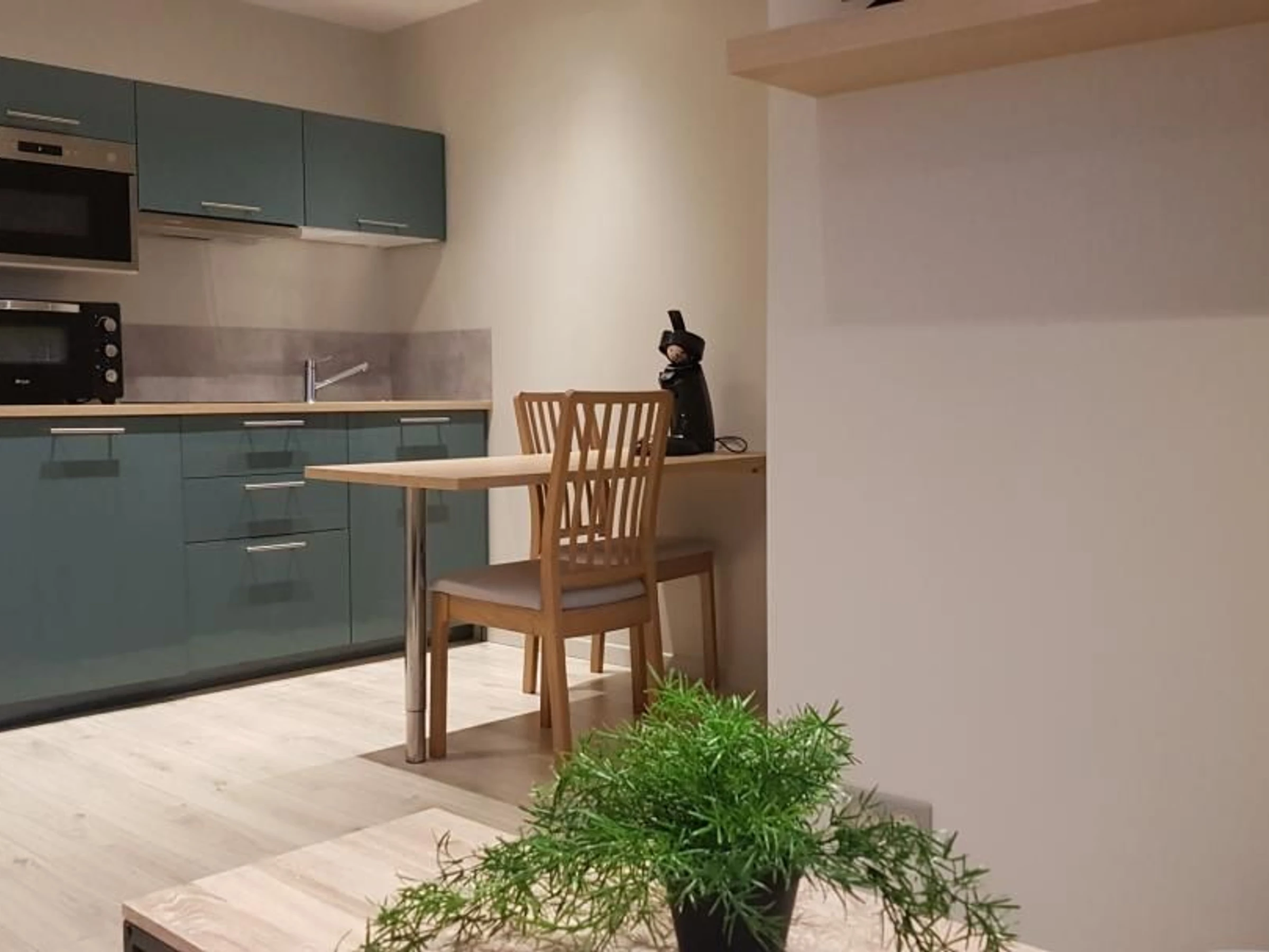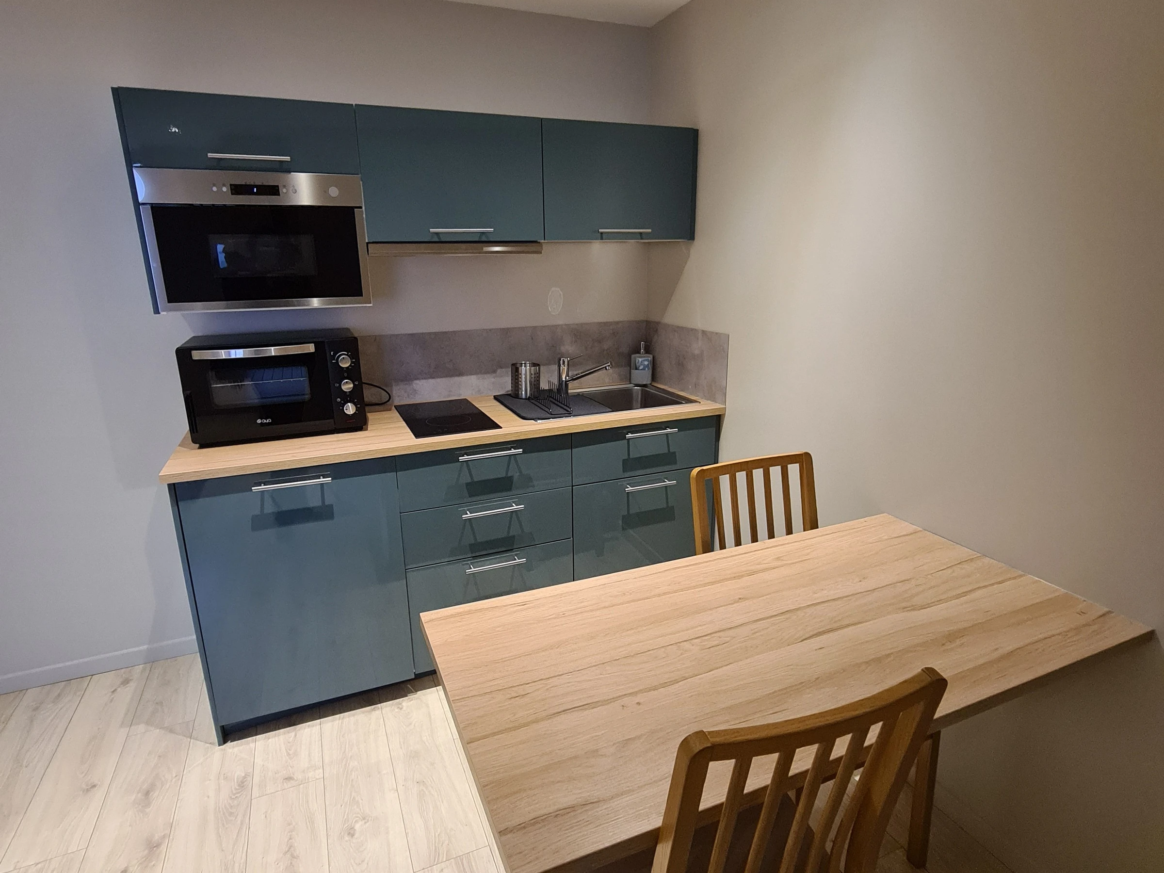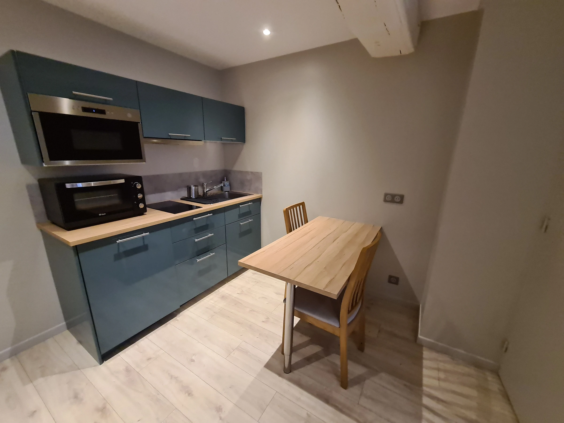 Cuisine aménagée et équipée, coin repas avec table et chaises.