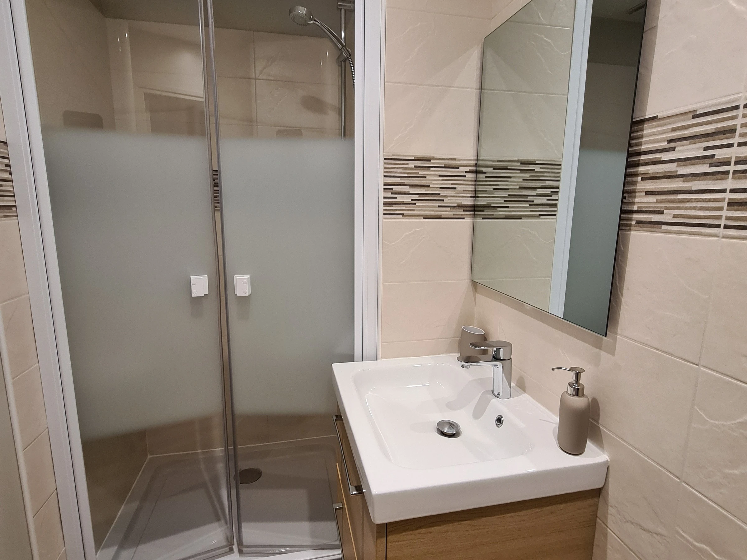 Salle de bain avec douche, vasque et WC.