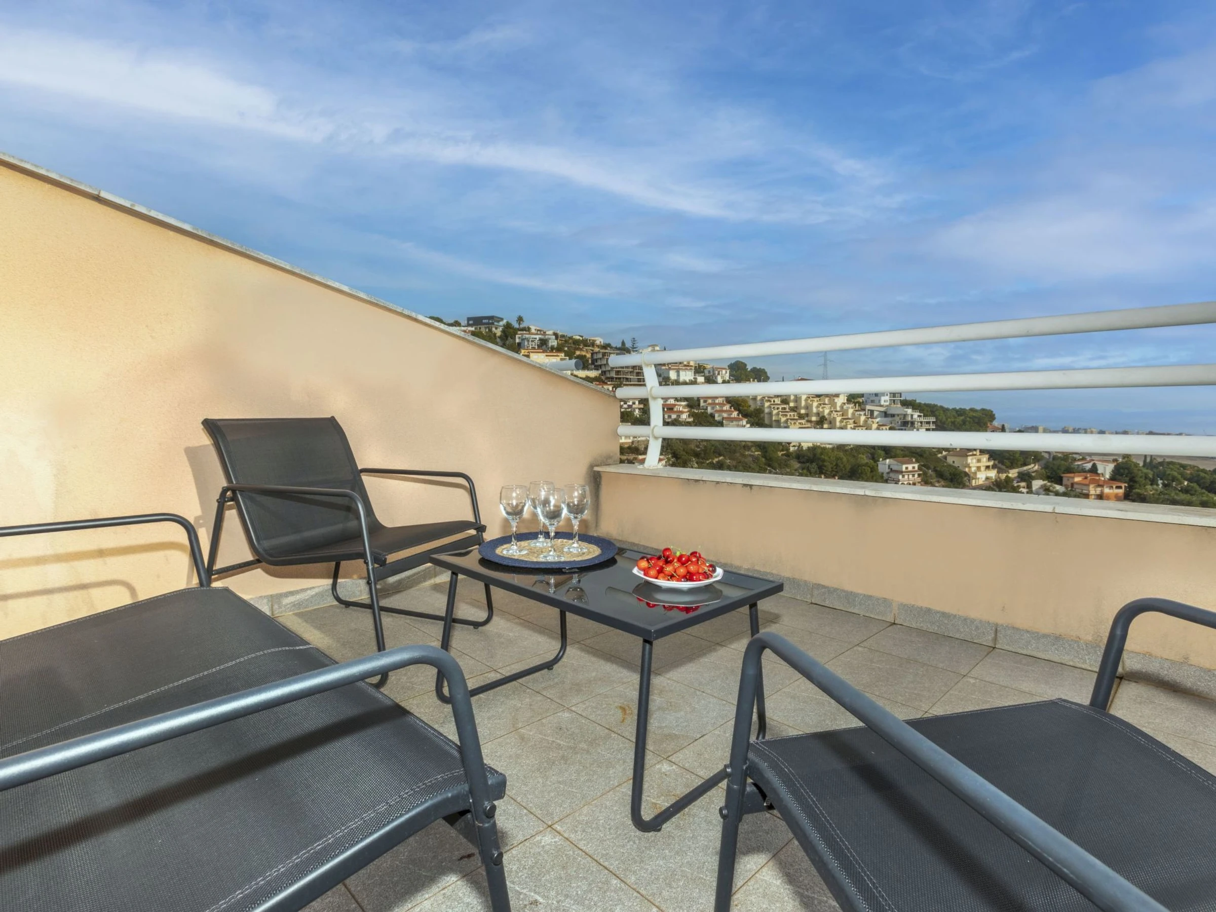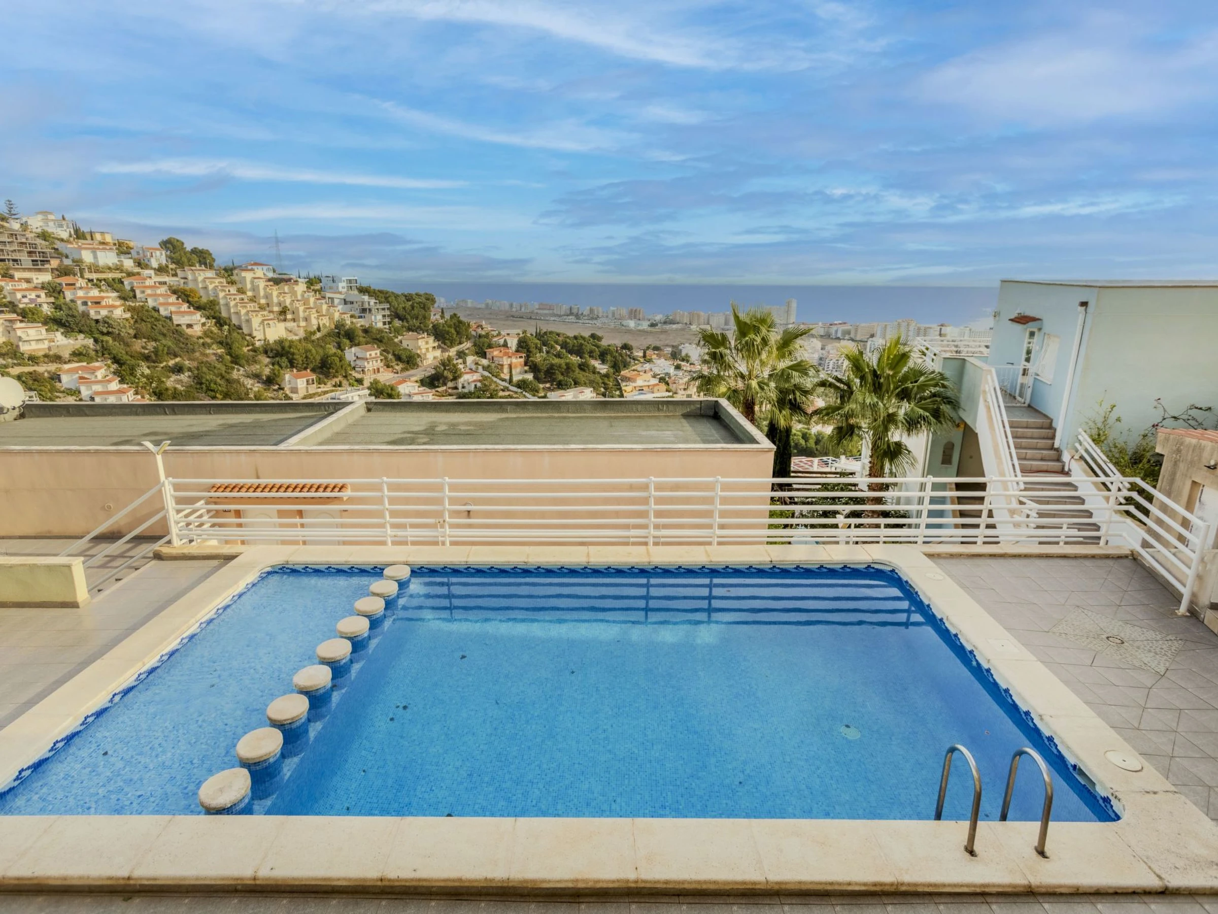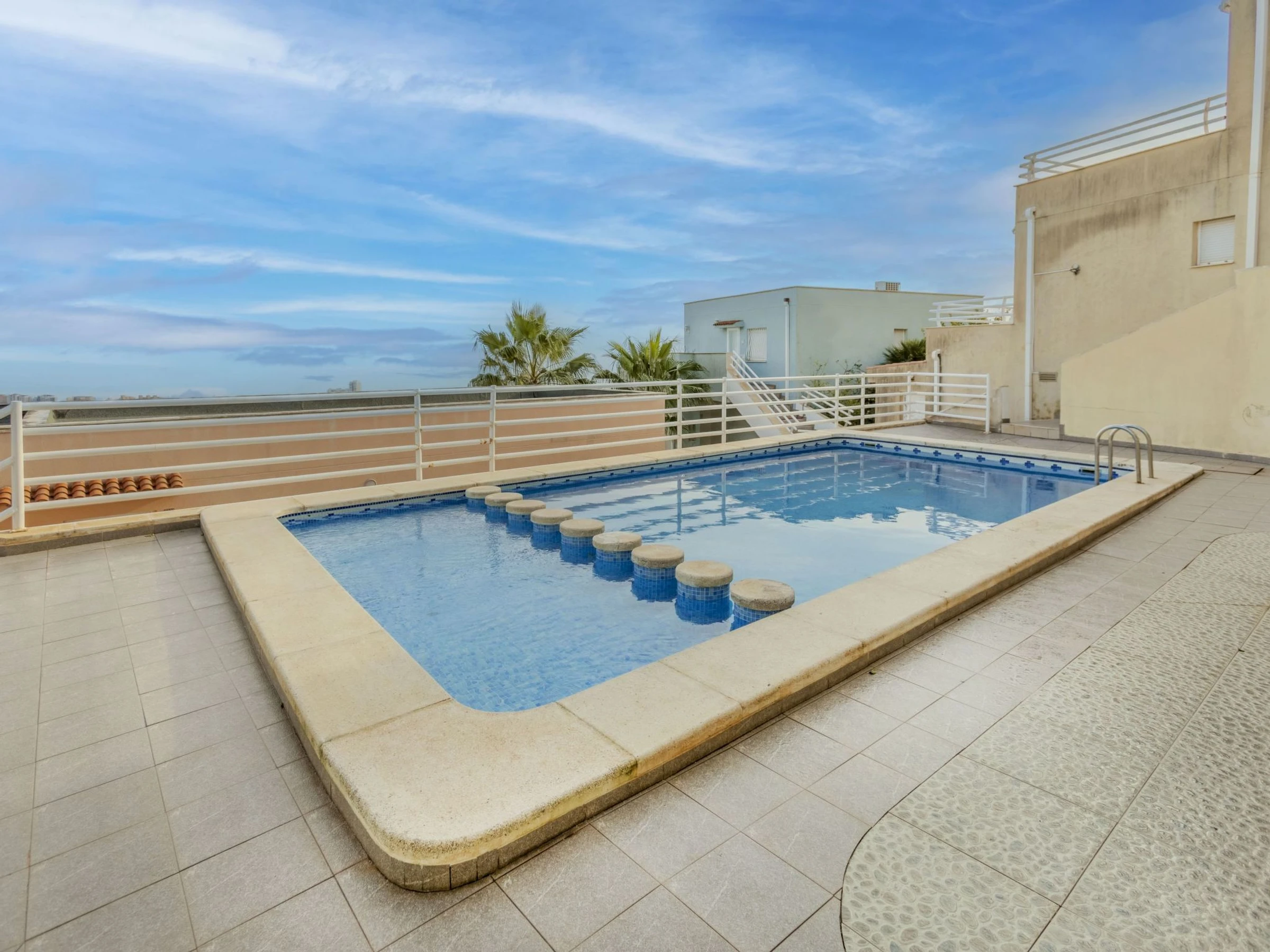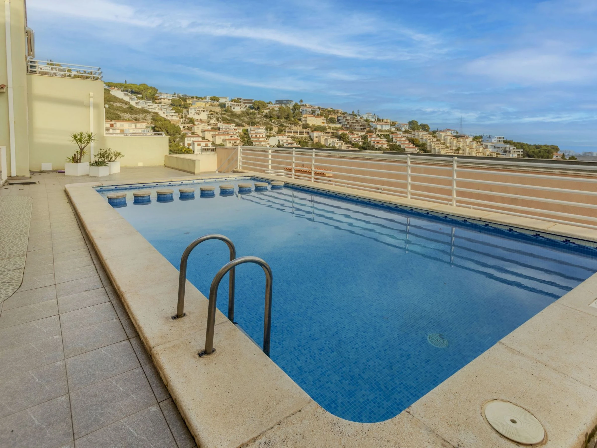 Atalayas: Petite résidence "Montemar II". 9 appartements dans la résidence. Dans la localité, à 1.5 km du centre de Peñiscola, situation tranquille sur une colline, quartier résidentiel, à 2 km de la mer, à 2 km de la plage. En commun: piscine rectangulaire (8 x 4 m, profondeur 30 - 190 cm, disponibilité saisonnière: [hidden] - [hidden] horaires d'ouverture de la piscine: 10:00-14:00 et 16:00-21:00). Bassin pour les enfants, douche extérieure. Sentier en escalier (70 marches) jusqu'à la maison. Place de parking. Supermarché 2 km, centre commercial 8.5 km, restaurant 1.8 km, bar 1.8 km, location de bicyclettes 2.5 km, arrêt de bus "Plaza Constitución" 2 km, gare ferroviaire "Benicarló-Peñíscola" 10 km, plage de sable "Playa Sur-Playa Norte" 2 km. Terrain de golf (18 trous) 35 km. Attractions à proximité: Castillo de Peñiscola 3.5 km, Laberinto Peñiscola (más grande España) 8 km, Morella 76 km, Ciutat des Arts i les Ciències 145 km, Delta del Ebro 45 km, Port Aventura 122 km. Région de randonnées: Parque Natural Sierra d'Irta 5 km. Veuillez noter: voiture recommandée, sans ascenseur. Groupes de jeunes sur demande seulement. Environnement très sensible au bruit. Silence et bonne tenue exigés.