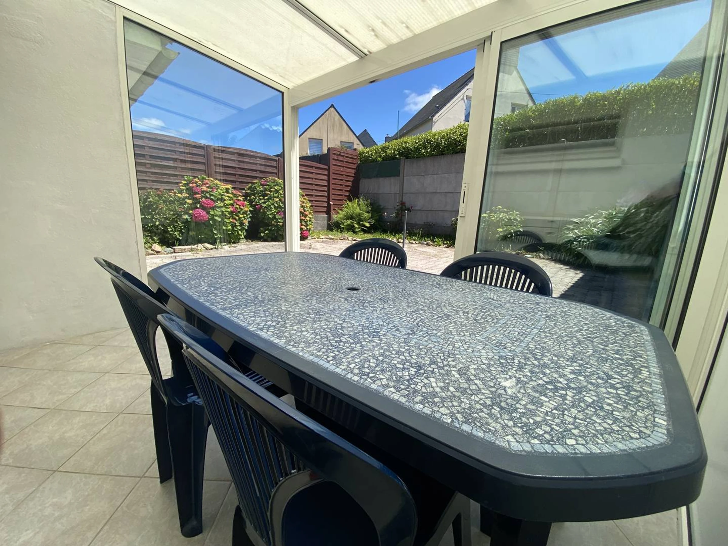 1 véranda exposée Sud donnant sur une terrasse fermée, très abritée -