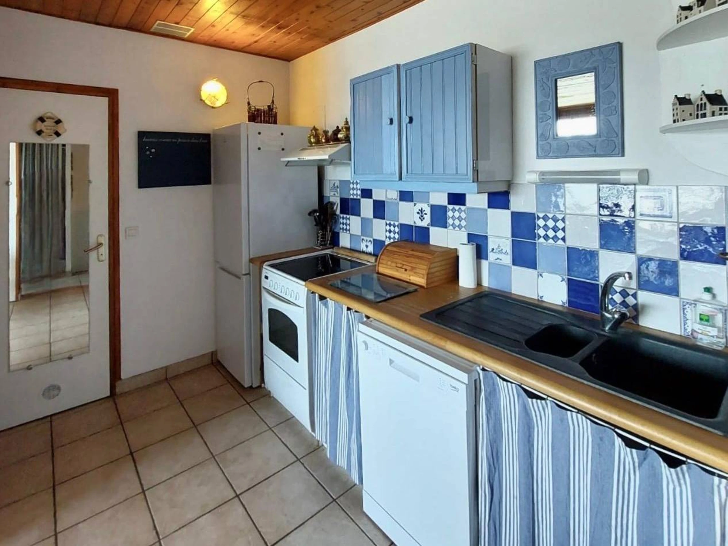 Cuisine : lave-vaisselle, réfrigérateur-congélateur, four, micro-ondes, plaque de cuisson, cafetière, bouilloire, grille-pain.