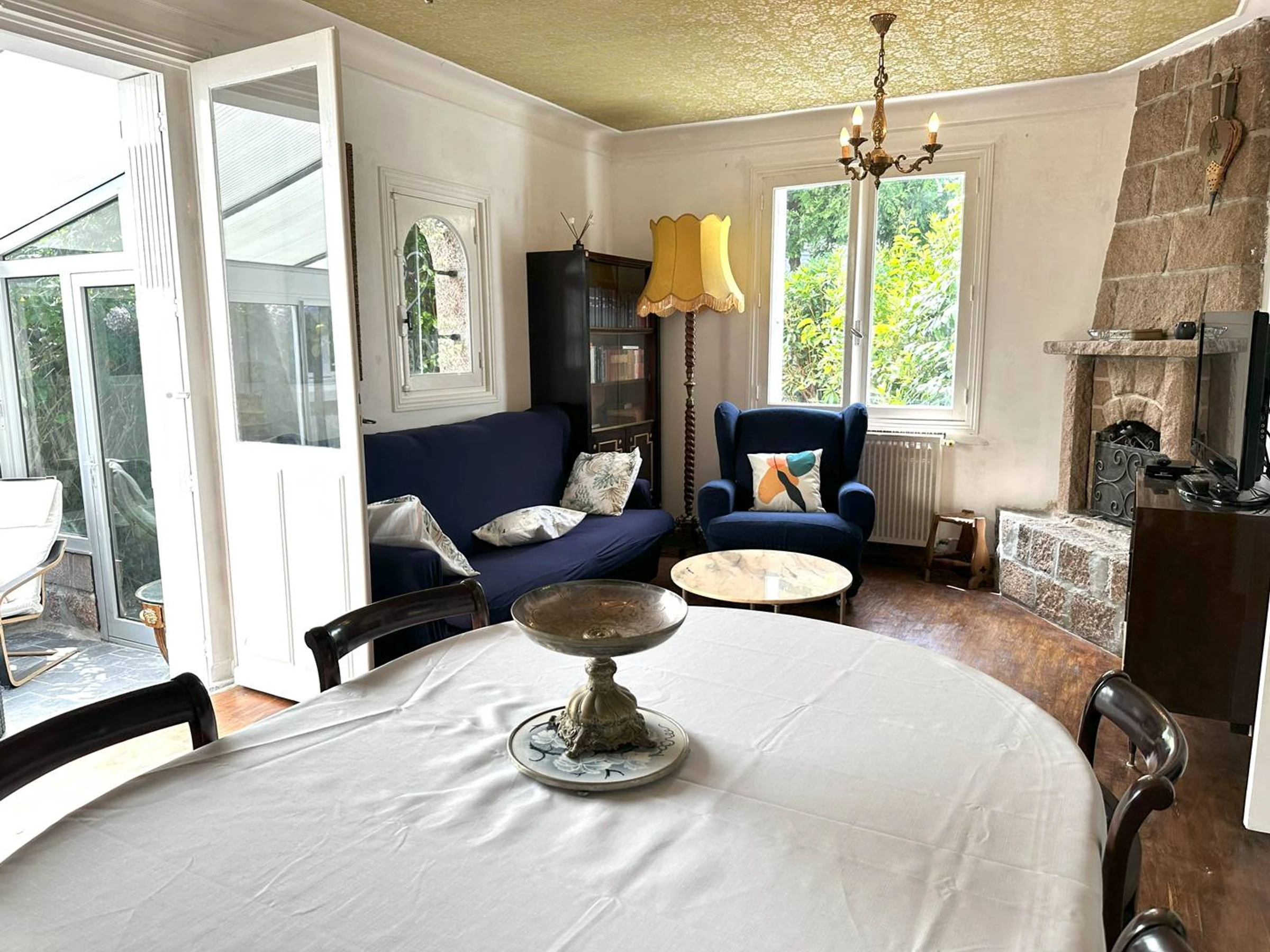 1 salon/salle à manger avec canapé, TV, cheminée décorative, donnant sur une véranda exposée Sud avec mobilier de salon -